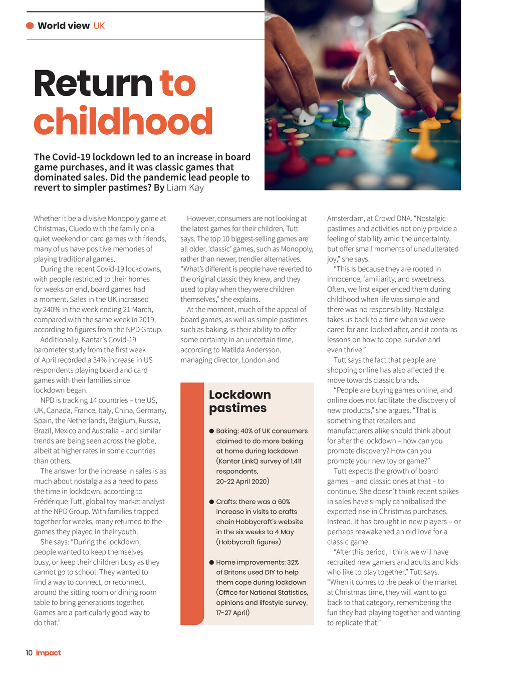World view UK Return to childhood The Covid-19 lockdown led to an increase in board game purchases, and it was classic games that dominated sales. Did the pandemic lead people to revert to simpler pastimes? By Liam Kay Whether it be a divisive Monopoly game at Christmas, Cluedo with the family on a quiet weekend or card games with friends, many of us have positive memories of playing traditional games. During the recent Covid-19 lockdowns, with people restricted to their homes for weeks on end, board games had a moment. Sales in the UK increased by 240% in the week ending 21 March, compared with the same week in 2019, according to figures from the NPD Group. Additionally, Kantars Covid-19 barometer study from the first week of April recorded a 34% increase in US respondents playing board and card games with their families since lockdown began. NPD is tracking 14 countries the US, UK, Canada, France, Italy, China, Germany, Spain, the Netherlands, Belgium, Russia, Brazil, Mexico and Australia and similar trends are being seen across the globe, albeit at higher rates in some countries than others. The answer for the increase in sales is as much about nostalgia as a need to pass the time in lockdown, according to Frdrique Tutt, global toy market analyst at the NPD Group. With families trapped together for weeks, many returned to the games they played in their youth. She says: During the lockdown, people wanted to keep themselves busy, or keep their children busy as they cannot go to school. They wanted to find a way to connect, or reconnect, around the sitting room or dining room table to bring generations together. Games are a particularly good way to do that. 10 However, consumers are not looking at the latest games for their children, Tutt says. The top 10 biggest-selling games are all older, classic games, such as Monopoly, rather than newer, trendier alternatives. Whats different is people have reverted to the original classic they knew, and they used to play when they were children themselves, she explains. At the moment, much of the appeal of board games, as well as simple pastimes such as baking, is their ability to offer some certainty in an uncertain time, according to Matilda Andersson, managing director, London and Lockdown pastimes Baking: 40% of UK consumers claimed to do more baking at home during lockdown (Kantar LinkQ survey of 1,411 respondents, 20-22 April 2020) Crafts: there was a 60% increase in visits to crafts chain Hobbycrafts website in the six weeks to 4 May (Hobbycraft figures) Home improvements: 32% of Britons used DIY to help them cope during lockdown (Office for National Statistics, opinions and lifestyle survey, 17-27 April) Amsterdam, at Crowd DNA. Nostalgic pastimes and activities not only provide a feeling of stability amid the uncertainty, but offer small moments of unadulterated joy, she says. This is because they are rooted in innocence, familiarity, and sweetness. Often, we first experienced them during childhood when life was simple and there was no responsibility. Nostalgia takes us back to a time when we were cared for and looked after, and it contains lessons on how to cope, survive and even thrive. Tutt says the fact that people are shopping online has also affected the move towards classic brands. People are buying games online, and online does not facilitate the discovery of new products, she argues. That is something that retailers and manufacturers alike should think about for after the lockdown how can you promote discovery? How can you promote your new toy or game? Tutt expects the growth of board games and classic ones at that to continue. She doesnt think recent spikes in sales have simply cannibalised the expected rise in Christmas purchases. Instead, it has brought in new players or perhaps reawakened an old love for a classic game. After this period, I think we will have recruited new gamers and adults and kids who like to play together, Tutt says. When it comes to the peak of the market at Christmas time, they will want to go back to that category, remembering the fun they had playing together and wanting to replicate that.