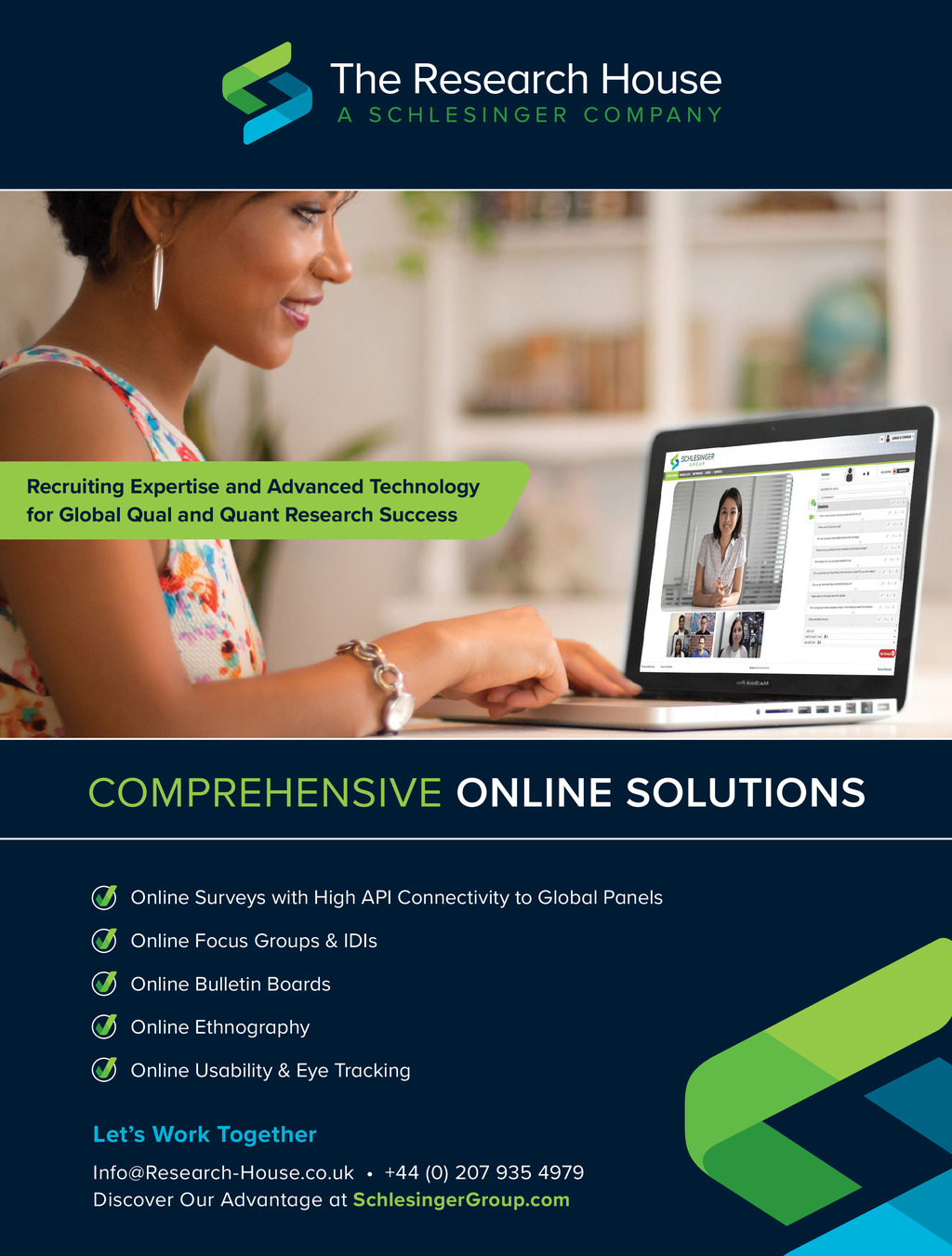 Recruiting Expertise and Advanced Technology for Global Qual and Quant Research Success COMPREHENSIVE ONLINE SOLUTIONS Online Surveys with High API Connectivity to Global Panels Online Focus Groups & IDIs Online Bulletin Boards Online Ethnography Online Usability & Eye Tracking Lets Work Together Info@Research-House.co.uk +44 (0) 207 935 4979 Discover Our Advantage at SchlesingerGroup.com