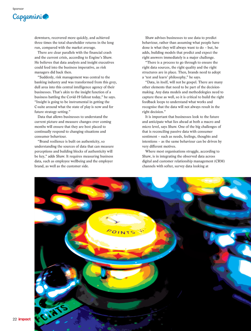 Sponsor downturn, recovered more quickly, and achieved three times the total shareholder returns in the long run, compared with the market average. There are clear parallels with the financial crash and the current crisis, according to Engines Shaw. He believes that data analysts and insight executives could feed into the business imperative, as risk managers did back then. Suddenly, risk management was central to the banking industry and was transformed from this grey, dull area into this central intelligence agency of their businesses. Thats akin to the insight function of a business battling the Covid-19 fallout today, he says. Insight is going to be instrumental in getting the C-suite around what the state of play is now and for future strategy setting. Data that allows businesses to understand the current picture and measure changes over coming months will ensure that they are best placed to continually respond to changing situations and consumer behaviour. Brand resilience is built on authenticity, so understanding the sources of data that can measure perceptions and building blocks of authenticity will be key, adds Shaw. It requires measuring business data, such as employee wellbeing and the employer brand, as well as the customer side. 22 Shaw advises businesses to use data to predict behaviour, rather than assuming what people have done is what they will always want to do but, he adds, building models that predict and expect the right answers immediately is a major challenge. There is a process to go through to ensure the right data sources, the right quality and the right structures are in place. Then, brands need to adopt a test and learn philosophy, he says. Data, in itself, will not be gospel. There are many other elements that need to be part of the decisionmaking. Any data models and methodologies need to capture these as well, so it is critical to build the right feedback loops to understand what works and recognise that the data will not always result in the right decision. It is important that businesses look to the future and anticipate what lies ahead at both a macro and micro level, says Shaw. One of the big challenges of that is reconciling passive data with consumer sentiment such as needs, feelings, thoughts and intentions as the same behaviour can be driven by very different motives. Where most organisations struggle, according to Shaw, is in integrating the observed data across digital and customer relationship management (CRM) channels with softer, survey data looking at
