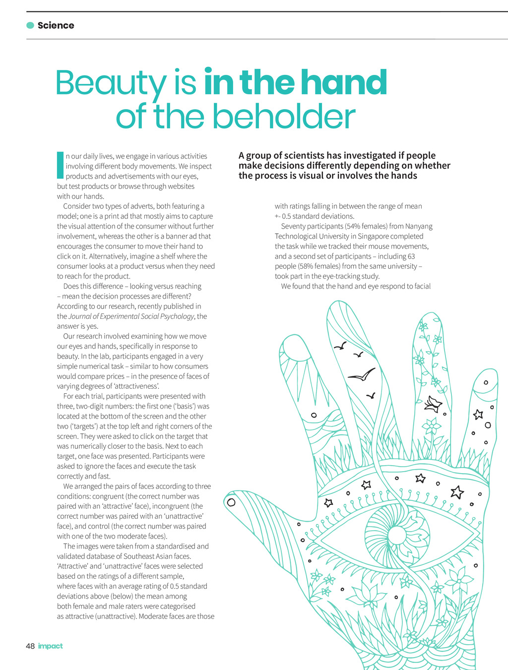 Science Beauty is in the hand of the beholder I n our daily lives, we engage in various activities involving different body movements. We inspect products and advertisements with our eyes, but test products or browse through websites with our hands. Consider two types of adverts, both featuring a model; one is a print ad that mostly aims to capture the visual attention of the consumer without further involvement, whereas the other is a banner ad that encourages the consumer to move their hand to click on it. Alternatively, imagine a shelf where the consumer looks at a product versus when they need to reach for the product. Does this difference looking versus reaching mean the decision processes are different? According to our research, recently published in the Journal of Experimental Social Psychology, the answer is yes. Our research involved examining how we move our eyes and hands, specifically in response to beauty. In the lab, participants engaged in a very simple numerical task similar to how consumers would compare prices in the presence of faces of varying degrees of attractiveness. For each trial, participants were presented with three, two-digit numbers: the first one (basis) was located at the bottom of the screen and the other two (targets) at the top left and right corners of the screen. They were asked to click on the target that was numerically closer to the basis. Next to each target, one face was presented. Participants were asked to ignore the faces and execute the task correctly and fast. We arranged the pairs of faces according to three conditions: congruent (the correct number was paired with an attractive face), incongruent (the correct number was paired with an unattractive face), and control (the correct number was paired with one of the two moderate faces). The images were taken from a standardised and validated database of Southeast Asian faces. Attractive and unattractive faces were selected based on the ratings of a different sample, where faces with an average rating of 0.5 standard deviations above (below) the mean among both female and male raters were categorised as attractive (unattractive). Moderate faces are those 48 A group of scientists has investigated if people make decisions differently depending on whether the process is visual or involves the hands with ratings falling in between the range of mean +- 0.5 standard deviations. Seventy participants (54% females) from Nanyang Technological University in Singapore completed the task while we tracked their mouse movements, and a second set of participants including 63 people (58% females) from the same university took part in the eye-tracking study. We found that the hand and eye respond to facial