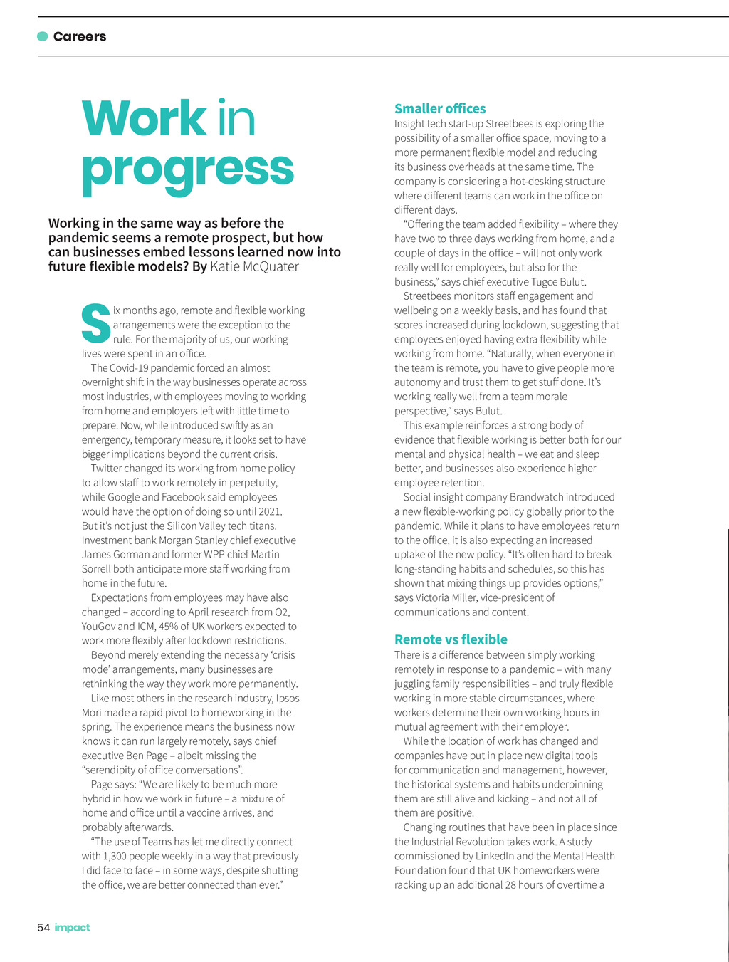 Careers Work in progress Working in the same way as before the pandemic seems a remote prospect, but how can businesses embed lessons learned now into future flexible models? By Katie McQuater S ix months ago, remote and flexible working arrangements were the exception to the rule. For the majority of us, our working lives were spent in an office. The Covid-19 pandemic forced an almost overnight shift in the way businesses operate across most industries, with employees moving to working from home and employers left with little time to prepare. Now, while introduced swiftly as an emergency, temporary measure, it looks set to have bigger implications beyond the current crisis. Twitter changed its working from home policy to allow staff to work remotely in perpetuity, while Google and Facebook said employees would have the option of doing so until 2021. But its not just the Silicon Valley tech titans. Investment bank Morgan Stanley chief executive James Gorman and former WPP chief Martin Sorrell both anticipate more staff working from home in the future. Expectations from employees may have also changed according to April research from O2, YouGov and ICM, 45% of UK workers expected to work more flexibly after lockdown restrictions. Beyond merely extending the necessary crisis mode arrangements, many businesses are rethinking the way they work more permanently. Like most others in the research industry, Ipsos Mori made a rapid pivot to homeworking in the spring. The experience means the business now knows it can run largely remotely, says chief executive Ben Page albeit missing the serendipity of office conversations. Page says: We are likely to be much more hybrid in how we work in future a mixture of home and office until a vaccine arrives, and probably afterwards. The use of Teams has let me directly connect with 1,300 people weekly in a way that previously I did face to face in some ways, despite shutting the office, we are better connected than ever. 54 Smaller offices Insight tech start-up Streetbees is exploring the possibility of a smaller office space, moving to a more permanent flexible model and reducing its business overheads at the same time. The company is considering a hot-desking structure where different teams can work in the office on different days. Offering the team added flexibility where they have two to three days working from home, and a couple of days in the office will not only work really well for employees, but also for the business, says chief executive Tugce Bulut. Streetbees monitors staff engagement and wellbeing on a weekly basis, and has found that scores increased during lockdown, suggesting that employees enjoyed having extra flexibility while working from home. Naturally, when everyone in the team is remote, you have to give people more autonomy and trust them to get stuff done. Its working really well from a team morale perspective, says Bulut. This example reinforces a strong body of evidence that flexible working is better both for our mental and physical health we eat and sleep better, and businesses also experience higher employee retention. Social insight company Brandwatch introduced a new flexible-working policy globally prior to the pandemic. While it plans to have employees return to the office, it is also expecting an increased uptake of the new policy. Its often hard to break long-standing habits and schedules, so this has shown that mixing things up provides options, says Victoria Miller, vice-president of communications and content. Remote vs flexible There is a difference between simply working remotely in response to a pandemic with many juggling family responsibilities and truly flexible working in more stable circumstances, where workers determine their own working hours in mutual agreement with their employer. While the location of work has changed and companies have put in place new digital tools for communication and management, however, the historical systems and habits underpinning them are still alive and kicking and not all of them are positive. Changing routines that have been in place since the Industrial Revolution takes work. A study commissioned by LinkedIn and the Mental Health Foundation found that UK homeworkers were racking up an additional 28 hours of overtime a