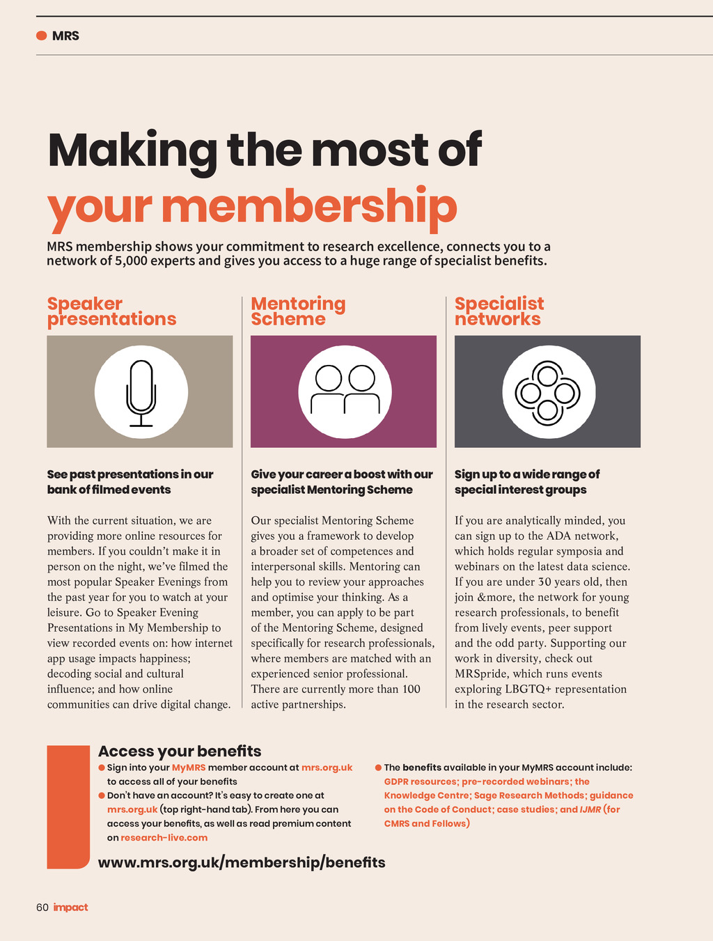 MRS Making the most of your membership MRS membership shows your commitment to research excellence, connects you to a network of 5,000 experts and gives you access to a huge range of specialist benefits. Speaker presentations Mentoring Scheme Specialist networks See past presentations in our bank of filmed events Give your career a boost with our specialist Mentoring Scheme Sign up to a wide range of special interest groups With the current situation, we are providing more online resources for members. If you couldnt make it in person on the night, weve filmed the most popular Speaker Evenings from the past year for you to watch at your leisure. Go to Speaker Evening Presentations in My Membership to view recorded events on: how internet app usage impacts happiness; decoding social and cultural influence; and how online communities can drive digital change. Our specialist Mentoring Scheme gives you a framework to develop a broader set of competences and interpersonal skills. Mentoring can help you to review your approaches and optimise your thinking. As a member, you can apply to be part of the Mentoring Scheme, designed specifically for research professionals, where members are matched with an experienced senior professional. There are currently more than 100 active partnerships. If you are analytically minded, you can sign up to the ADA network, which holds regular symposia and webinars on the latest data science. If you are under 30 years old, then join &more, the network for young research professionals, to benefit from lively events, peer support and the odd party. Supporting our work in diversity, check out MRSpride, which runs events exploring LBGTQ+ representation in the research sector. Access your benefits Sign into your MyMRS member account at mrs.org.uk to access all of your benefits Dont have an account? Its easy to create one at mrs.org.uk (top right-hand tab). From here you can access your benefits, as well as read premium content on research-live.com T he benefits available in your MyMRS account include: GDPR resources; pre-recorded webinars; the Knowledge Centre; Sage Research Methods; guidance on the Code of Conduct; case studies; and IJMR (for CMRS and Fellows) www.mrs.org.uk/membership/benefits 60