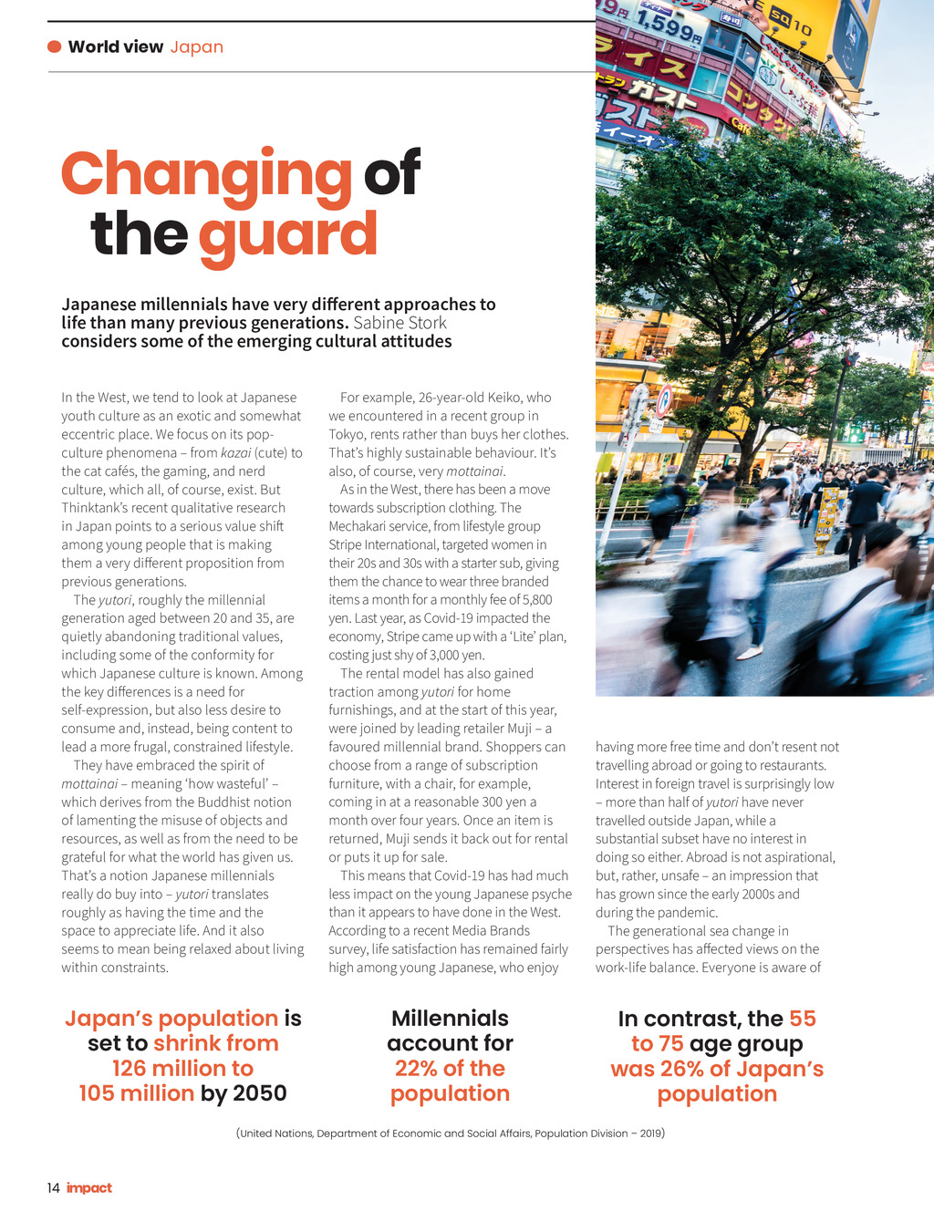 World view Japan Changing of the guard Sabine Stork In the West, we tend to look at Japanese youth culture as an exotic and somewhat eccentric place. We focus on its popculture phenomena from kazai (cute) to the cat cafs, the gaming, and nerd culture, which all, of course, exist. But Thinktanks recent qualitative research in Japan points to a serious value shift among young people that is making them a very different proposition from previous generations. The yutori, roughly the millennial generation aged between 20 and 35, are quietly abandoning traditional values, including some of the conformity for which Japanese culture is known. Among the key differences is a need for self-expression, but also less desire to consume and, instead, being content to lead a more frugal, constrained lifestyle. They have embraced the spirit of mottainai meaning how wasteful which derives from the Buddhist notion of lamenting the misuse of objects and resources, as well as from the need to be grateful for what the world has given us. Thats a notion Japanese millennials really do buy into yutori translates roughly as having the time and the space to appreciate life. And it also seems to mean being relaxed about living within constraints. For example, 26-year-old Keiko, who we encountered in a recent group in Tokyo, rents rather than buys her clothes. Thats highly sustainable behaviour. Its also, of course, very mottainai. As in the West, there has been a move towards subscription clothing. The Mechakari service, from lifestyle group Stripe International, targeted women in their 20s and 30s with a starter sub, giving them the chance to wear three branded items a month for a monthly fee of 5,800 yen. Last year, as Covid-19 impacted the economy, Stripe came up with a Lite plan, costing just shy of 3,000 yen. The rental model has also gained traction among yutori for home furnishings, and at the start of this year, were joined by leading retailer Muji a favoured millennial brand. Shoppers can choose from a range of subscription furniture, with a chair, for example, coming in at a reasonable 300 yen a month over four years. Once an item is returned, Muji sends it back out for rental or puts it up for sale. This means that Covid-19 has had much less impact on the young Japanese psyche than it appears to have done in the West. According to a recent Media Brands survey, life satisfaction has remained fairly high among young Japanese, who enjoy having more free time and dont resent not travelling abroad or going to restaurants. Interest in foreign travel is surprisingly low more than half of yutori have never travelled outside Japan, while a substantial subset have no interest in doing so either. Abroad is not aspirational, but, rather, unsafe an impression that has grown since the early 2000s and during the pandemic. The generational sea change in perspectives has affected views on the work-life balance. Everyone is aware of Japans population is set to shrink from 126 million to 105 million by 2050 Millennials account for 22% of the population In contrast, the 55 to 75 age group was 26% of Japans population (United Nations, Department of Economic and Social Affairs, Population Division 2019) 14 Impact ISSUE 33 2021_pp14-15_Japan.indd 14 26/03/2021 09:52
