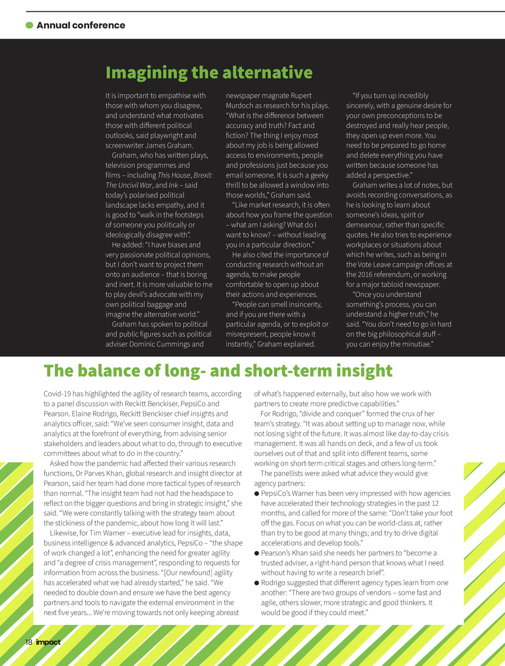 Annual conference Imagining the alternative It is important to empathise with those with whom you disagree, and understand what motivates those with different political outlooks, said playwright and screenwriter James Graham. Graham, who has written plays, television programmes and films including This House, Brexit: The Uncivil War, and Ink said todays polarised political landscape lacks empathy, and it is good to walk in the footsteps of someone you politically or ideologically disagree with. He added: I have biases and very passionate political opinions, but I dont want to project them onto an audience that is boring and inert. It is more valuable to me to play devils advocate with my own political baggage and imagine the alternative world. Graham has spoken to political and public figures such as political adviser Dominic Cummings and newspaper magnate Rupert Murdoch as research for his plays. What is the difference between accuracy and truth? Fact and fiction? The thing I enjoy most about my job is being allowed access to environments, people and professions just because you email someone. It is such a geeky thrill to be allowed a window into those worlds, Graham said. Like market research, it is often about how you frame the question what am I asking? What do I want to know? without leading you in a particular direction. He also cited the importance of conducting research without an agenda, to make people comfortable to open up about their actions and experiences. People can smell insincerity, and if you are there with a particular agenda, or to exploit or misrepresent, people know it instantly, Graham explained. If you turn up incredibly sincerely, with a genuine desire for your own preconceptions to be destroyed and really hear people, they open up even more. You need to be prepared to go home and delete everything you have written because someone has added a perspective. Graham writes a lot of notes, but avoids recording conversations, as he is looking to learn about someones ideas, spirit or demeanour, rather than specific quotes. He also tries to experience workplaces or situations about which he writes, such as being in the Vote Leave campaign offices at the 2016 referendum, or working for a major tabloid newspaper. Once you understand somethings process, you can understand a higher truth, he said. You dont need to go in hard on the big philosophical stuff you can enjoy the minutiae. The balance of long- and short-term insight Covid-19 has highlighted the agility of research teams, according to a panel discussion with Reckitt Benckiser, PepsiCo and Pearson. Elaine Rodrigo, Reckitt Benckiser chief insights and analytics officer, said: Weve seen consumer insight, data and analytics at the forefront of everything, from advising senior stakeholders and leaders about what to do, through to executive committees about what to do in the country. Asked how the pandemic had affected their various research functions, Dr Parves Khan, global research and insight director at Pearson, said her team had done more tactical types of research than normal. The insight team had not had the headspace to reflect on the bigger questions and bring in strategic insight, she said. We were constantly talking with the strategy team about the stickiness of the pandemic, about how long it will last. Likewise, for Tim Warner executive lead for insights, data, business intelligence & advanced analytics, PepsiCo the shape of work changed a lot, enhancing the need for greater agility and a degree of crisis management, responding to requests for information from across the business. [Our newfound] agility has accelerated what we had already started, he said. We needed to double down and ensure we have the best agency partners and tools to navigate the external environment in the next five years... Were moving towards not only keeping abreast of whats happened externally, but also how we work with partners to create more predictive capabilities. For Rodrigo, divide and conquer formed the crux of her teams strategy. It was about setting up to manage now, while not losing sight of the future. It was almost like day-to-day crisis management. It was all hands on deck, and a few of us took ourselves out of that and split into different teams, some working on short-term critical stages and others long-term. The panellists were asked what advice they would give agency partners: PepsiCos Warner has been very impressed with how agencies have accelerated their technology strategies in the past 12 months, and called for more of the same: Dont take your foot off the gas. Focus on what you can be world-class at, rather than try to be good at many things; and try to drive digital accelerations and develop tools. Pearsons Khan said she needs her partners to become a trusted adviser, a right-hand person that knows what I need without having to write a research brief. Rodrigo suggested that different agency types learn from one another: There are two groups of vendors some fast and agile, others slower, more strategic and good thinkers. It would be good if they could meet. 18 Impact ISSUE 33 2021_pp16-21_Conference .indd 18 26/03/2021 09:57