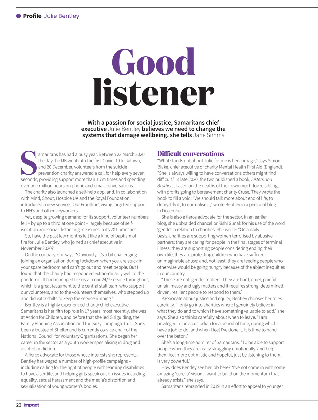 Julie Bentley Good listener With a passion for social justice, Samaritans chief executive Julie Bentley believes we need to change the systems that damage wellbeing, she tells Jane Simms S amaritans has had a busy year. Between 23 March 2020, the day the UK went into the first Covid-19 lockdown, and 20 December, volunteers from the suicide prevention charity answered a call for help every seven seconds, providing support more than 1.7m times and spending over one million hours on phone and email conversations. The charity also launched a self-help app, and, in collaboration with Mind, Shout, Hospice UK and the Royal Foundation, introduced a new service, Our Frontline, giving targeted support to NHS and other keyworkers. Yet, despite growing demand for its support, volunteer numbers fell by up to a third at one point largely because of selfisolation and social distancing measures in its 201 branches. So, have the past few months felt like a kind of baptism of fire for Julie Bentley, who joined as chief executive in November 2020? On the contrary, she says. Obviously, its a bit challenging joining an organisation during lockdown when you are stuck in your spare bedroom and cant go out and meet people. But I found that the charity had responded extraordinarily well to the pandemic. It had managed to sustain our 24/7 service throughout, which is a great testament to the central staff team who support our volunteers, and to the volunteers themselves, who stepped up and did extra shifts to keep the service running. Bentley is a highly experienced charity chief executive. Samaritans is her fifth top role in 17 years: most recently, she was at Action for Children, and before that she led Girlguiding, the Family Planning Association and the Suzy Lamplugh Trust. Shes been a trustee of Shelter and is currently co-vice-chair of the National Council for Voluntary Organisations. She began her career in the sector as a youth worker specialising in drug and alcohol addiction. A fierce advocate for those whose interests she represents, Bentley has waged a number of high-profile campaigns including calling for the right of people with learning disabilities to have a sex life, and helping girls speak out on issues including equality, sexual harassment and the medias distortion and sexualisation of young womens bodies. Difficult conversations What stands out about Julie for me is her courage, says Simon Blake, chief executive of charity Mental Health First Aid (England). She is always willing to have conversations others might find difficult. In late 2020, the two published a book, Sisters and Brothers, based on the deaths of their own much-loved siblings, with profits going to bereavement charity Cruse. They wrote the book to fill a void: We should talk more about end of life, to demystify it, to normalise it, wrote Bentley in a personal blog in December. She is also a fierce advocate for the sector. In an earlier blog, she upbraided chancellor Rishi Sunak for his use of the word gentle in relation to charities. She wrote: On a daily basis, charities are supporting women terrorised by abusive partners; they are caring for people in the final stages of terminal illness; they are supporting people considering ending their own life; they are protecting children who have suffered unimaginable abuse; and, not least, they are feeding people who otherwise would be going hungry because of the abject inequities in our country. These are not gentle matters. They are hard, cruel, painful, unfair, messy and ugly matters and it requires strong, determined, driven, resilient people to respond to them. Passionate about justice and equity, Bentley chooses her roles carefully. I only go into charities where I genuinely believe in what they do and to which I have something valuable to add, she says. She also thinks carefully about when to leave. I am privileged to be a custodian for a period of time, during which I have a job to do, and when I feel Ive done it, it is time to hand over the baton. Shes a long-time admirer of Samaritans: To be able to support people when they are really struggling emotionally, and help them feel more optimistic and hopeful, just by listening to them, is very powerful. How does Bentley see her job here? Ive not come in with some amazing eureka vision; I want to build on the momentum that already exists, she says. Samaritans rebranded in 2019 in an effort to appeal to younger 22 Impact ISSUE 33 2021_pp22-25_Profile.indd 22 26/03/2021 15:42