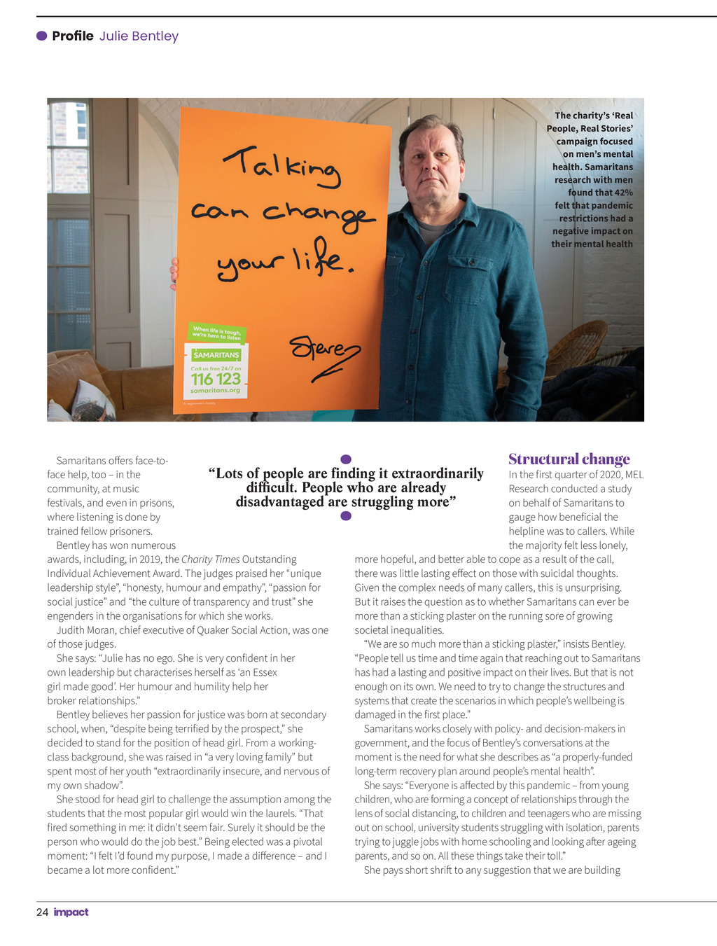 Julie Bentley The charitys Real People, Real Stories campaign focused on mens mental health. Samaritans research with men found that 42% felt that pandemic restrictions had a negative impact on their mental health Samaritans offers face-toStructural change face help, too in the Lots of people are finding it extraordinarily In the first quarter of 2020, MEL community, at music Research conducted a study festivals, and even in prisons, on behalf of Samaritans to where listening is done by gauge how beneficial the trained fellow prisoners. helpline was to callers. While Bentley has won numerous the majority felt less lonely, awards, including, in 2019, the Charity Times Outstanding more hopeful, and better able to cope as a result of the call, Individual Achievement Award. The judges praised her unique there was little lasting effect on those with suicidal thoughts. leadership style, honesty, humour and empathy, passion for Given the complex needs of many callers, this is unsurprising. social justice and the culture of transparency and trust she But it raises the question as to whether Samaritans can ever be engenders in the organisations for which she works. more than a sticking plaster on the running sore of growing Judith Moran, chief executive of Quaker Social Action, was one societal inequalities. of those judges. We are so much more than a sticking plaster, insists Bentley. She says: Julie has no ego. She is very confident in her People tell us time and time again that reaching out to Samaritans own leadership but characterises herself as an Essex has had a lasting and positive impact on their lives. But that is not girl made good. Her humour and humility help her enough on its own. We need to try to change the structures and broker relationships. systems that create the scenarios in which peoples wellbeing is Bentley believes her passion for justice was born at secondary damaged in the first place. school, when, despite being terrified by the prospect, she Samaritans works closely with policy- and decision-makers in decided to stand for the position of head girl. From a workinggovernment, and the focus of Bentleys conversations at the class background, she was raised in a very loving family but moment is the need for what she describes as a properly-funded spent most of her youth extraordinarily insecure, and nervous of long-term recovery plan around peoples mental health. my own shadow. She says: Everyone is affected by this pandemic from young She stood for head girl to challenge the assumption among the children, who are forming a concept of relationships through the students that the most popular girl would win the laurels. That lens of social distancing, to children and teenagers who are missing fired something in me: it didnt seem fair. Surely it should be the out on school, university students struggling with isolation, parents person who would do the job best. Being elected was a pivotal trying to juggle jobs with home schooling and looking after ageing moment: I felt Id found my purpose, I made a difference and I parents, and so on. All these things take their toll. became a lot more confident. She pays short shrift to any suggestion that we are building 24 Impact ISSUE 33 2021_pp22-25_Profile.indd 24 26/03/2021 10:00