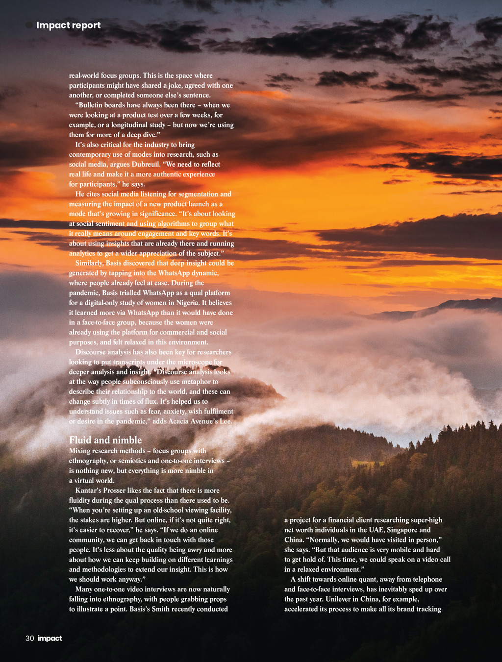 Impact report real-world focus groups. This is the space where participants might have shared a joke, agreed with one another, or completed someone elses sentence. Bulletin boards have always been there when we were looking at a product test over a few weeks, for example, or a longitudinal study but now were using them for more of a deep dive. Its also critical for the industry to bring contemporary use of modes into research, such as social media, argues Dubreuil. We need to reflect real life and make it a more authentic experience for participants, he says. He cites social media listening for segmentation and measuring the impact of a new product launch as a mode thats growing in significance. Its about looking at social sentiment and using algorithms to group what it really means around engagement and key words. Its about using insights that are already there and running analytics to get a wider appreciation of the subject. Similarly, Basis discovered that deep insight could be generated by tapping into the WhatsApp dynamic, where people already feel at ease. During the pandemic, Basis trialled WhatsApp as a qual platform for a digital-only study of women in Nigeria. It believes it learned more via WhatsApp than it would have done in a face-to-face group, because the women were already using the platform for commercial and social purposes, and felt relaxed in this environment. Discourse analysis has also been key for researchers looking to put transcripts under the microscope for deeper analysis and insight. Discourse analysis looks at the way people subconsciously use metaphor to describe their relationship to the world, and these can change subtly in times of flux. Its helped us to understand issues such as fear, anxiety, wish fulfilment or desire in the pandemic, adds Acacia Avenues Lee. Fluid and nimble Mixing research methods focus groups with ethnography, or semiotics and one-to-one interviews is nothing new, but everything is more nimble in a virtual world. Kantars Prosser likes the fact that there is more fluidity during the qual process than there used to be. When youre setting up an old-school viewing facility, the stakes are higher. But online, if its not quite right, its easier to recover, he says. If we do an online community, we can get back in touch with those people. Its less about the quality being awry and more and methodologies to extend our insight. This is how we should work anyway. Many one-to-one video interviews are now naturally falling into ethnography, with people grabbing props to illustrate a point. Basiss Smith recently conducted a project for a financial client researching super-high net worth individuals in the UAE, Singapore and China. Normally, we would have visited in person, she says. But that audience is very mobile and hard to get hold of. This time, we could speak on a video call in a relaxed environment. A shift towards online quant, away from telephone and face-to-face interviews, has inevitably sped up over the past year. Unilever in China, for example, accelerated its process to make all its brand tracking 30 Impact ISSUE 33 2021_pp26-35_Report.indd 30 26/03/2021 10:03