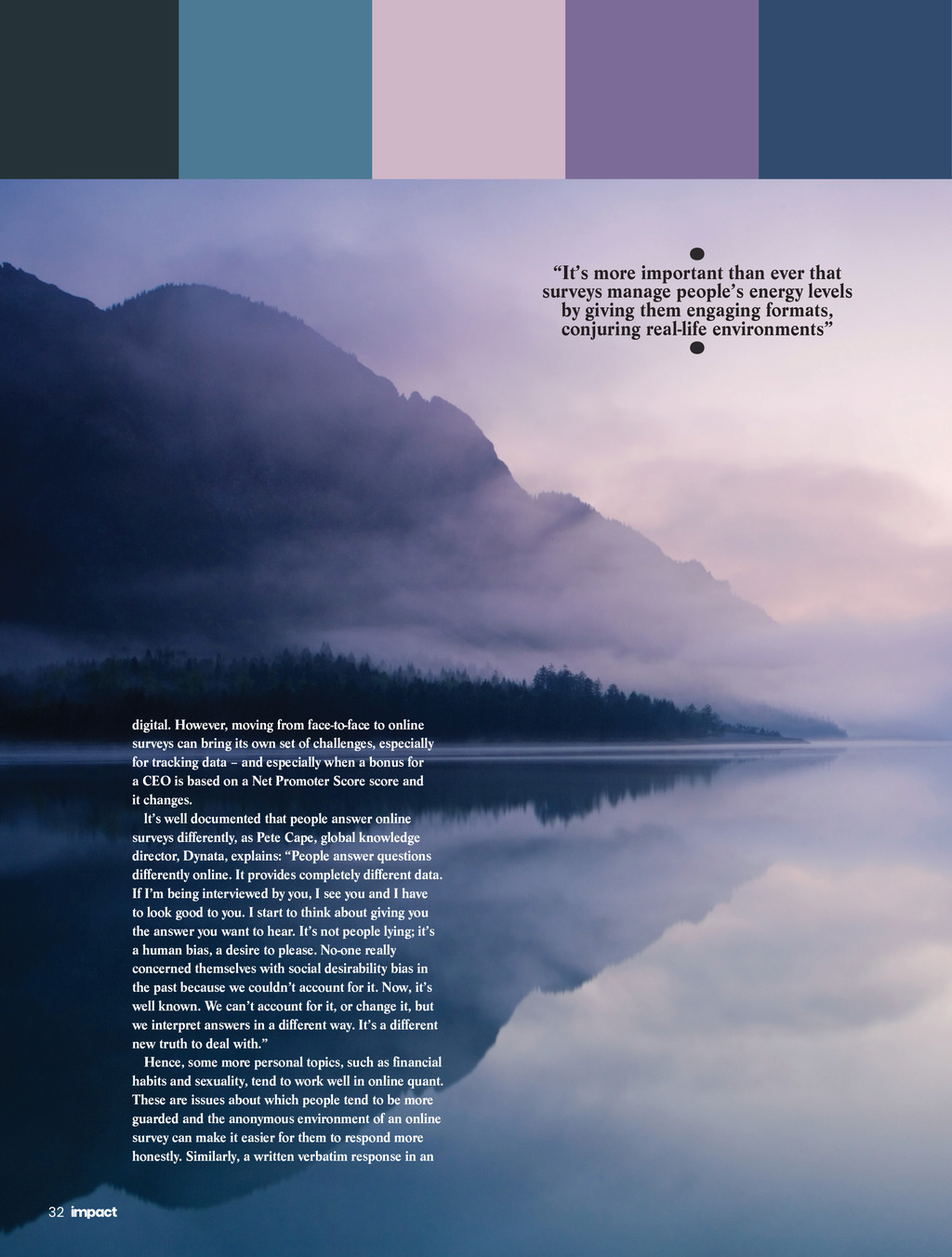 surveys manage peoples energy levels by giving them engaging formats, conjuring real-life environments digital. However, moving from face-to-face to online surveys can bring its own set of challenges, especially for tracking data and especially when a bonus for a CEO is based on a Net Promoter Score score and it changes. lts well documented that people answer online director, Dynata, explains: People answer questions a human bias, a desire to please. No-one really concerned themselves with social desirability bias in the past because we couldnt account for it. Now, its well known. We cant account for it, or change it, but new truth to deal with. Hence, some more personal topics, such as financial habits and sexuality, tend to work well in online quant. These are issues about which people tend to be more guarded and the anonymous environment of an online survey can make it easier for them to respond more honestly. Similarly, a written verbatim response in an 32 Impact ISSUE 33 2021_pp26-35_Report.indd 32 26/03/2021 15:14