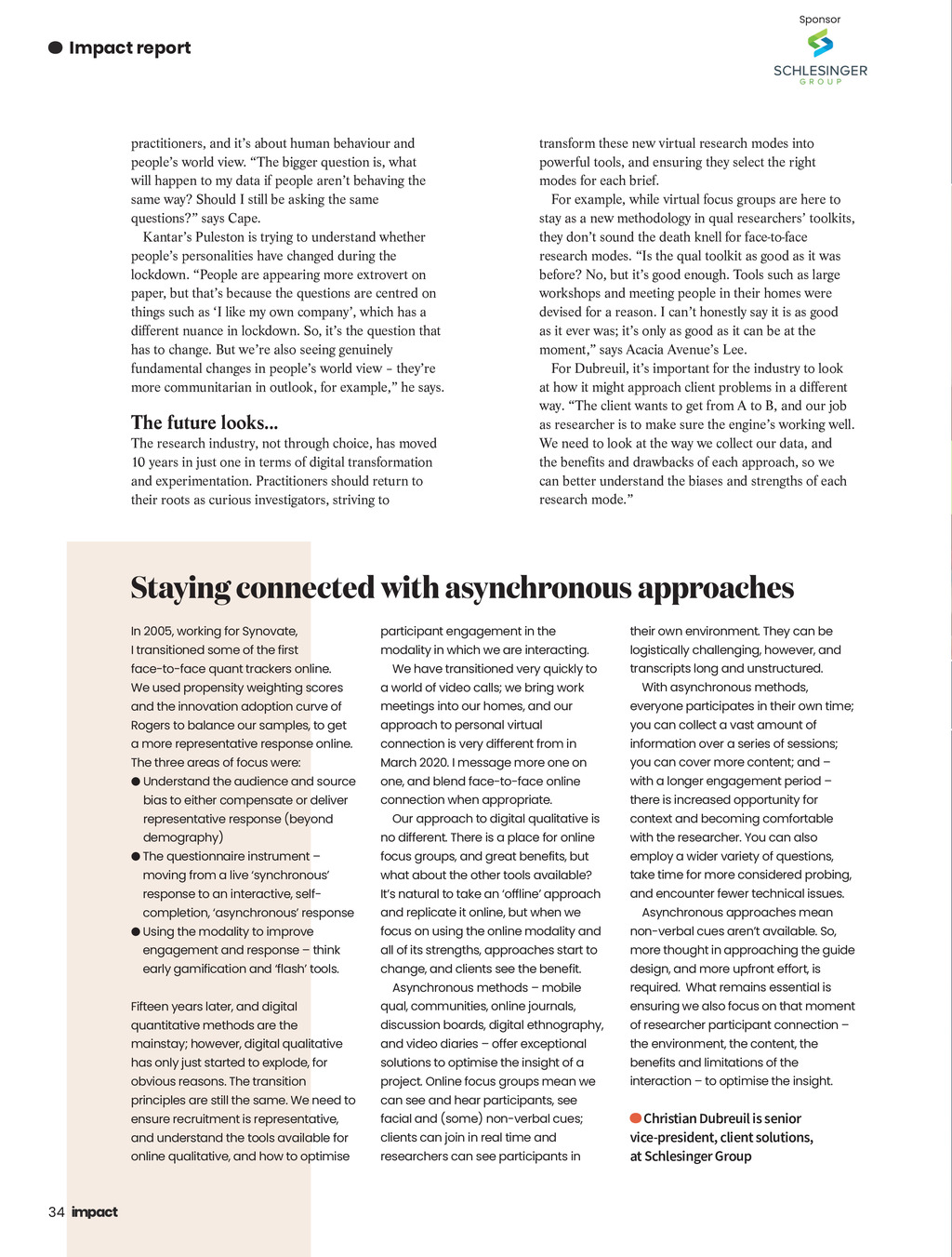 Sponsor Impact report practitioners, and its about human behaviour and peoples world view. The bigger question is, what will happen to my data if people arent behaving the same way? Should I still be asking the same questions? says Cape. Kantars Puleston is trying to understand whether peoples personalities have changed during the lockdown. People are appearing more extrovert on paper, but thats because the questions are centred on things such as I like my own company, which has a has to change. But were also seeing genuinely fundamental changes in peoples world view theyre more communitarian in outlook, for example, he says. The future looks... The research industry, not through choice, has moved 10 years in just one in terms of digital transformation and experimentation. Practitioners should return to their roots as curious investigators, striving to transform these new virtual research modes into powerful tools, and ensuring they select the right modes for each brief. For example, while virtual focus groups are here to stay as a new methodology in qual researchers toolkits, they dont sound the death knell for face-to-face research modes. Is the qual toolkit as good as it was before? No, but its good enough. Tools such as large workshops and meeting people in their homes were devised for a reason. I cant honestly say it is as good as it ever was; its only as good as it can be at the moment, says Acacia Avenues Lee. For Dubreuil, its important for the industry to look way. The client wants to get from A to B, and our job as researcher is to make sure the engines working well. We need to look at the way we collect our data, and the benefits and drawbacks of each approach, so we can better understand the biases and strengths of each research mode. Staying connected with asynchronous approaches In 2005, working for Synovate, I transitioned some of the first face-to-face quant trackers online. participant engagement in the modality in which we are interacting. We have transitioned very quickly to We used propensity weighting scores a world of video calls; we bring work Rogers to balance our samples, to get approach to personal virtual and the innovation adoption curve of a more representative response online. The three areas of focus were: Understand the audience and source bias to either compensate or deliver representative response (beyond information over a series of sessions; March 2020. I message more one on one, and blend face-to-face online connection when appropriate. Our approach to digital qualitative is what about the other tools available? Using the modality to improve engagement and response think early gamification and flash tools. focus groups, and great benefits, but Its natural to take an offline approach and replicate it online, but when we ensure recruitment is representative, and understand the tools available for online qualitative, and how to optimise there is increased opportunity for context and becoming comfortable with the researcher. You can also employ a wider variety of questions, take time for more considered probing, and encounter fewer technical issues. Asynchronous approaches mean design, and more upfront effort, is Asynchronous methods mobile and video diaries offer exceptional principles are still the same. We need to with a longer engagement period change, and clients see the benefit. all of its strengths, approaches start to mainstay; however, digital qualitative obvious reasons. The transition you can cover more content; and non-verbal cues arent available. So, qual, communities, online journals, has only just started to explode, for you can collect a vast amount of focus on using the online modality and Fifteen years later, and digital quantitative methods are the With asynchronous methods, connection is very different from in moving from a live synchronous completion, asynchronous response transcripts long and unstructured. everyone participates in their own time; no different. There is a place for online response to an interactive, self- logistically challenging, however, and meetings into our homes, and our demography) The questionnaire instrument their own environment. They can be discussion boards, digital ethnography, solutions to optimise the insight of a project. Online focus groups mean we can see and hear participants, see facial and (some) non-verbal cues; clients can join in real time and researchers can see participants in more thought in approaching the guide required. What remains essential is ensuring we also focus on that moment of researcher participant connection the environment, the content, the benefits and limitations of the interaction to optimise the insight. Christian Dubreuil is senior vice-president, client solutions, at Schlesinger Group 34 Impact ISSUE 33 2021_pp26-35_Report.indd 34 26/03/2021 10:03