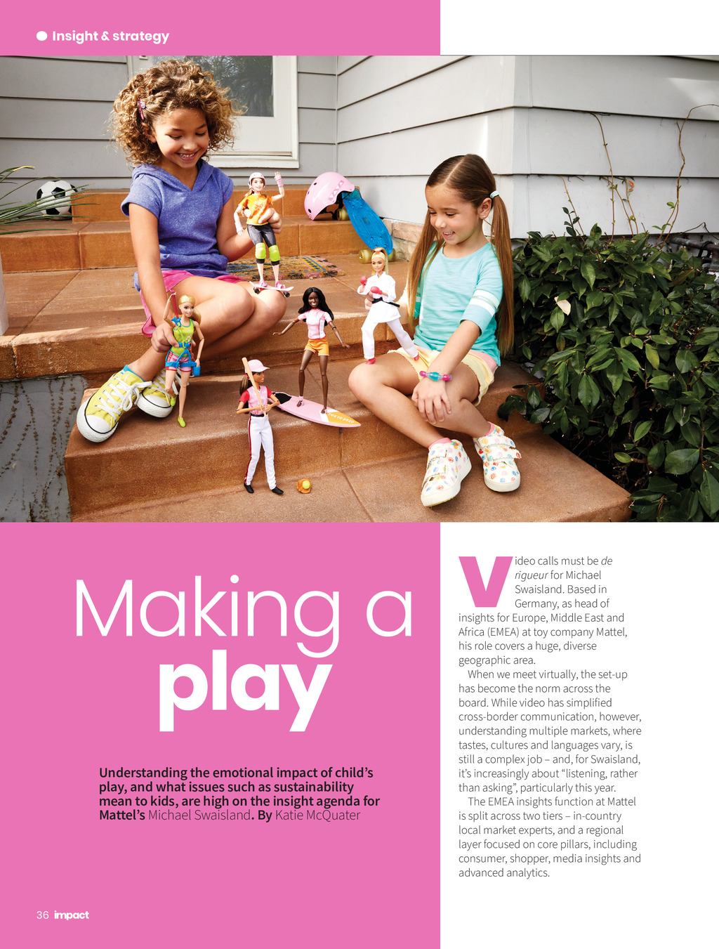 Insight & strategy V Making a play Understanding the emotional impact of childs play, and what issues such as sustainability mean to kids, are high on the insight agenda for Mattels Michael Swaisland. By Katie McQuater ideo calls must be de rigueur for Michael Swaisland. Based in Germany, as head of insights for Europe, Middle East and Africa (EMEA) at toy company Mattel, his role covers a huge, diverse geographic area. When we meet virtually, the set-up has become the norm across the board. While video has simplified cross-border communication, however, understanding multiple markets, where tastes, cultures and languages vary, is still a complex job and, for Swaisland, its increasingly about listening, rather than asking, particularly this year. The EMEA insights function at Mattel is split across two tiers in-country local market experts, and a regional layer focused on core pillars, including consumer, shopper, media insights and advanced analytics. 36 Impact ISSUE 33 2021_pp36-39 I&S Mattel.indd 36 26/03/2021 10:05