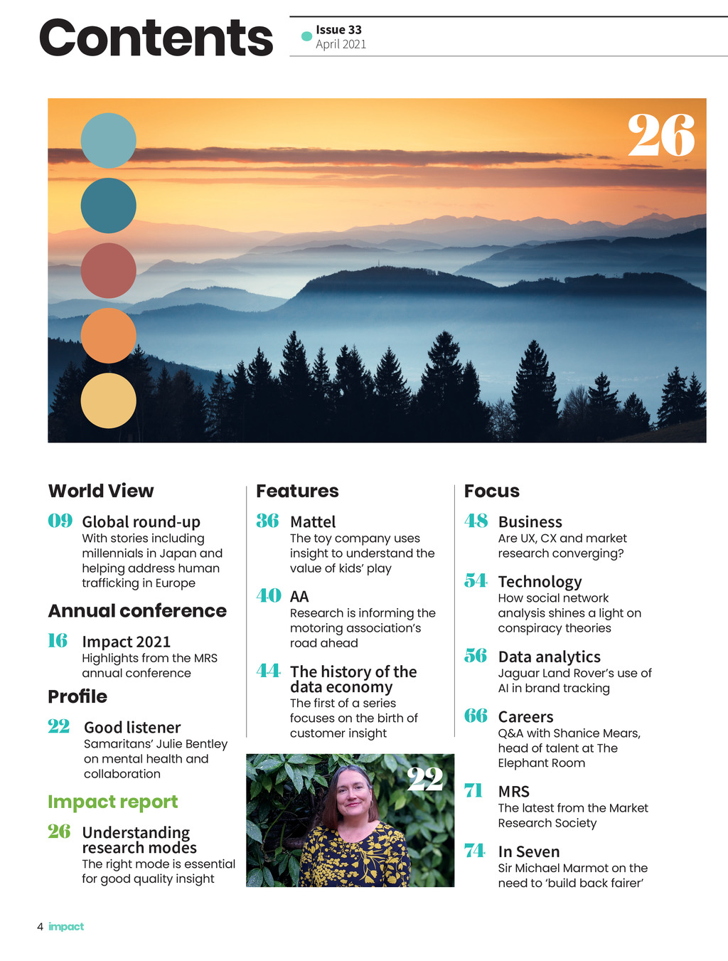 Contents Issue 33 April 2021 26 World View Features Focus 09 Global round-up 36 Mattel 48 Business With stories including millennials in Japan and helping address human trafficking in Europe Annual conference 16 Impact 2021 Highlights from the MRS annual conference 22 Good listener Samaritans Julie Bentley on mental health and collaboration Impact report 26 Understanding research modes The right mode is essential for good quality insight The toy company uses insight to understand the value of kids play 40 AA Research is informing the motoring associations road ahead 44 The history of the data economy The first of a series focuses on the birth of customer insight 22 Are UX, CX and market research converging? 54 Technology How social network analysis shines a light on conspiracy theories 56 Data analytics Jaguar Land Rovers use of AI in brand tracking 66 Careers Q&A with Shanice Mears, head of talent at The Elephant Room 71 MRS The latest from the Market Research Society 74 In Seven Sir Michael Marmot on the need to build back fairer 4 Impact ISSUE 33 2021_pp4-5_contents.indd 4 26/03/2021 09:37
