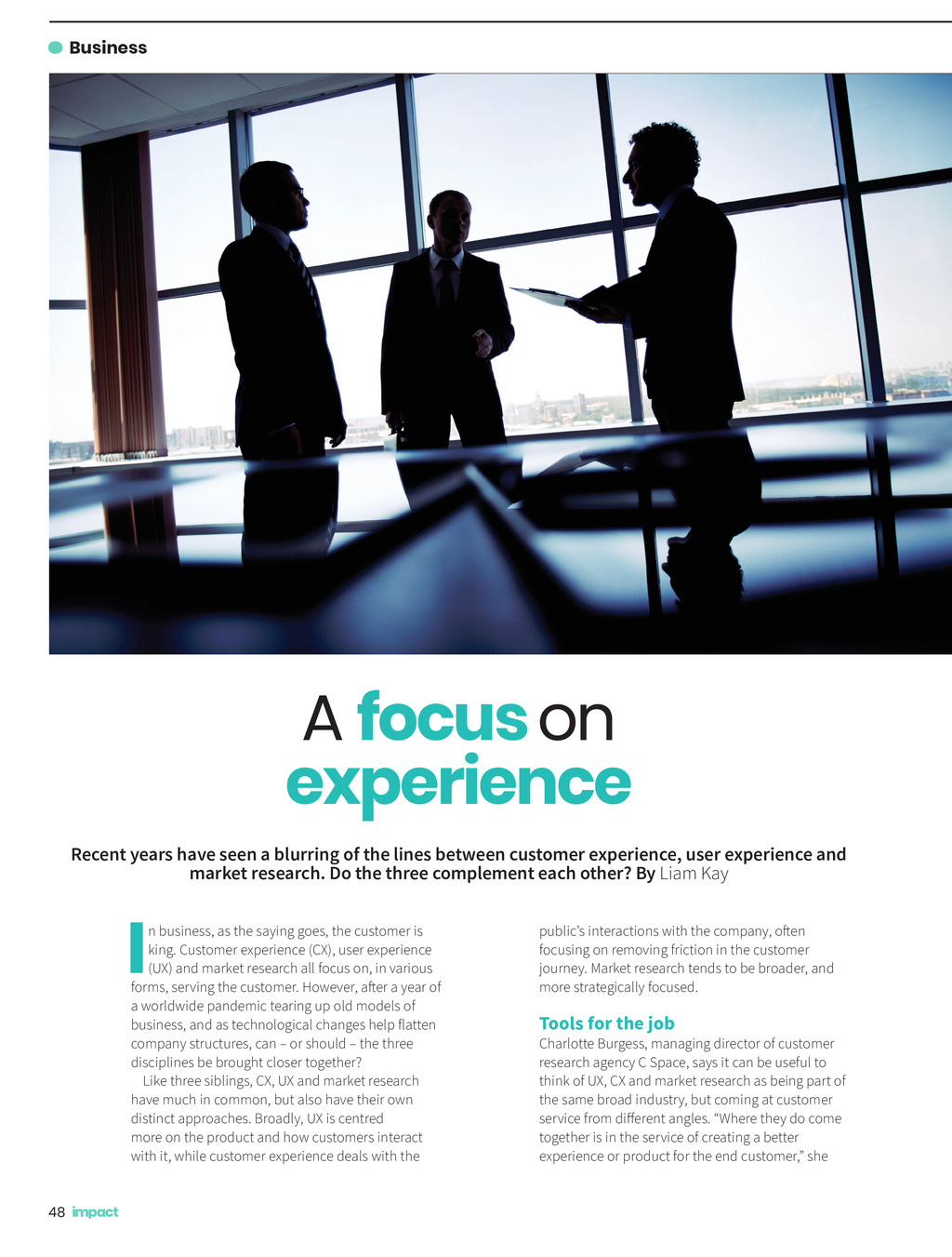 Business A focus on experience Recent years have seen a blurring of the lines between customer experience, user experience and market research. Do the three complement each other? By Liam Kay I n business, as the saying goes, the customer is king. Customer experience (CX), user experience (UX) and market research all focus on, in various forms, serving the customer. However, after a year of a worldwide pandemic tearing up old models of business, and as technological changes help flatten company structures, can or should the three disciplines be brought closer together? Like three siblings, CX, UX and market research have much in common, but also have their own distinct approaches. Broadly, UX is centred more on the product and how customers interact with it, while customer experience deals with the publics interactions with the company, often focusing on removing friction in the customer journey. Market research tends to be broader, and more strategically focused. Tools for the job Charlotte Burgess, managing director of customer research agency C Space, says it can be useful to think of UX, CX and market research as being part of the same broad industry, but coming at customer service from different angles. Where they do come together is in the service of creating a better experience or product for the end customer, she 48 Impact ISSUE 33 2021_pp48-49 Business.indd 48 26/03/2021 10:13
