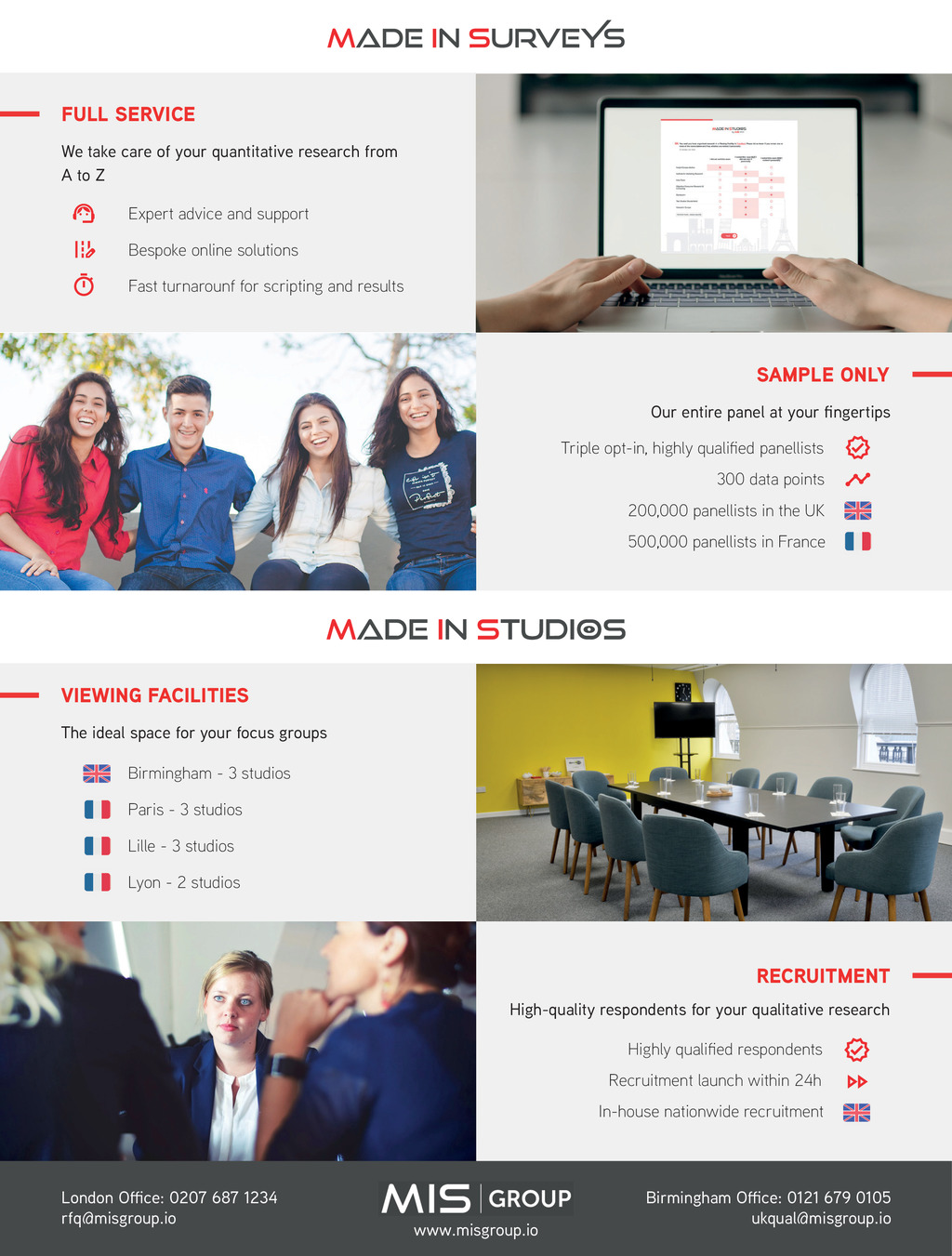 FULL SERVICE We take care of your quantitative research from A to Z Expert advice and support Bespoke online solutions Fast turnarounf for scripting and results SAMPLE ONLY Our entire panel at your fingertips Triple opt-in, highly qualified panellists 300 data points 200,000 panellists in the UK 500,000 panellists in France VIEWING FACILITIES The ideal space for your focus groups Birmingham - 3 studios Paris - 3 studios Lille - 3 studios Lyon - 2 studios RECRUITMENT High-quality respondents for your qualitative research Highly qualified respondents Recruitment launch within 24h In-house nationwide recruitment London Office: 0207 687 1234 rfq@misgroup.io Impact ISSUE 33 2021_pp6-7_Rory.indd 6 www.misgroup.io Birmingham Office: 0121 679 0105 ukqual@misgroup.io 26/03/2021 09:43
