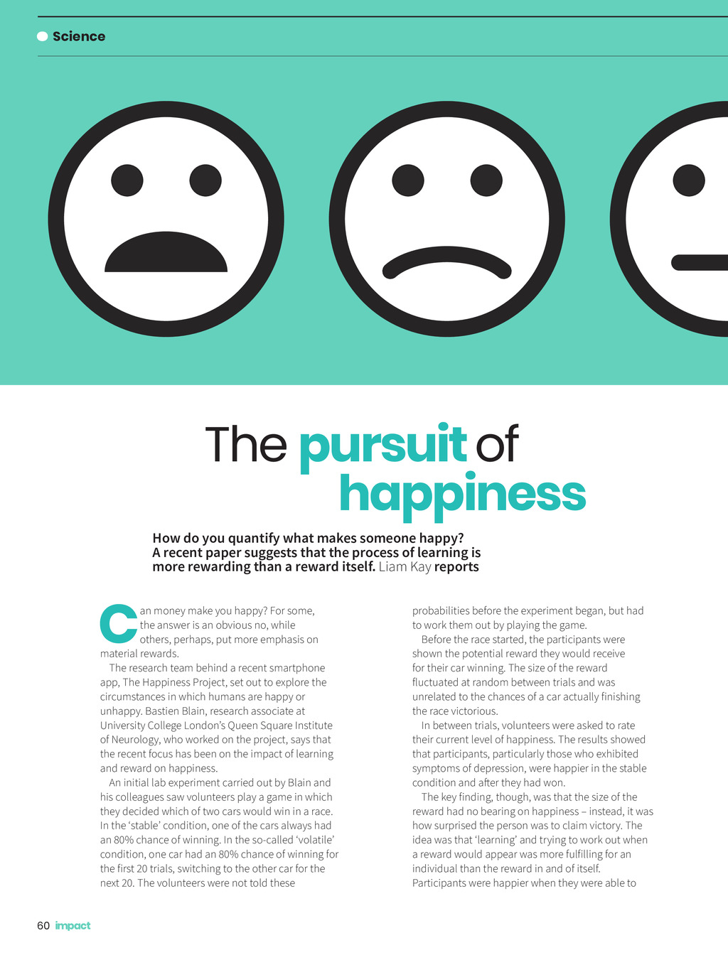 Science The pursuit of happiness How do you quantify what makes someone happy? A recent paper suggests that the process of learning is more rewarding than a reward itself. Liam Kay reports C an money make you happy? For some, the answer is an obvious no, while others, perhaps, put more emphasis on material rewards. The research team behind a recent smartphone app, The Happiness Project, set out to explore the circumstances in which humans are happy or unhappy. Bastien Blain, research associate at University College Londons Queen Square Institute of Neurology, who worked on the project, says that the recent focus has been on the impact of learning and reward on happiness. An initial lab experiment carried out by Blain and his colleagues saw volunteers play a game in which they decided which of two cars would win in a race. In the stable condition, one of the cars always had an 80% chance of winning. In the so-called volatile condition, one car had an 80% chance of winning for the first 20 trials, switching to the other car for the next 20. The volunteers were not told these probabilities before the experiment began, but had to work them out by playing the game. Before the race started, the participants were shown the potential reward they would receive for their car winning. The size of the reward fluctuated at random between trials and was unrelated to the chances of a car actually finishing the race victorious. In between trials, volunteers were asked to rate their current level of happiness. The results showed that participants, particularly those who exhibited symptoms of depression, were happier in the stable condition and after they had won. The key finding, though, was that the size of the reward had no bearing on happiness instead, it was how surprised the person was to claim victory. The idea was that learning and trying to work out when a reward would appear was more fulfilling for an individual than the reward in and of itself. Participants were happier when they were able to 60 Impact ISSUE 33 2021_pp60-61 Science.indd 60 26/03/2021 10:18
