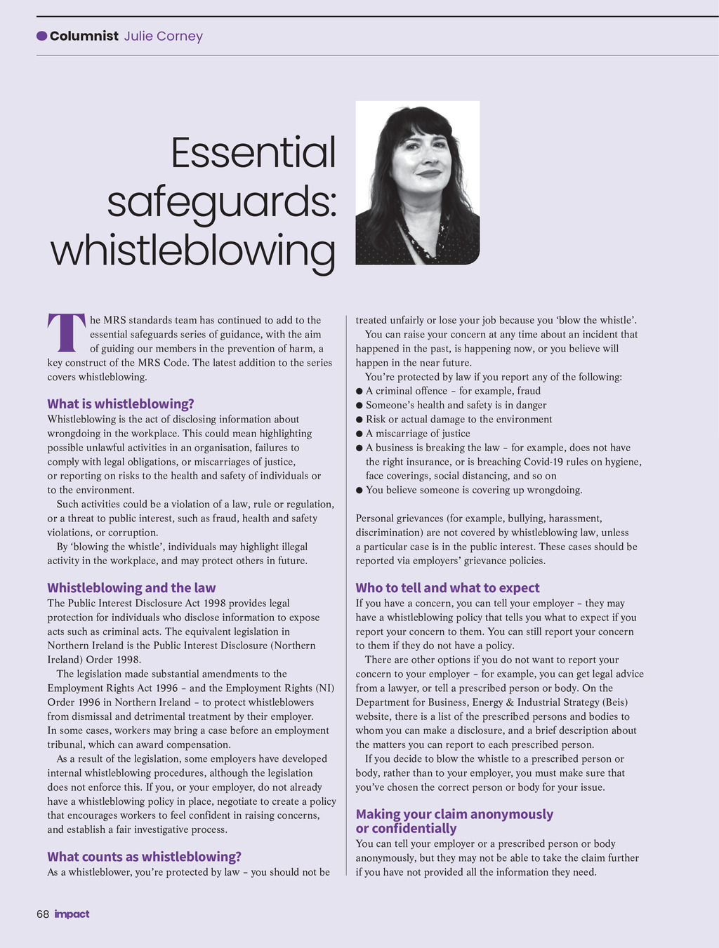 Columnist Julie Corney Essential safeguards: whistleblowing T he MRS standards team has continued to add to the essential safeguards series of guidance, with the aim of guiding our members in the prevention of harm, a key construct of the MRS Code. The latest addition to the series covers whistleblowing. What is whistleblowing? treated unfairly or lose your job because you blow the whistle. You can raise your concern at any time about an incident that happened in the past, is happening now, or you believe will happen in the near future. Youre protected by law if you report any of the following: Someones health and safety is in danger Risk or actual damage to the environment A miscarriage of justice A business is breaking the law for example, does not have the right insurance, or is breaching Covid-19 rules on hygiene, face coverings, social distancing, and so on You believe someone is covering up wrongdoing. Whistleblowing is the act of disclosing information about wrongdoing in the workplace. This could mean highlighting possible unlawful activities in an organisation, failures to comply with legal obligations, or miscarriages of justice, or reporting on risks to the health and safety of individuals or to the environment. Such activities could be a violation of a law, rule or regulation, or a threat to public interest, such as fraud, health and safety violations, or corruption. By blowing the whistle, individuals may highlight illegal activity in the workplace, and may protect others in future. Personal grievances (for example, bullying, harassment, discrimination) are not covered by whistleblowing law, unless a particular case is in the public interest. These cases should be reported via employers grievance policies. Whistleblowing and the law Who to tell and what to expect The Public Interest Disclosure Act 1998 provides legal protection for individuals who disclose information to expose acts such as criminal acts. The equivalent legislation in Northern Ireland is the Public Interest Disclosure (Northern Ireland) Order 1998. The legislation made substantial amendments to the Employment Rights Act 1996 and the Employment Rights (NI) Order 1996 in Northern Ireland to protect whistleblowers from dismissal and detrimental treatment by their employer. In some cases, workers may bring a case before an employment tribunal, which can award compensation. As a result of the legislation, some employers have developed internal whistleblowing procedures, although the legislation does not enforce this. If you, or your employer, do not already have a whistleblowing policy in place, negotiate to create a policy that encourages workers to feel confident in raising concerns, and establish a fair investigative process. If you have a concern, you can tell your employer they may have a whistleblowing policy that tells you what to expect if you report your concern to them. You can still report your concern to them if they do not have a policy. There are other options if you do not want to report your concern to your employer for example, you can get legal advice from a lawyer, or tell a prescribed person or body. On the Department for Business, Energy & Industrial Strategy (Beis) website, there is a list of the prescribed persons and bodies to whom you can make a disclosure, and a brief description about the matters you can report to each prescribed person. If you decide to blow the whistle to a prescribed person or body, rather than to your employer, you must make sure that youve chosen the correct person or body for your issue. What counts as whistleblowing? As a whistleblower, youre protected by law you should not be Making your claim anonymously You can tell your employer or a prescribed person or body anonymously, but they may not be able to take the claim further if you have not provided all the information they need. 68 Impact ISSUE 33 2021_pp68-69 Legal.indd 68 26/03/2021 10:21