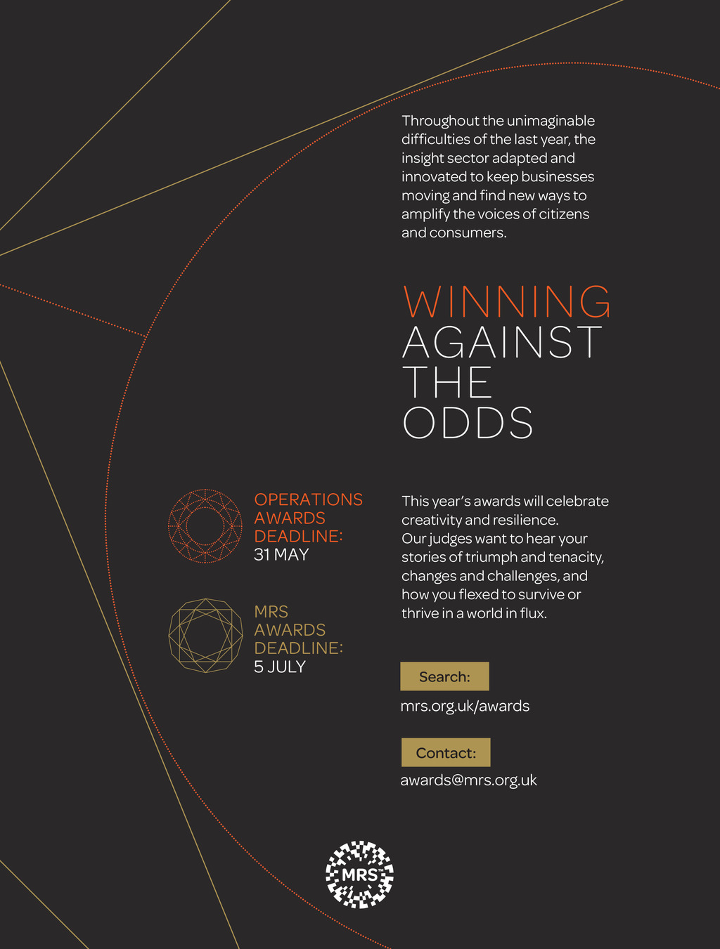 Throughout the unimaginable difficulties of the last year, the insight sector adapted and innovated to keep businesses moving and find new ways to amplify the voices of citizens and consumers. WINNING AGAINST THE ODDS OPERATIONS AWARDS DEADLINE: 31 MAY MRS AWARDS DEADLINE: 5 JULY This years awards will celebrate creativity and resilience. Our judges want to hear your stories of triumph and tenacity, changes and challenges, and how you flexed to survive or thrive in a world in flux. Search: mrs.org.uk/awards Contact: awards@mrs.org.uk Impact ISSUE 33 2021_pp74-76 Seven.indd 76 26/03/2021 10:24