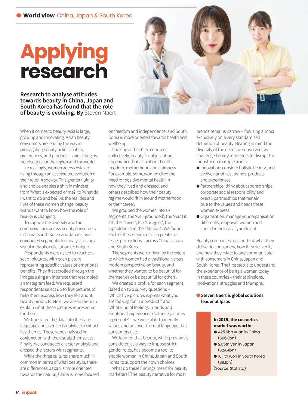 World view China, Japan & South Korea Applying research Research to analyse attitudes towards beauty in China, Japan and South Korea has found that the role of beauty is evolving. By Steven Naert When it comes to beauty, Asia is large, growing and innovating. Asian beauty consumers are leading the way in propagating beauty beliefs, habits, preferences, and products and acting as trendsetters for the region and the world. Increasingly, women across Asia are living through an accelerated evolution of from What is expected of me? to What do I want to do and be? As the realities and lives of these women change, beauty brands want to know how the role of beauty is changing. To capture the diversity and the commonalities across beauty consumers in China, South Korea and Japan, Ipsos conducted segmentation analysis using a visual metaphor elicitation technique. Respondents were asked to react to a set of pictures, with each picture images using an interface that resembled an Instagram feed. We requested on freedom and independence, and South Korea is more oriented towards health and wellbeing. Looking at the three countries collectively, beauty is not just about appearance, but also about health, freedom, motherhood and calmness. For example, some women cited the need for positive mental health in how they lived and dressed, and others described how their beauty or their career. We grouped the women into six brands remains narrow focusing almost exclusively on a very standardised diversity of the needs we observed, we challenge beauty marketers to disrupt the evolve narratives, brands, products and experiences corporate social responsibility and overall partnerships that remain true to the values and needs these women express consider the risks if you do not. each of these segments in greater or lesser proportions across China, Japan and South Korea. The segments were driven by the extent to which women had a traditional versus modern perspective on beauty, and whether they wanted to be beautiful for themselves or be beautiful for others. Beauty companies must rethink what they deliver to consumers, how they deliver it, and how they relate to and communicate with consumers in China, Japan and the experience of being a woman today in these countries their aspirations, motivations, struggles and triumphs. Based on two survey questions help them express how they felt about beauty products. Next, we asked them to explain what these pictures represented for them. We translated the data into the base language and used text analytics to extract key themes. These were analysed in conjunction with the visuals themselves. Finally, we conducted a factor analysis and crossed the factors with segments. While the three cultures share much in common in terms of what beauty is, there are looking for in a product? and What kind of feelings, moods and emotional experiences do those pictures represent? we were able to identify values and uncover the real language that consumers use. We learned that beauty, while previously considered as a way to impose strict gender roles, has become a tool to enable women in China, Japan and South Korea to support their own choices. Steven Naert is global solutions leader at Ipsos In 2019, the cosmetics market was worth: 425.6bn yuan in China ($66.3bn) 2.65tn yen in Japan ($24.4bn) 10.11tn won in South Korea ($9.1bn) (Source: Statista) towards the natural, China is more focused marketers? The beauty narrative for most 14 Impact ISSUE 34 2021_pp14 WV Asia.indd 14 18/06/2021 13:00