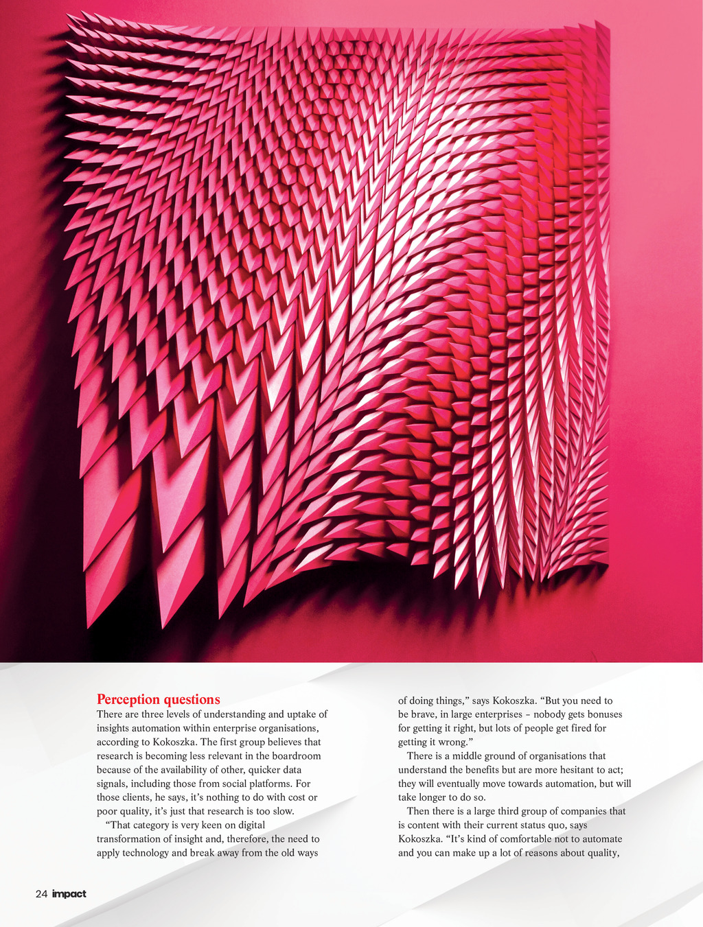 Perception questions There are three levels of understanding and uptake of insights automation within enterprise organisations, according to Kokoszka. The first group believes that research is becoming less relevant in the boardroom because of the availability of other, quicker data signals, including those from social platforms. For those clients, he says, its nothing to do with cost or poor quality, its just that research is too slow. That category is very keen on digital transformation of insight and, therefore, the need to apply technology and break away from the old ways of doing things, says Kokoszka. But you need to be brave, in large enterprises nobody gets bonuses for getting it right, but lots of people get fired for getting it wrong. There is a middle ground of organisations that understand the benefits but are more hesitant to act; they will eventually move towards automation, but will take longer to do so. Then there is a large third group of companies that is content with their current status quo, says Kokoszka. Its kind of comfortable not to automate and you can make up a lot of reasons about quality, 24 Impact ISSUE 34 2021_pp21-29_Report.indd 24 18/06/2021 16:52