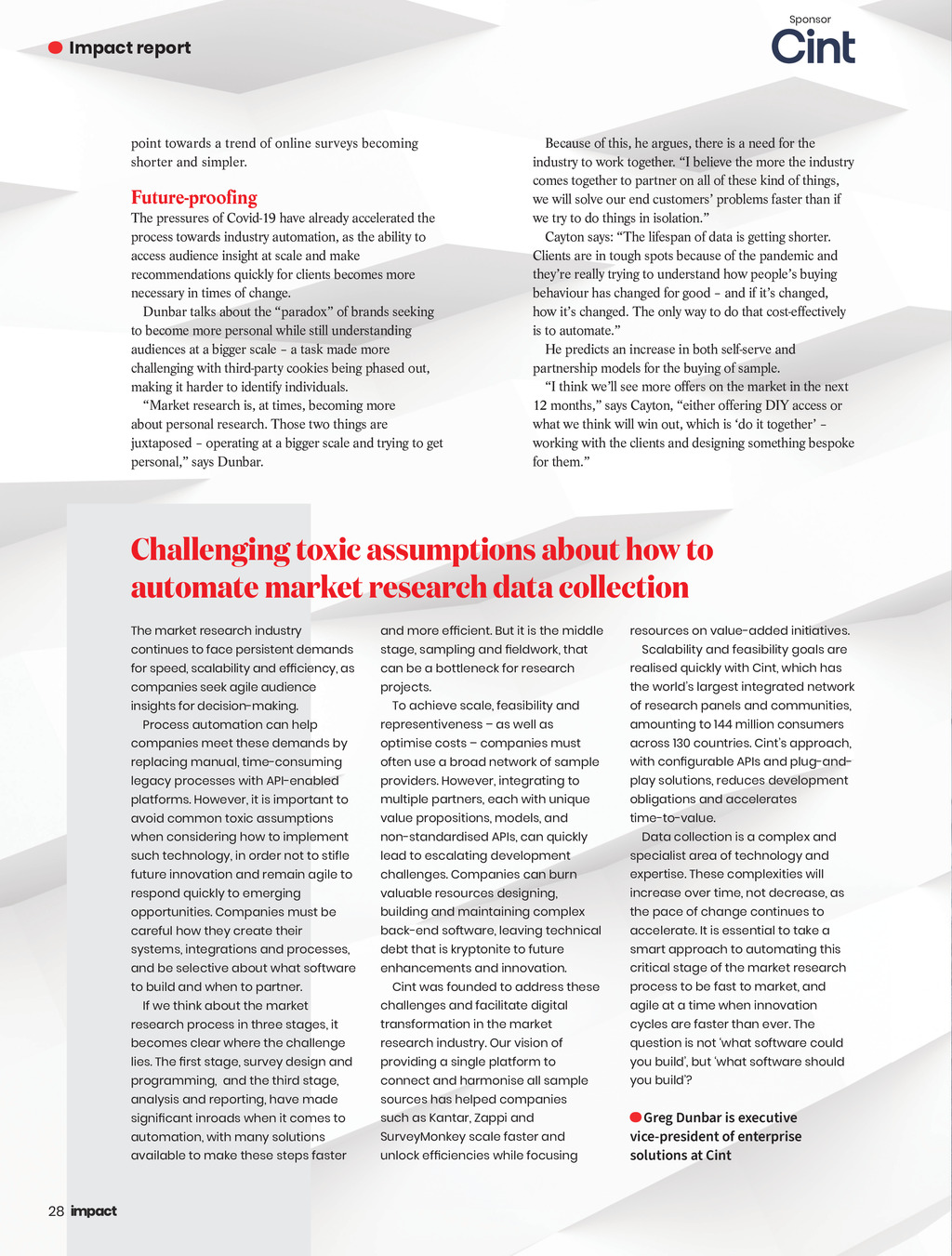 Sponsor Impact report point towards a trend of online surveys becoming shorter and simpler. Future-proofing The pressures of Covid-19 have already accelerated the process towards industry automation, as the ability to access audience insight at scale and make recommendations quickly for clients becomes more necessary in times of change. Dunbar talks about the paradox of brands seeking to become more personal while still understanding audiences at a bigger scale a task made more challenging with third-party cookies being phased out, making it harder to identify individuals. Market research is, at times, becoming more about personal research. Those two things are juxtaposed operating at a bigger scale and trying to get personal, says Dunbar. Because of this, he argues, there is a need for the industry to work together. I believe the more the industry comes together to partner on all of these kind of things, we will solve our end customers problems faster than if we try to do things in isolation. Cayton says: The lifespan of data is getting shorter. Clients are in tough spots because of the pandemic and theyre really trying to understand how peoples buying behaviour has changed for good and if its changed, is to automate. He predicts an increase in both self-serve and partnership models for the buying of sample. what we think will win out, which is do it together working with the clients and designing something bespoke for them. Challenging toxic assumptions about how to automate market research data collection resources on value-added initiatives. The market research industry Scalability and feasibility goals are continues to face persistent demands companies seek agile audience insights for decision-making. can be a bottleneck for research realised quickly with Cint, which has projects. the worlds largest integrated network To achieve scale, feasibility and of research panels and communities, representiveness as well as amounting to 144 million consumers companies meet these demands by optimise costs companies must across 130 countries. Cints approach, replacing manual, time-consuming often use a broad network of sample legacy processes with API-enabled providers. However, integrating to play solutions, reduces development platforms. However, it is important to multiple partners, each with unique obligations and accelerates avoid common toxic assumptions value propositions, models, and time-to-value. when considering how to implement non-standardised APIs, can quickly Process automation can help Data collection is a complex and lead to escalating development specialist area of technology and future innovation and remain agile to challenges. Companies can burn expertise. These complexities will respond quickly to emerging valuable resources designing, increase over time, not decrease, as opportunities. Companies must be building and maintaining complex the pace of change continues to careful how they create their back-end software, leaving technical accelerate. It is essential to take a systems, integrations and processes, debt that is kryptonite to future smart approach to automating this and be selective about what software enhancements and innovation. critical stage of the market research to build and when to partner. Cint was founded to address these process to be fast to market, and challenges and facilitate digital agile at a time when innovation research process in three stages, it transformation in the market cycles are faster than ever. The becomes clear where the challenge research industry. Our vision of question is not what software could providing a single platform to you build, but what software should programming, and the third stage, connect and harmonise all sample you build? analysis and reporting, have made sources has helped companies If we think about the market such as Kantar, Zappi and automation, with many solutions available to make these steps faster SurveyMonkey scale faster and Greg Dunbar is executive vice-president of enterprise solutions at Cint 28 Impact ISSUE 34 2021_pp21-29_Report.indd 28 18/06/2021 16:52