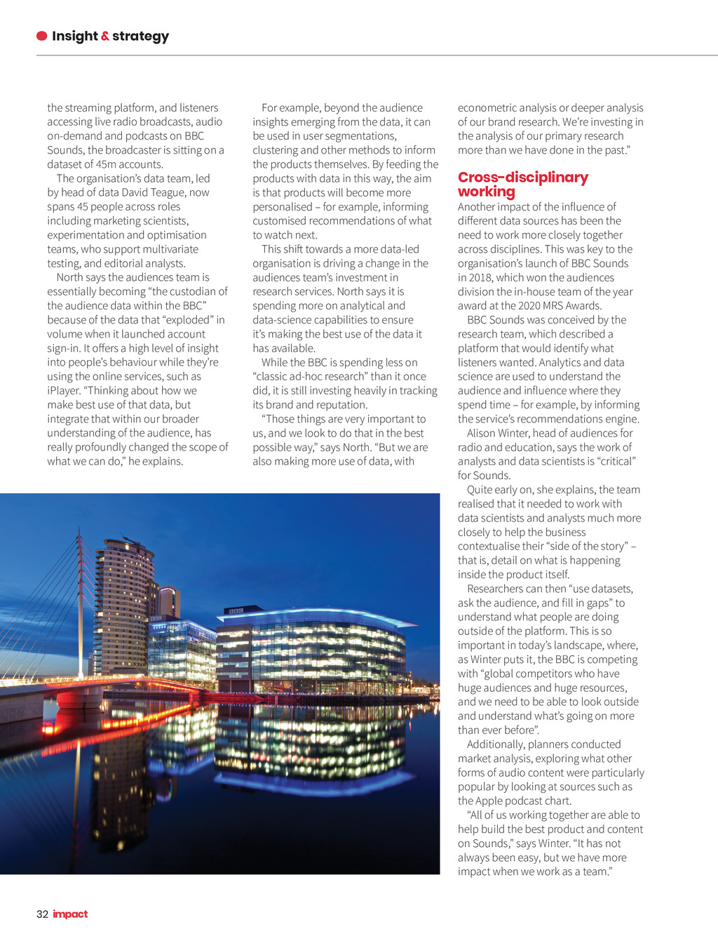 Insight & strategy the streaming platform, and listeners accessing live radio broadcasts, audio Sounds, the broadcaster is sitting on a dataset of 45m accounts. The organisations data team, led by head of data David Teague, now spans 45 people across roles including marketing scientists, experimentation and optimisation teams, who support multivariate testing, and editorial analysts. North says the audiences team is essentially becoming the custodian of volume when it launched account into peoples behaviour while theyre using the online services, such as iPlayer. Thinking about how we make best use of that data, but integrate that within our broader understanding of the audience, has really profoundly changed the scope of For example, beyond the audience insights emerging from the data, it can be used in user segmentations, clustering and other methods to inform the products themselves. By feeding the products with data in this way, the aim is that products will become more personalised for example, informing customised recommendations of what to watch next. organisation is driving a change in the audiences teams investment in research services. North says it is spending more on analytical and its making the best use of the data it has available. While the BBC is spending less on did, it is still investing heavily in tracking its brand and reputation. Those things are very important to us, and we look to do that in the best also making more use of data, with econometric analysis or deeper analysis of our brand research. Were investing in the analysis of our primary research Cross-disciplinary working need to work more closely together across disciplines. This was key to the organisations launch of BBC Sounds in 2018, which won the audiences award at the 2020 MRS Awards. BBC Sounds was conceived by the research team, which described a platform that would identify what listeners wanted. Analytics and data science are used to understand the spend time for example, by informing the services recommendations engine. Alison Winter, head of audiences for radio and education, says the work of for Sounds. Quite early on, she explains, the team realised that it needed to work with data scientists and analysts much more closely to help the business that is, detail on what is happening inside the product itself. Researchers can then use datasets, understand what people are doing outside of the platform. This is so important in todays landscape, where, as Winter puts it, the BBC is competing with global competitors who have huge audiences and huge resources, and we need to be able to look outside and understand whats going on more Additionally, planners conducted market analysis, exploring what other forms of audio content were particularly popular by looking at sources such as the Apple podcast chart. All of us working together are able to help build the best product and content always been easy, but we have more 32 Impact ISSUE 34 2021_pp30-33 I&S Beeb.indd 32 18/06/2021 13:45