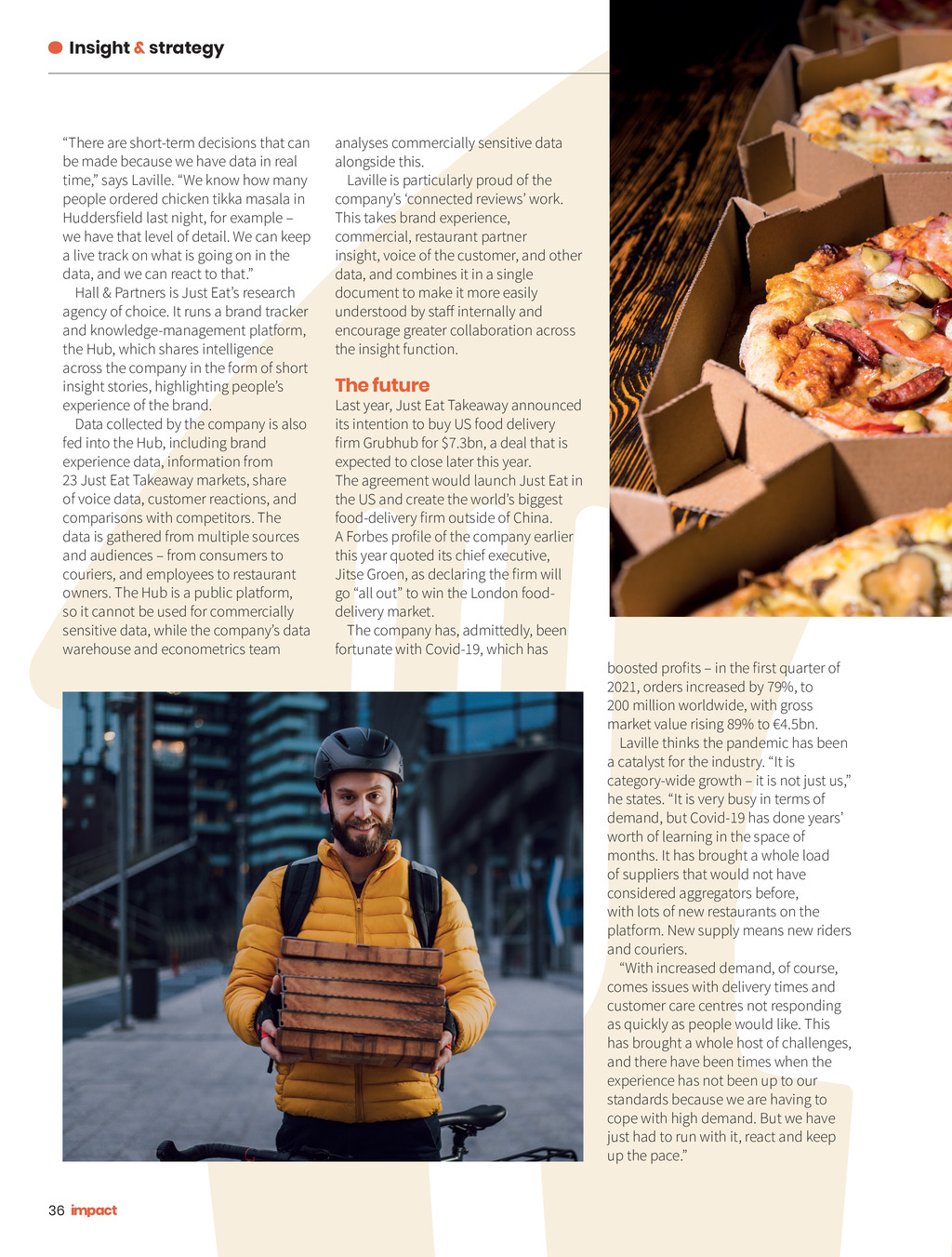 Insight & strategy There are short-term decisions that can be made because we have data in real time, says Laville. We know how many people ordered chicken tikka masala in we have that level of detail. We can keep a live track on what is going on in the data, and we can react to that. Hall & Partners is Just Eats research agency of choice. It runs a brand tracker and knowledge-management platform, the Hub, which shares intelligence across the company in the form of short insight stories, highlighting peoples experience of the brand. Data collected by the company is also fed into the Hub, including brand experience data, information from of voice data, customer reactions, and comparisons with competitors. The data is gathered from multiple sources couriers, and employees to restaurant owners. The Hub is a public platform, so it cannot be used for commercially sensitive data, while the companys data warehouse and econometrics team analyses commercially sensitive data alongside this. Laville is particularly proud of the companys connected reviews work. This takes brand experience, commercial, restaurant partner insight, voice of the customer, and other data, and combines it in a single document to make it more easily encourage greater collaboration across the insight function. The future Last year, Just Eat Takeaway announced its intention to buy US food delivery expected to close later this year. The agreement would launch Just Eat in the US and create the worlds biggest this year quoted its chief executive, go all out to win the London fooddelivery market. The company has, admittedly, been 200 million worldwide, with gross Laville thinks the pandemic has been a catalyst for the industry. It is he states. It is very busy in terms of worth of learning in the space of months. It has brought a whole load of suppliers that would not have considered aggregators before, with lots of new restaurants on the platform. New supply means new riders and couriers. With increased demand, of course, comes issues with delivery times and customer care centres not responding as quickly as people would like. This has brought a whole host of challenges, and there have been times when the experience has not been up to our standards because we are having to cope with high demand. But we have up the pace. 36 Impact ISSUE 34 2021_pp34-37 I&S Just Eat.indd 36 18/06/2021 13:48