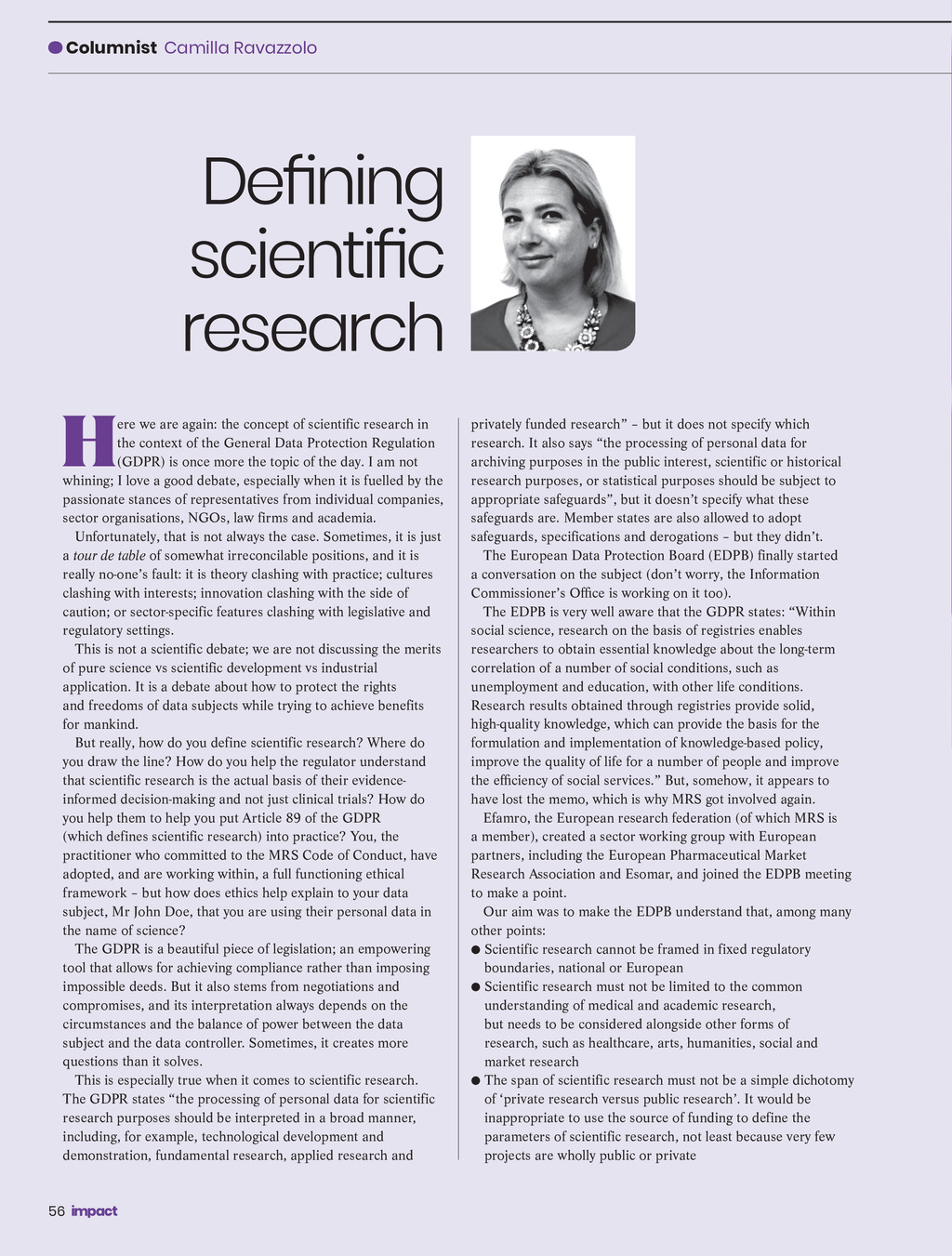 Columnist Camilla Ravazzolo research H ere we are again: the concept of scientific research in the context of the General Data Protection Regulation (GDPR) is once more the topic of the day. I am not whining; I love a good debate, especially when it is fuelled by the passionate stances of representatives from individual companies, sector organisations, NGOs, law firms and academia. Unfortunately, that is not always the case. Sometimes, it is just a tour de table of somewhat irreconcilable positions, and it is really no-ones fault: it is theory clashing with practice; cultures clashing with interests; innovation clashing with the side of caution; or sector-specific features clashing with legislative and regulatory settings. This is not a scientific debate; we are not discussing the merits of pure science vs scientific development vs industrial application. It is a debate about how to protect the rights and freedoms of data subjects while trying to achieve benefits for mankind. But really, how do you define scientific research? Where do you draw the line? How do you help the regulator understand that scientific research is the actual basis of their evidenceinformed decision-making and not just clinical trials? How do you help them to help you put Article 89 of the GDPR (which defines scientific research) into practice? You, the practitioner who committed to the MRS Code of Conduct, have adopted, and are working within, a full functioning ethical framework but how does ethics help explain to your data subject, Mr John Doe, that you are using their personal data in the name of science? The GDPR is a beautiful piece of legislation; an empowering tool that allows for achieving compliance rather than imposing impossible deeds. But it also stems from negotiations and compromises, and its interpretation always depends on the circumstances and the balance of power between the data subject and the data controller. Sometimes, it creates more questions than it solves. This is especially true when it comes to scientific research. The GDPR states the processing of personal data for scientific research purposes should be interpreted in a broad manner, including, for example, technological development and demonstration, fundamental research, applied research and privately funded research but it does not specify which research. It also says the processing of personal data for archiving purposes in the public interest, scientific or historical research purposes, or statistical purposes should be subject to appropriate safeguards, but it doesnt specify what these safeguards are. Member states are also allowed to adopt safeguards, specifications and derogations but they didnt. The European Data Protection Board (EDPB) finally started a conversation on the subject (dont worry, the Information The EDPB is very well aware that the GDPR states: Within social science, research on the basis of registries enables researchers to obtain essential knowledge about the long-term correlation of a number of social conditions, such as unemployment and education, with other life conditions. Research results obtained through registries provide solid, high-quality knowledge, which can provide the basis for the formulation and implementation of knowledge-based policy, improve the quality of life for a number of people and improve have lost the memo, which is why MRS got involved again. Efamro, the European research federation (of which MRS is a member), created a sector working group with European partners, including the European Pharmaceutical Market Research Association and Esomar, and joined the EDPB meeting to make a point. Our aim was to make the EDPB understand that, among many other points: Scientific research cannot be framed in fixed regulatory boundaries, national or European Scientific research must not be limited to the common understanding of medical and academic research, but needs to be considered alongside other forms of research, such as healthcare, arts, humanities, social and market research The span of scientific research must not be a simple dichotomy of private research versus public research. It would be inappropriate to use the source of funding to define the parameters of scientific research, not least because very few projects are wholly public or private 56 Impact ISSUE 34 2021_pp56-57 Legal.indd 56 18/06/2021 14:13