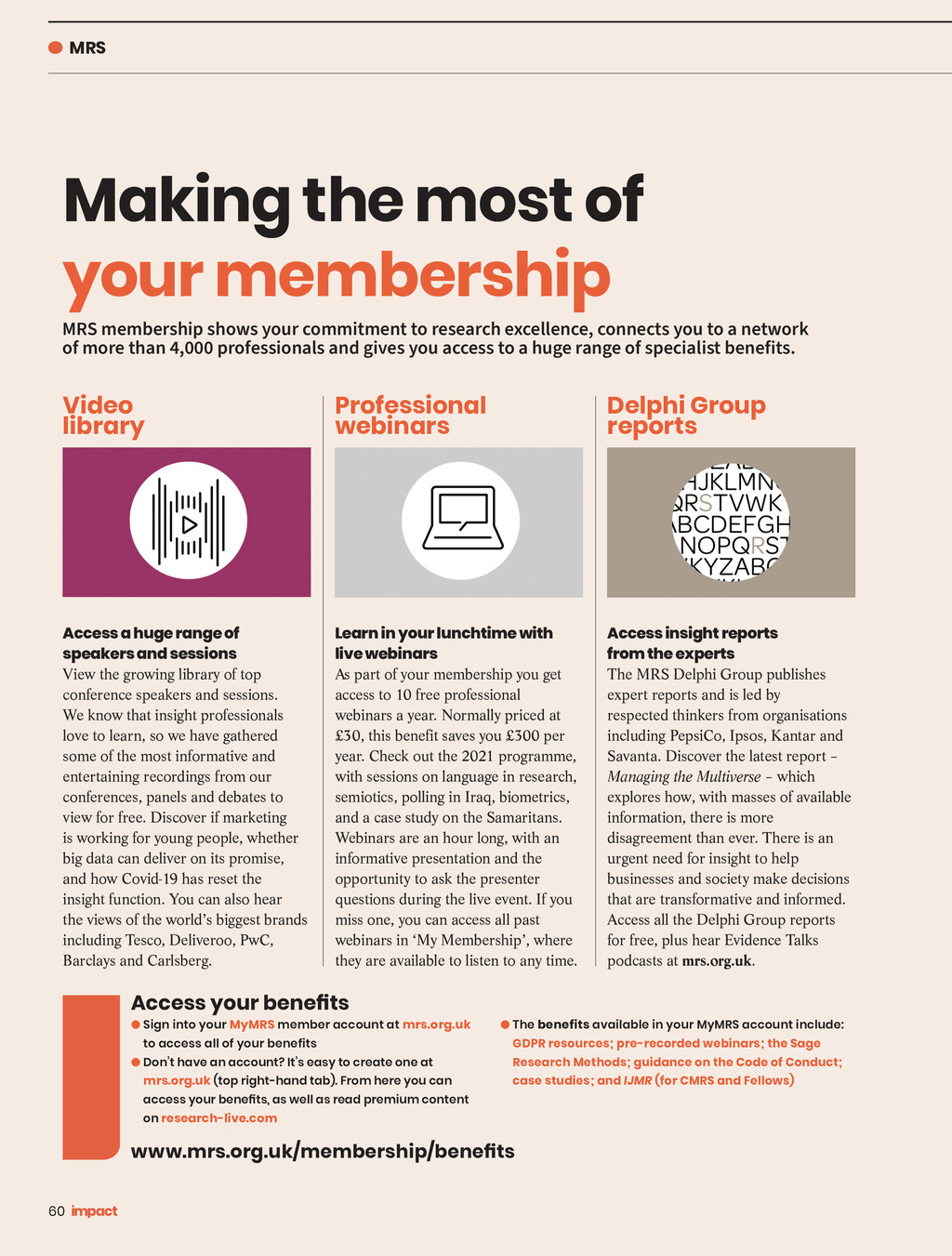 MRS Making the most of your membership MRS membership shows your commitment to research excellence, connects you to a network of more than 4,000 professionals and gives you access to a huge range of specialist benefits. Video library Professional webinars Delphi Group reports Access a huge range of speakers and sessions Learn in your lunchtime with live webinars Access insight reports from the experts View the growing library of top conference speakers and sessions. We know that insight professionals love to learn, so we have gathered some of the most informative and entertaining recordings from our conferences, panels and debates to view for free. Discover if marketing is working for young people, whether big data can deliver on its promise, and how Covid-19 has reset the insight function. You can also hear the views of the worlds biggest brands including Tesco, Deliveroo, PwC, Barclays and Carlsberg. As part of your membership you get access to 10 free professional webinars a year. Normally priced at 30, this benefit saves you 300 per year. Check out the 2021 programme, with sessions on language in research, semiotics, polling in Iraq, biometrics, and a case study on the Samaritans. Webinars are an hour long, with an informative presentation and the opportunity to ask the presenter questions during the live event. If you miss one, you can access all past webinars in My Membership, where they are available to listen to any time. The MRS Delphi Group publishes expert reports and is led by respected thinkers from organisations including PepsiCo, Ipsos, Kantar and Savanta. Discover the latest report Managing the Multiverse which explores how, with masses of available information, there is more disagreement than ever. There is an urgent need for insight to help businesses and society make decisions that are transformative and informed. Access all the Delphi Group reports for free, plus hear Evidence Talks podcasts at mrs.org.uk. Sign into your MyMRS member account at mrs.org.uk The benefits available in your MyMRS account include: to access all of your benefits GDPR resources; pre-recorded webinars; the Sage Dont have an account? Its easy to create one at Research Methods; guidance on the Code of Conduct; mrs.org.uk (top right-hand tab). From here you can case studies; and IJMR (for CMRS and Fellows) on research-live.com 60 Impact ISSUE 34 2021_pp58-61_MRS.indd 60 18/06/2021 14:16