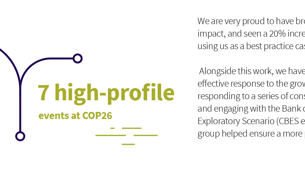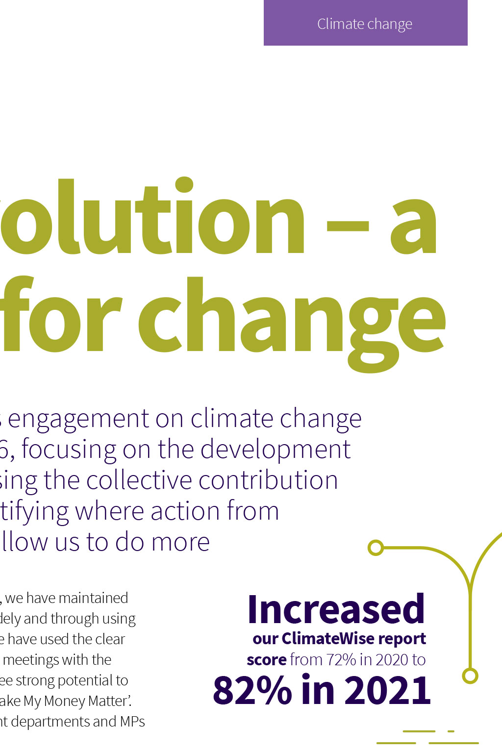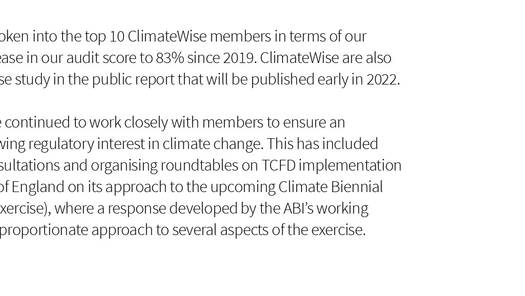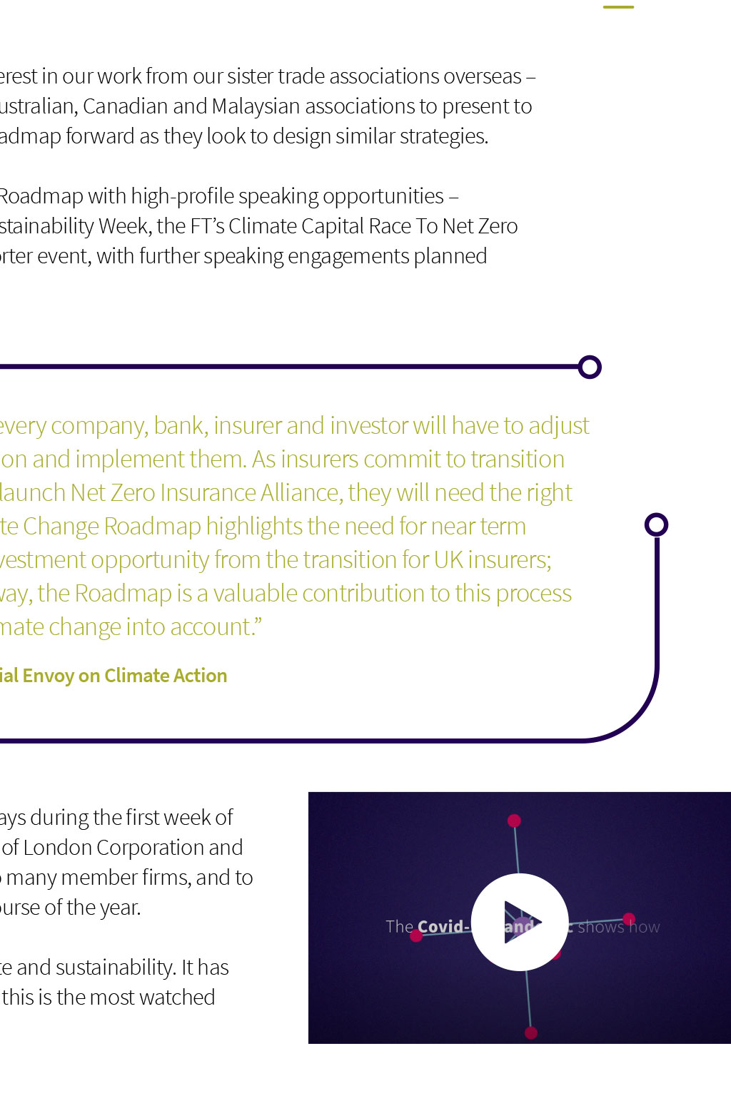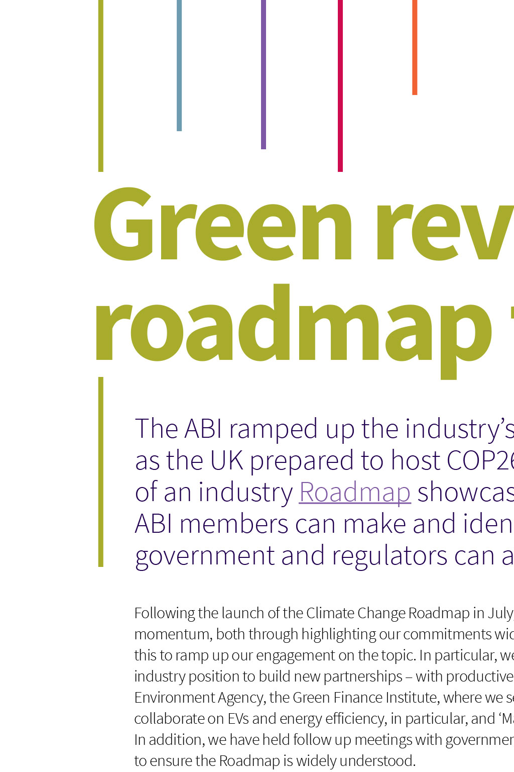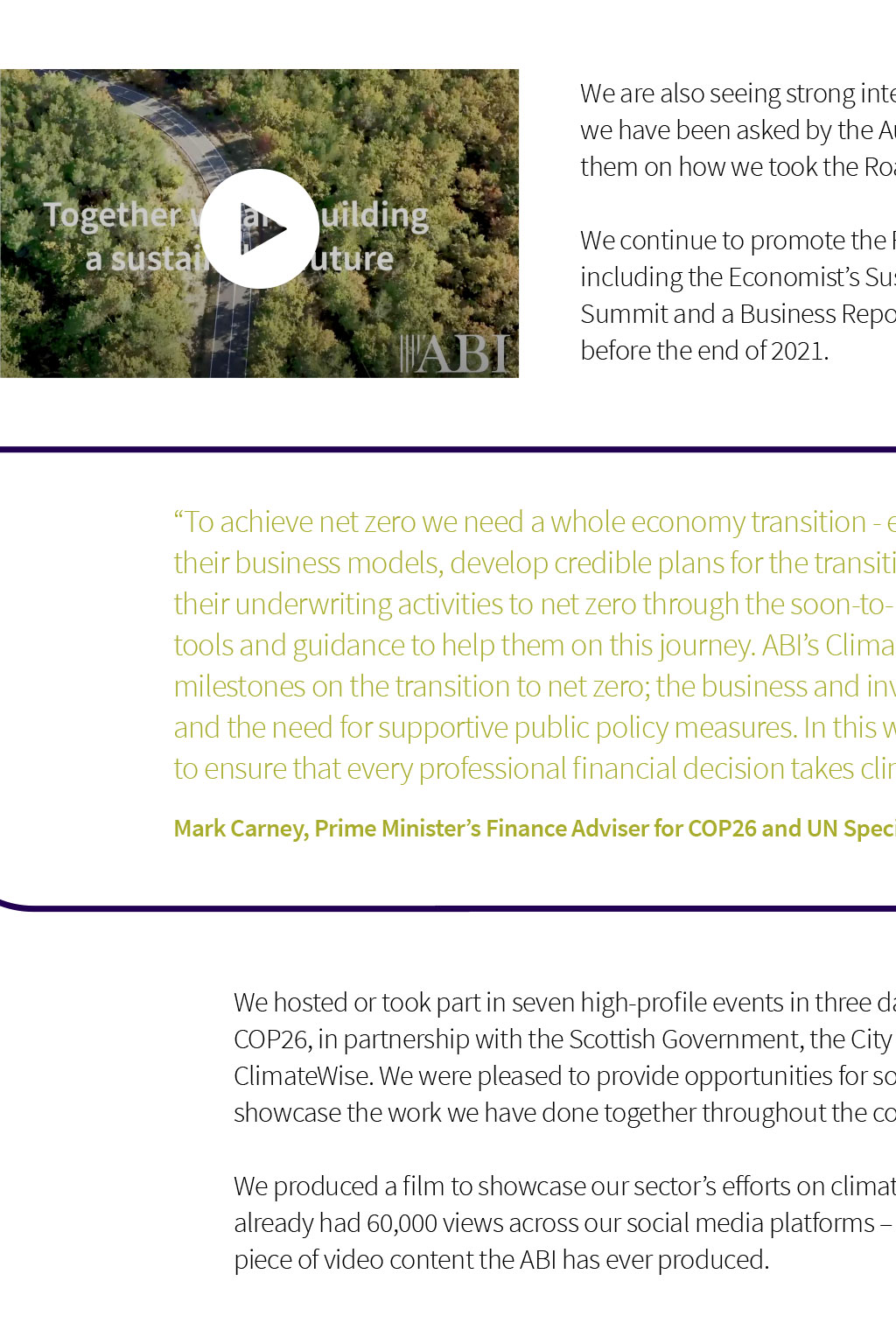 Climate change Green revolution - a roadmap for change The ABI ramped up the industrys engagement on climate change as the UK prepared to host COP26, focusing on the development of an industry Roadmap showcasing the collective contribution ABI members can make and identify where action from Government and regulators can allow us to do more Following the launch of the Climate Change Roadmap in July, we have maintained momentum, both through highlighting our commitments widely and through using this to ramp up our engagement on the topic. In particular, we have used the clear industry position to build new partnerships with productive meetings with the Environment Agency, the Green Finance Institute, where we see strong potential to collaborate on EVs and energy efficiency, in particular, and Make My Money Matter. In addition, we have held follow up meetings with government departments and MPs to ensure the Roadmap is widely understood. Increased our ClimateWise report score from 72% in 2020 to 82% in 2021 We are also seeing strong interest in our work from our sister trade associations overseas we have been asked by the Australian, Canadian and Malaysian associations to present to them on how we took the Roadmap forward as they look to design similar strategies. We continue to promote the Roadmap with high-profile speaking opportunities including the Economists Sustainability Week, the FTs Climate Capital Race To Net Zero Summit and a Business Reporter event, with further speaking engagements planned before the end of 2021. To achieve net zero we need a whole economy transition - every company, bank, insurer and investor will have to adjust their business models, develop credible plans for the transition and implement them. As insurers commit to transition their underwriting activities to net zero through the soon-to-launch Net Zero Insurance Alliance, they will need the right tools and guidance to help them on this journey. ABIs Climate Change Roadmap highlights the need for near term milestones on the transition to net zero; the business and investment opportunity from the transition for UK insurers; and the need for supportive public policy measures. In this way, the Roadmap is a valuable contribution to this process to ensure that every professional financial decision takes climate change into account. Mark Carney, Prime Ministers Finance Adviser for COP26 and UN Special Envoy on Climate Action We hosted or took part in seven high-profile events in three days during the first week of COP26, in partnership with the Scottish Government, the City of London Corporation and ClimateWise. We were pleased to provide opportunities for so many member firms, and to showcase the work we have done together throughout the course of the year. We are very proud to have broken into the top 10 ClimateWise members in terms of our impact, and seen a 20% increase in our audit score to 83% since 2019. ClimateWise are also using us as a best practice case study in the public report that will be published early in 2022. We produced a film to showcase our sectors efforts on climate and sustainability. It has already had 60,000 views across our social media platforms this is the most watched piece of video content the ABI has ever produced. 7 high-profile events at COP26 Alongside this work, we have continued to work closely with members to ensure an effective response to the growing regulatory interest in climate change. This has included responding to a series of consultations and organising roundtables on TCFD implementation and engaging with the Bank of England on its approach to the upcoming Climate Biennial Exploratory Scenario (CBES exercise), where a response developed by the ABIs working group helped ensure a more proportionate approach to several aspects of the exercise.
