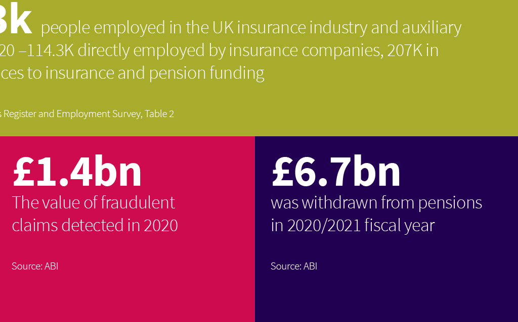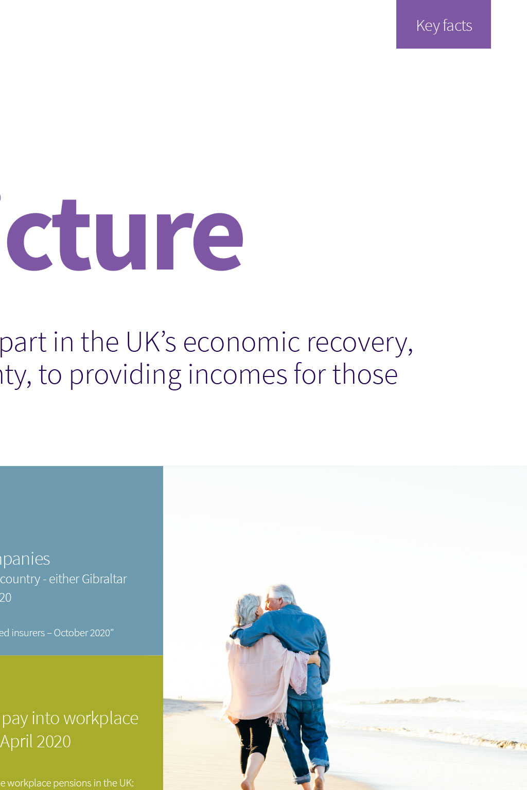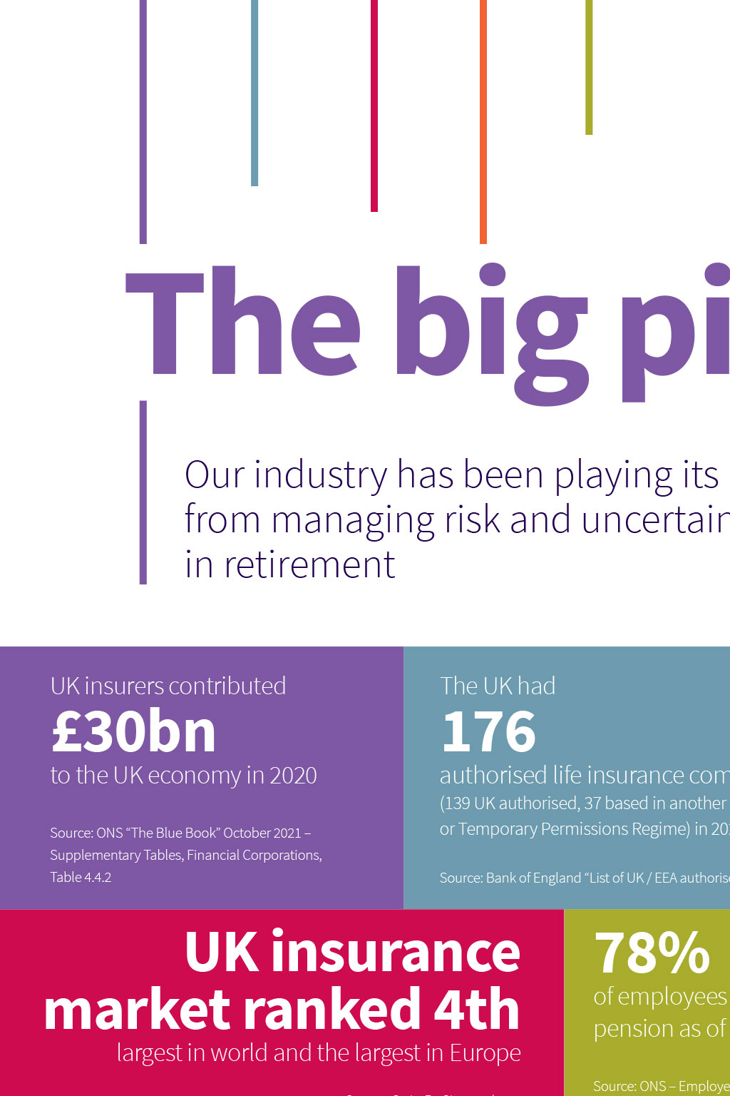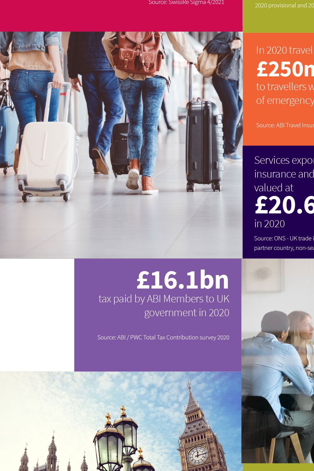 Key facts The big picture Our industry has been playing its part in the UKs economic recovery, from managing risk and uncertainty, to providing incomes for those in retirement UK insurers contributed UK has to the UK economy in 2020 authorised life insurance companies 30bn Source: ONS The Blue Book October 2021 Supplementary Tables, Financial Corporations, Table 4.4.2 176 (139 UK authorised, 37 based in another country - either Gibraltar or Temporary Permissions Regime) in 2020 Source: Bank of England List of UK / EEA authorised insurers October 2020 UK insurance market ranked 4th largest in world and the largest in Europe Source: Bank of England List of UK / EEA authorised insurers October 2020 78% of employees pay into workplace pension as of April 2020 Source: ONS In 2020 travel insurers paid out 250m claims to travellers who needed help. 63m of this was to cover the cost of emergency medical treatment and 148m for cancellations. Source: Travel Insurance 2020 Services exported by UK insurance and LTS industry valued at 20.6bn in 2020 Claims totalling 47.2m incurred each day for motor and property insurance source: Motor Income & Outgo 2020 and Property Income & Outgo 2020 Source: ONS 16.1bn tax paid by ABI Members to UK government in 2020 Source: ABI 321.3k people employed in the UK insurance industry and auxiliary services in 2020 114.3K directly employed by insurance companies, 207K in auxiliary services to insurance and pension funding Source: Industry - Business Register and Employment Survey - Table 2 98% 1.7tn 1.4bn 6.7bn Source: Protection Claims Paid and Denied 2020 Source: Invested Assets 2020 (Total Investment Holdings) Source: General Insurance Detected Fraud 2020 Source: Retirement Income Data: Oct 2020 to March 2021 of protection claims presented paid out The value of invested assets held by ABI in 2020 The value of fraudulent claims detected in 2020 was withdrawn from pensions in 2020/2021 fiscal year