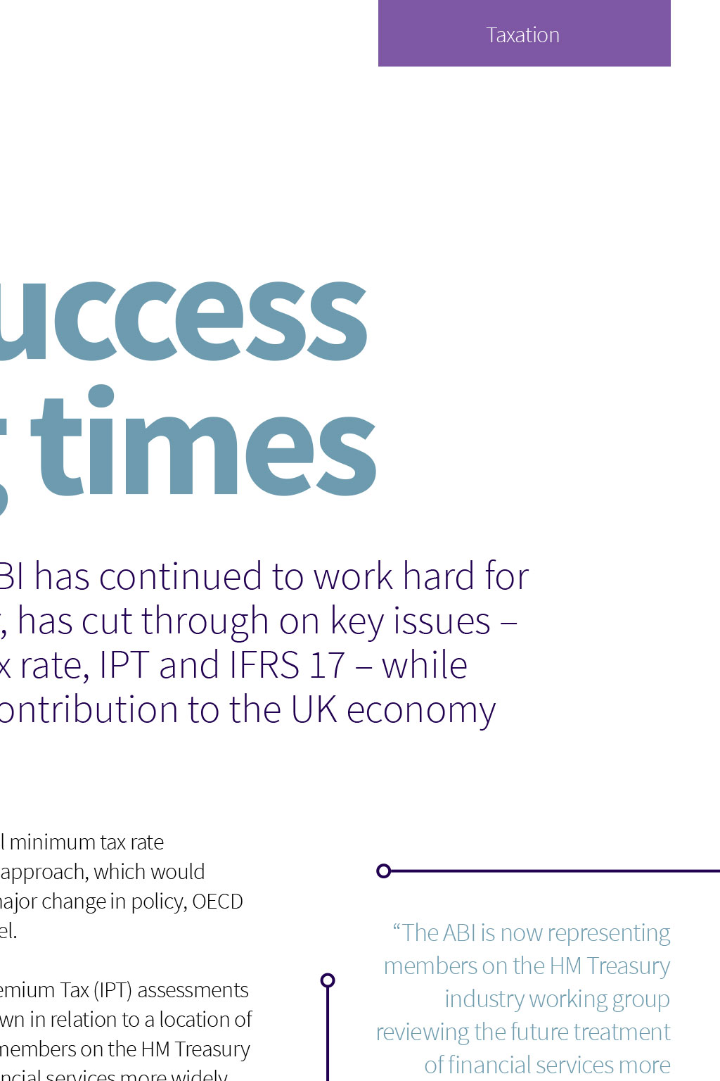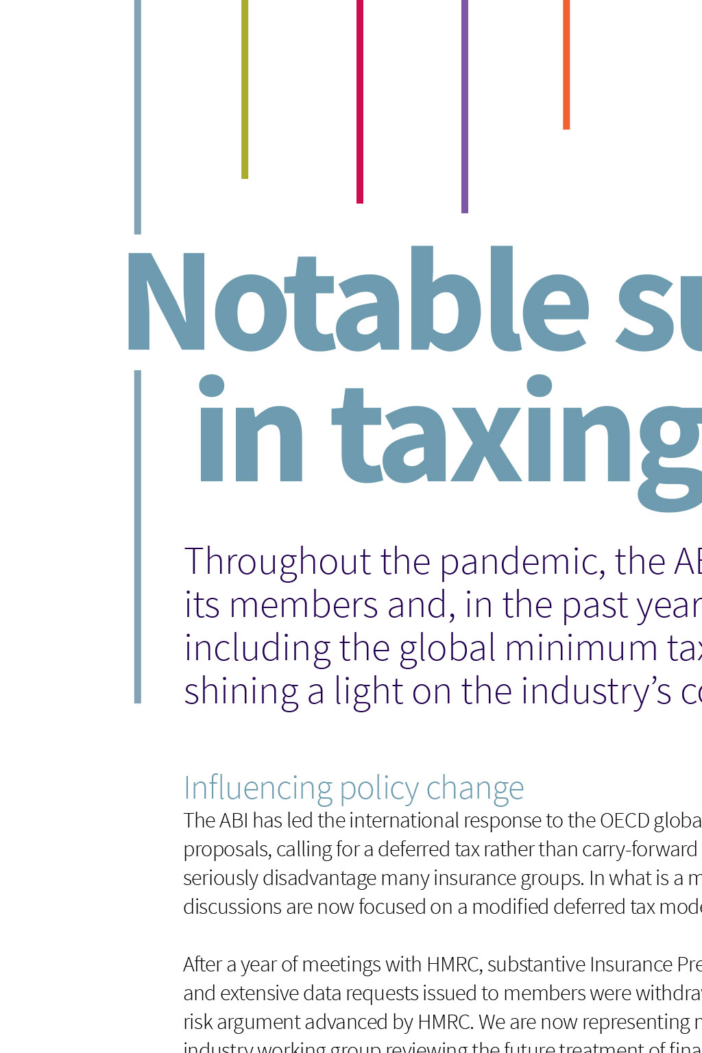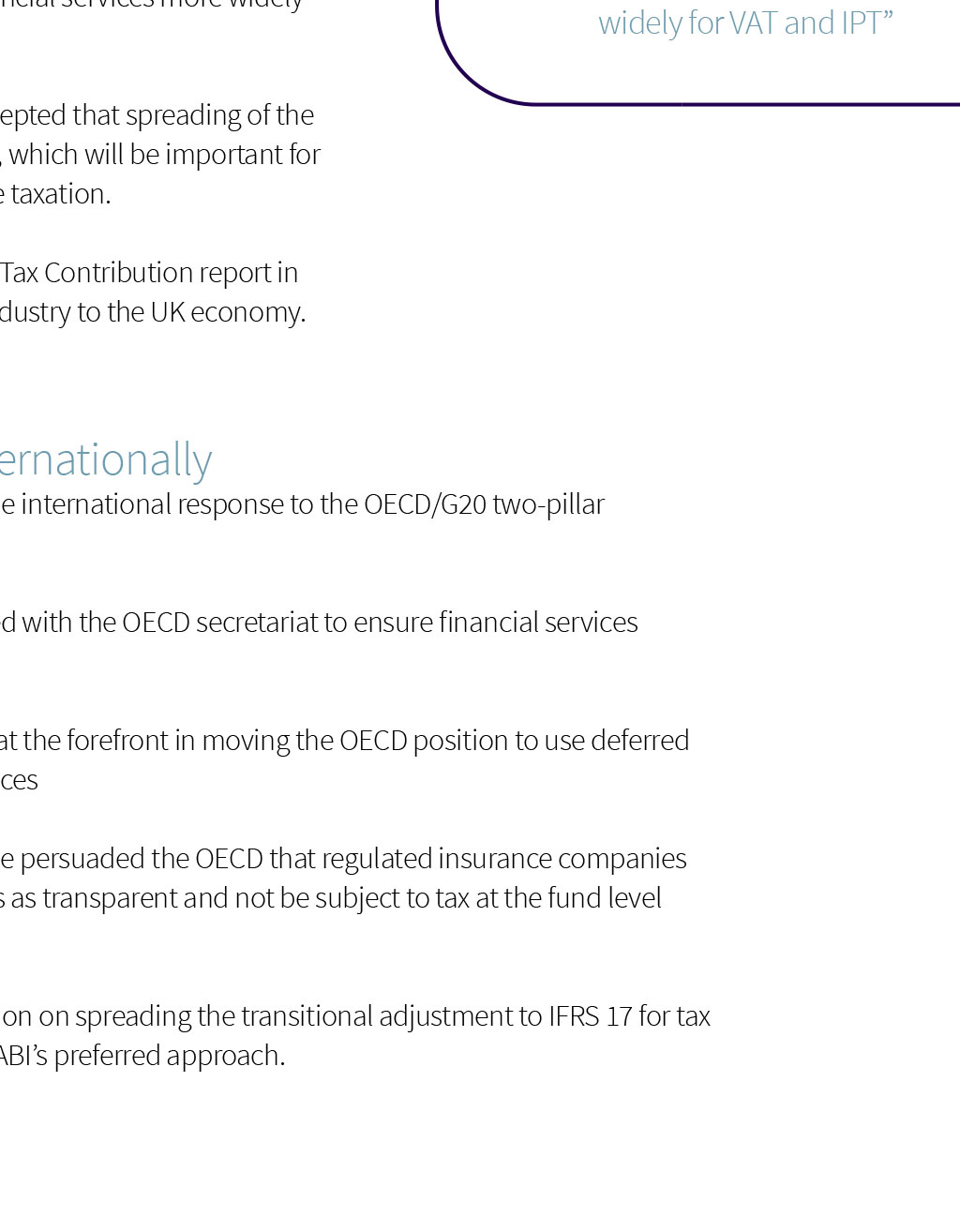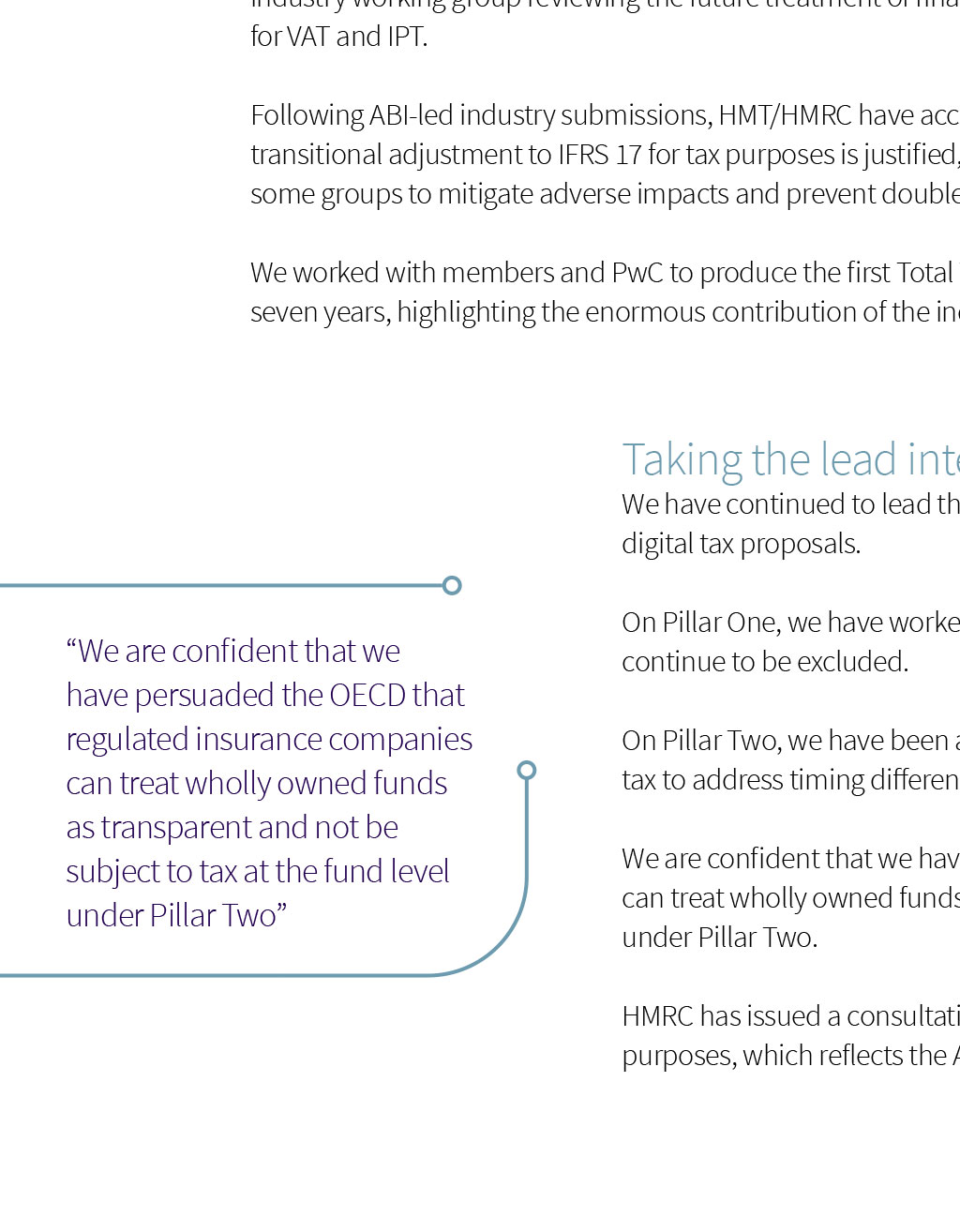 Tax Notable success in taxing times Throughout the pandemic, the ABI has continued to work hard for its members and, in the past year, has cut through on key issues including the global minimum tax rate, IPT and IFRS 17 while shining a light on the industrys contribution to the UK economy Influencing policy change The ABI has led the international response to the OECD global minimum tax rate proposals, calling for a deferred tax rather than carry-forward approach, which would seriously disadvantage many insurance groups. In what is a major change in policy, OECD discussions are now focused on a modified deferred tax model. After a year of meetings with HMRC, substantive Insurance Premium Tax (IPT) assessments and extensive data requests issued to members were withdrawn in relation to a location of risk argument advanced by HMRC. We are now representing members on the HM Treasury industry working group reviewing the future treatment of financial services more widely for VAT and IPT. The ABI is now representing members on the HM Treasury industry working group reviewing the future treatment of financial services more widely for VAT and IPT Following ABI-led industry submissions, HMT/HMRC have accepted that spreading of the transitional adjustment to IFRS 17 for tax purposes is justified, which will be important for some groups to mitigate adverse impacts and prevent double taxation. We worked with members and PwC to produce the first Total Tax Contribution report in seven years, highlighting the enormous contribution of the industry to the UK economy. Taking the lead internationally We have continued to lead the international response to the OECD/G20 two-pillar digital tax proposals. We are confident that we have persuaded the OECD that regulated insurance companies can treat wholly owned funds as transparent and not be subject to tax at the fund level under Pillar Two On Pillar One, we have worked with the OECD secretariat to ensure financial services continue to be excluded. On Pillar Two, we have been at the forefront in moving the OECD position to use deferred tax to address timing differences We are confident that we have persuaded the OECD that regulated insurance companies can treat wholly owned funds as transparent and not be subject to tax at the fund level under Pillar Two. HMRC has issued a consultation on spreading the transitional adjustment to IFRS 17 for tax purposes, which reflects the ABIs preferred approach. The ABI continues to represent members on the HM Treasury industry working group, reviewing the future treatment of financial services more widely for VAT and IPT.