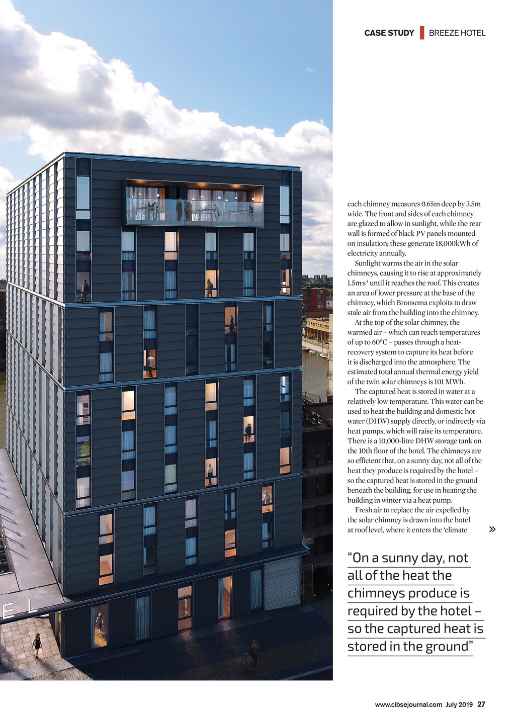 CASE STUDY | BREEZE HOTEL FORCE OF NATURE The 11-storey Breeze Hotel in Amsterdam has a unique natural ventilation system that uses solar chimneys and water droplets sprayed into a shaft to move air around the building. Andy Pearson speaks to the academic behind the concept, Dr Ben Bronsema, and looks at how his earth, wind and fire theory became reality Solar chimney Earth, wind and re concept Climate cascade T he 198-room Breeze Hotel in Amsterdam is a pioneering, ultra-low-energy building. Developed by Amstelius/Dutch Green Company in association with Borghese Real Estate, it is the first building in the world to use the earth, wind and fire natural ventilation concept conceived by engineer Dr Ben Bronsema. As such, it eschews mechanical systems in favour of using the sun, wind and water to heat, cool and ventilate all 11 storeys. Bronsema was inspired to develop the concept after studying how African termites keep the internal temperature of their mounds at a constant 30C, even though external temperatures fluctuate from 50C in the midday sun to almost zero at night. I thought, can we build buildings the way termites do, using natural air conditioning to avoid the need for fans? said Bronsema, in a TEDx talk from 2013. The result of his cogitations was the earth, wind and fire concept, which subsequently became the subject of his PhD at the Technical University, Delft. As part of his research, Bronsema developed the natural air conditioning concept using simple computational modelling. This was refined using computational fluid dynamics and validated using experimental mock-ups of elements of the concept. The Breeze Hotel is the first building to make use of the concept, and Bronsema is working on the project with installation consultant Green Building Engineering and contractor Van Delft. When the hotel opens its doors this summer, some of its more observant guests may notice the two glazed columns on the southwest faade, which rise from the ground floor to the roof of 33m-high building. These are the solar chimneys that help drive the buildings natural air conditioning. In plan, Surplus of cold/warmth is being collected in the underground thermal energy storage 1 Warm air blows inside the turbines on the rooftop 2 Wind pressure pushes warm air into the climate cascade 3 The air is sprinkled with water of 13C 4 Cold air is blown into the building, providing cooling and ventilation 5 Warm air from the building is extracted by the solar chimney 6 The air heats up and ascends in the solar chimney 7 At the top of the solar chimney, the air reaches a heat exchanger 8 Warm air transfers heat to the thermal energy storage through the use of a heat recovery system. Excess air leaves the system Dr Ben Bronsema developed his natural ventilation concept after watching the building skills of termites in Africa 26 July 2019 www.cibsejournal.com CIBSE July19 pp26-28, 30 BreezeHotel.indd 26 21/06/2019 14:46