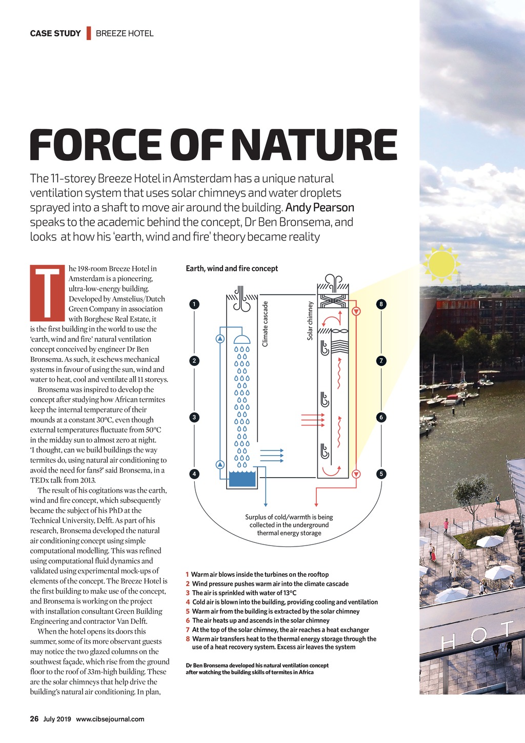 CASE STUDY | BREEZE HOTEL FORCE OF NATURE The 11-storey Breeze Hotel in Amsterdam has a unique natural ventilation system that uses solar chimneys and water droplets sprayed into a shaft to move air around the building. Andy Pearson speaks to the academic behind the concept, Dr Ben Bronsema, and looks at how his earth, wind and fire theory became reality Solar chimney Earth, wind and re concept Climate cascade T he 198-room Breeze Hotel in Amsterdam is a pioneering, ultra-low-energy building. Developed by Amstelius/Dutch Green Company in association with Borghese Real Estate, it is the first building in the world to use the earth, wind and fire natural ventilation concept conceived by engineer Dr Ben Bronsema. As such, it eschews mechanical systems in favour of using the sun, wind and water to heat, cool and ventilate all 11 storeys. Bronsema was inspired to develop the concept after studying how African termites keep the internal temperature of their mounds at a constant 30C, even though external temperatures fluctuate from 50C in the midday sun to almost zero at night. I thought, can we build buildings the way termites do, using natural air conditioning to avoid the need for fans? said Bronsema, in a TEDx talk from 2013. The result of his cogitations was the earth, wind and fire concept, which subsequently became the subject of his PhD at the Technical University, Delft. As part of his research, Bronsema developed the natural air conditioning concept using simple computational modelling. This was refined using computational fluid dynamics and validated using experimental mock-ups of elements of the concept. The Breeze Hotel is the first building to make use of the concept, and Bronsema is working on the project with installation consultant Green Building Engineering and contractor Van Delft. When the hotel opens its doors this summer, some of its more observant guests may notice the two glazed columns on the southwest faade, which rise from the ground floor to the roof of 33m-high building. These are the solar chimneys that help drive the buildings natural air conditioning. In plan, Surplus of cold/warmth is being collected in the underground thermal energy storage 1 Warm air blows inside the turbines on the rooftop 2 Wind pressure pushes warm air into the climate cascade 3 The air is sprinkled with water of 13C 4 Cold air is blown into the building, providing cooling and ventilation 5 Warm air from the building is extracted by the solar chimney 6 The air heats up and ascends in the solar chimney 7 At the top of the solar chimney, the air reaches a heat exchanger 8 Warm air transfers heat to the thermal energy storage through the use of a heat recovery system. Excess air leaves the system Dr Ben Bronsema developed his natural ventilation concept after watching the building skills of termites in Africa 26 July 2019 www.cibsejournal.com CIBSE July19 pp26-28, 30 BreezeHotel.indd 26 21/06/2019 14:46