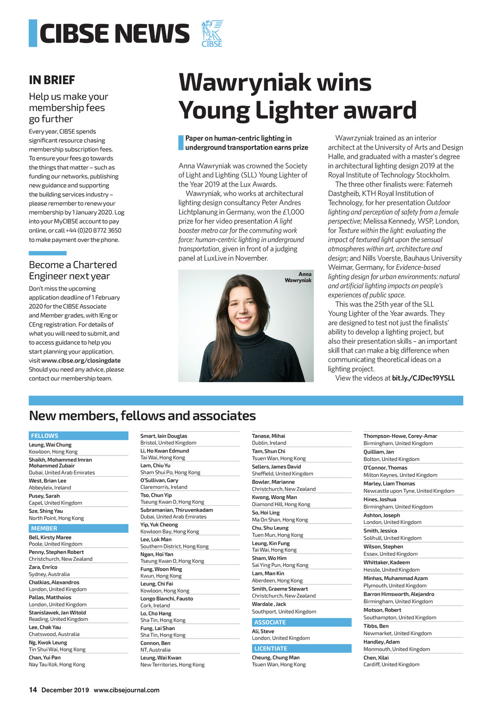 CIBSE NEWS Wawryniak wins Young Lighter award IN BRIEF Help us make your membership fees go further Every year, CIBSE spends significant resource chasing membership subscription fees. To ensure your fees go towards the things that matter such as funding our networks, publishing new guidance and supporting the building services industry please remember to renew your membership by 1 January 2020. Log into your MyCIBSE account to pay online, or call +44 (0)20 8772 3650 to make payment over the phone. Paper on human-centric lighting in underground transportation earns prize Anna Wawryniak was crowned the Society of Light and Lighting (SLL) Young Lighter of the Year 2019 at the Lux Awards. Wawryniak, who works at architectural lighting design consultancy Peter Andres Lichtplanung in Germany, won the 1,000 prize for her video presentation A light booster metro car for the commuting work force: human-centric lighting in underground transportation, given in front of a judging panel at LuxLive in November. Become a Chartered Engineer next year Anna Wawryniak Dont miss the upcoming application deadline of 1 February 2020 for the CIBSE Associate and Member grades, with IEng or CEng registration. For details of what you will need to submit, and to access guidance to help you start planning your application, visit www.cibse.org/closingdate Should you need any advice, please contact our membership team. Wawrzyniak trained as an interior architect at the University of Arts and Design Halle, and graduated with a masters degree in architectural lighting design 2019 at the Royal Institute of Technology Stockholm. The three other finalists were: Fatemeh Dastgheib, KTH Royal Institution of Technology, for her presentation Outdoor lighting and perception of safety from a female perspective; Melissa Kennedy, WSP, London, for Texture within the light: evaluating the impact of textured light upon the sensual atmospheres within art, architecture and design; and Nills Voerste, Bauhaus University Weimar, Germany, for Evidence-based lighting design for urban environments: natural and artificial lighting impacts on peoples experiences of public space. This was the 25th year of the SLL Young Lighter of the Year awards. They are designed to test not just the finalists ability to develop a lighting project, but also their presentation skills an important skill that can make a big difference when communicating theoretical ideas on a lighting project. View the videos at bit.ly./CJDec19YSLL New members, fellows and associates FELLOWS Leung, Wai Chung Kowloon, Hong Kong Shaikh, Mohammed Imran Mohammed Zubair Dubai, United Arab Emirates West, Brian Lee Abbeyleix, Ireland Pusey, Sarah Capel, United Kingdom Sze, Shing Yau North Point, Hong Kong MEMBER Bell, Kirsty Maree Poole, United Kingdom Penny, Stephen Robert Christchurch, New Zealand Zara, Enrico Sydney, Australia Chalkias, Alexandros London, United Kingdom Pallas, Matthaios London, United Kingdom Stanislawek, Jan Witold Reading, United Kingdom Lee, Chak Yau Chatswood, Australia Ng, Kwok Leung Tin Shui Wai, Hong Kong Chan, Yui Pan Nay Tau Kok, Hong Kong Smart, Iain Douglas Bristol, United Kingdom Li, Ho Kwan Edmund Tai Wai, Hong Kong Lam, Chiu Yu Sham Shui Po, Hong Kong OSullivan, Gary Claremorris, Ireland Tso, Chun Yip Tseung Kwan O, Hong Kong Subramanian, Thiruvenkadam Dubai, United Arab Emirates Yip, Yuk Cheong Kowloon Bay, Hong Kong Lee, Lok Man Southern District, Hong Kong Ngan, Hoi Yan Tseung Kwan O, Hong Kong Fung, Woon Ming Kwun, Hong Kong Leung, Chi Fai Kowloon, Hong Kong Longo Bianchi, Fausto Cork, Ireland Lo, Cho Hang Sha Tin, Hong Kong Fung, Lai Shan Sha Tin, Hong Kong Connon, Ben NT, Australia Leung, Wai Kwan New Territories, Hong Kong Tanase, Mihai Dublin, Ireland Thompson-Howe, Corey-Amar Birmingham, United Kingdom Tam, Shun Chi Tsuen Wan, Hong Kong Quilliam, Jan Bolton, United Kingdom Sellers, James David Sheffield, United Kingdom OConnor, Thomas Milton Keynes, United Kingdom Bowler, Marianne Christchurch, New Zealand Marley, Liam Thomas Newcastle upon Tyne, United Kingdom Kwong, Wong Man Diamond Hill, Hong Kong So, Hoi Ling Ma On Shan, Hong Kong Chu, Shu Leung Tuen Mun, Hong Kong Leung, Kin Fung Tai Wai, Hong Kong Sham, Wo Him Sai Ying Pun, Hong Kong Lam, Man Kin Aberdeen, Hong Kong Smith, Graeme Stewart Christchurch, New Zealand Wardale , Jack Southport, United Kingdom ASSOCIATE Ali, Steve London, United Kingdom LICENTIATE Cheung, Chung Man Tsuen Wan, Hong Kong Hines, Joshua Birmingham, United Kingdom Ashton, Joseph London, United Kingdom Smith, Jessica Solihull, United Kingdom Wilson, Stephen Essex, United Kingdom Whittaker, Kadeem Hessle, United Kingdom Minhas, Muhammad Azam Plymouth, United Kingdom Barron Himsworth, Alejandro Birmingham, United Kingdom Motson, Robert Southampton, United Kingdom Tibbs, Ben Newmarket, United Kingdom Handley, Adam Monmouth, United Kingdom Chen, Xilai Cardiff, United Kingdom 14 December 2019 www.cibsejournal.com CIBSE Dec19 pp14-15 CIBSE News.indd 14 22/11/2019 15:14