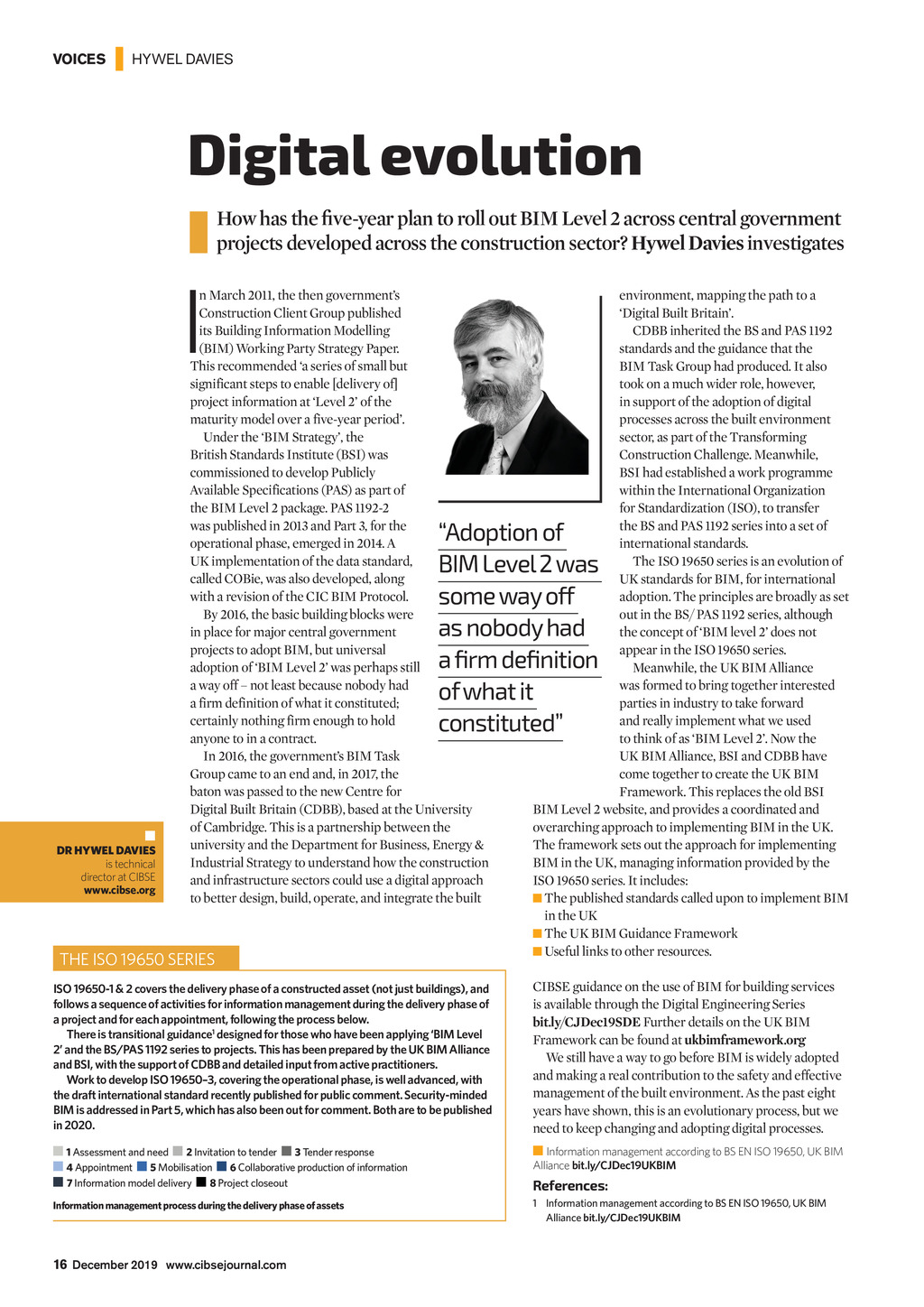 VOICES | HYWEL DAVIES Digital evolution How has the five-year plan to roll out BIM Level 2 across central government projects developed across the construction sector? Hywel Davies investigates I n March 2011, the then governments Construction Client Group published its Building Information Modelling (BIM) Working Party Strategy Paper. This recommended a series of small but significant steps to enable [delivery of] project information at Level 2 of the maturity model over a five-year period. Under the BIM Strategy, the British Standards Institute (BSI) was commissioned to develop Publicly Available Specifications (PAS) as part of the BIM Level 2 package. PAS 1192-2 was published in 2013 and Part 3, for the operational phase, emerged in 2014. A UK implementation of the data standard, called COBie, was also developed, along with a revision of the CIC BIM Protocol. By 2016, the basic building blocks were in place for major central government projects to adopt BIM, but universal adoption of BIM Level 2 was perhaps still a way off not least because nobody had a firm definition of what it constituted; certainly nothing firm enough to hold anyone to in a contract. In 2016, the governments BIM Task Group came to an end and, in 2017, the baton was passed to the new Centre for Digital Built Britain (CDBB), based at the University of Cambridge. This is a partnership between the university and the Department for Business, Energy & Industrial Strategy to understand how the construction and infrastructure sectors could use a digital approach to better design, build, operate, and integrate the built environment, mapping the path to a Digital Built Britain. CDBB inherited the BS and PAS 1192 standards and the guidance that the BIM Task Group had produced. It also took on a much wider role, however, in support of the adoption of digital processes across the built environment sector, as part of the Transforming Construction Challenge. Meanwhile, BSI had established a work programme within the International Organization for Standardization (ISO), to transfer the BS and PAS 1192 series into a set of international standards. The ISO 19650 series is an evolution of UK standards for BIM, for international adoption. The principles are broadly as set out in the BS/ PAS 1192 series, although the concept of BIM level 2 does not appear in the ISO 19650 series. Meanwhile, the UK BIM Alliance was formed to bring together interested parties in industry to take forward and really implement what we used to think of as BIM Level 2. Now the UK BIM Alliance, BSI and CDBB have come together to create the UK BIM Framework. This replaces the old BSI BIM Level 2 website, and provides a coordinated and overarching approach to implementing BIM in the UK. The framework sets out the approach for implementing BIM in the UK, managing information provided by the ISO 19650 series. It includes: The published standards called upon to implement BIM in the UK The UK BIM Guidance Framework Useful links to other resources. Adoption of BIM Level 2 was some way off as nobody had a firm definition of what it constituted DR HYWEL DAVIES is technical director at CIBSE www.cibse.org THE ISO 19650 SERIES ISO 19650-1 & 2 covers the delivery phase of a constructed asset (not just buildings), and follows a sequence of activities for information management during the delivery phase of a project and for each appointment, following the process below. There is transitional guidance1 designed for those who have been applying BIM Level 2 and the BS/PAS 1192 series to projects. This has been prepared by the UK BIM Alliance and BSI, with the support of CDBB and detailed input from active practitioners. Work to develop ISO 196503, covering the operational phase, is well advanced, with the draft international standard recently published for public comment. Security-minded BIM is addressed in Part 5, which has also been out for comment. Both are to be published in 2020. CIBSE guidance on the use of BIM for building services is available through the Digital Engineering Series bit.ly/CJDec19SDE Further details on the UK BIM Framework can be found at ukbimframework.org We still have a way to go before BIM is widely adopted and making a real contribution to the safety and effective management of the built environment. As the past eight years have shown, this is an evolutionary process, but we need to keep changing and adopting digital processes. 1 Assessment and need 2 Invitation to tender 3 Tender response 4 Appointment 5 Mobilisation 6 Collaborative production of information 7 Information model delivery 8 Project closeout Information management according to BS EN ISO 19650, UK BIM Information management process during the delivery phase of assets 1 Information management according to BS EN ISO 19650, UK BIM Alliance bit.ly/CJDec19UKBIM Alliance bit.ly/CJDec19UKBIM References: 16 December 2019 www.cibsejournal.com CIBSE Dec19 pp16 Hywel Davies.indd 16 22/11/2019 15:14