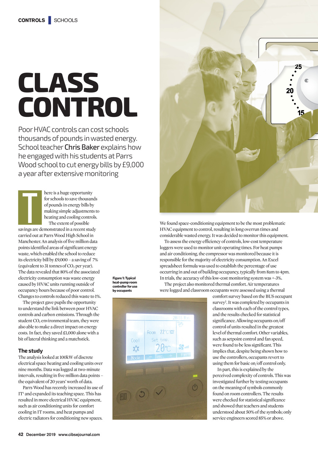 CONTROLS | SCHOOLS CLASS CONTROL Poor HVAC controls can cost schools thousands of pounds in wasted energy. School teacher Chris Baker explains how he engaged with his students at Parrs Wood school to cut energy bills by 9,000 a year after extensive monitoring T here is a huge opportunity for schools to save thousands of pounds in energy bills by making simple adjustments to heating and cooling controls. The extent of possible savings are demonstrated in a recent study carried out at Parrs Wood High School in Manchester. An analysis of five million data points identified areas of significant energy waste, which enabled the school to reduce its electricity bill by 9,000 a saving of 7% (equivalent to 31 tonnes of CO2 per year). The data revealed that 80% of the associated electricity consumption was waste energy caused by HVAC units running outside of occupancy hours because of poor control. Changes to controls reduced this waste to 1%. The project gave pupils the opportunity to understand the link between poor HVAC controls and carbon emissions. Through the student CO2 environmental team, they were also able to make a direct impact on energy costs. In fact, they saved 1,000 alone with a bit of lateral thinking and a matchstick. The study The analysis looked at 100kW of discrete electrical space heating and cooling units over nine months. Data was logged at two-minute intervals, resulting in five million data points the equivalent of 20 years worth of data. Parrs Wood has recently increased its use of IT1 and expanded its teaching space. This has resulted in more electrical HVAC equipment, such as air conditioning units for comfort cooling in IT rooms, and heat pumps and electric radiators for conditioning new spaces. Figure 1: Typical heat-pump room controller for use by occupants We found space-conditioning equipment to be the most problematic HVAC equipment to control, resulting in long overrun times and considerable wasted energy. It was decided to monitor this equipment. To assess the energy efficiency of controls, low-cost temperature loggers were used to monitor unit operating times. For heat pumps and air conditioning, the compressor was monitored because it is responsible for the majority of electricity consumption. An Excel spreadsheet formula was used to establish the percentage of use occurring in and out of building occupancy, typically from 8am to 4pm. In trials, the accuracy of this low-cost monitoring system was +-3%. The project also monitored thermal comfort. Air temperatures were logged and classroom occupants were assessed using a thermal comfort survey based on the BUS occupant survey2. It was completed by occupants in classrooms with each of the control types, and the results checked for statistical significance. Allowing occupants on/off control of units resulted in the greatest level of thermal comfort. Other variables, such as setpoint control and fan speed, were found to be less significant. This implies that, despite being shown how to use the controllers, occupants revert to using them for basic on/off control only. In part, this is explained by the perceived complexity of controls. This was investigated further by testing occupants on the meaning of symbols commonly found on room controllers. The results were checked for statistical significance and showed that teachers and students understood about 50% of the symbols; only service engineers scored 85% or above. 42 December 2019 www.cibsejournal.com CIBSE Dec19 pp42-44 Schools controls.indd 42 22/11/2019 15:42