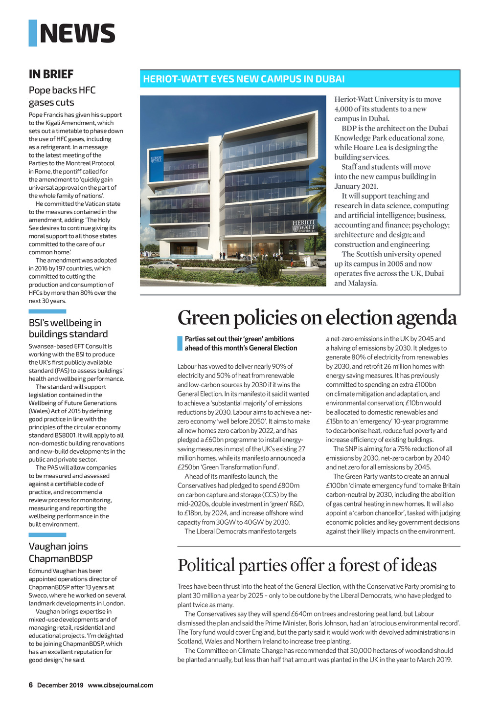 EWS IN BRIEF Pope backs HFC gases cuts HERIOT-WATT EYES NEW CAMPUS IN DUBAI Heriot-Watt University is to move 4,000 of its students to a new campus in Dubai. BDP is the architect on the Dubai Knowledge Park educational zone, while Hoare Lea is designing the building services. Staff and students will move into the new campus building in January 2021. It will support teaching and research in data science, computing and artificial intelligence; business, accounting and finance; psychology; architecture and design; and construction and engineering. The Scottish university opened up its campus in 2005 and now operates five across the UK, Dubai and Malaysia. Pope Francis has given his support to the Kigali Amendment, which sets out a timetable to phase down the use of HFC gases, including as a refrigerant. In a message to the latest meeting of the Parties to the Montreal Protocol in Rome, the pontiff called for the amendment to quickly gain universal approval on the part of the whole family of nations. He committed the Vatican state to the measures contained in the amendment, adding: The Holy See desires to continue giving its moral support to all those states committed to the care of our common home. The amendment was adopted in 2016 by 197 countries, which committed to cutting the production and consumption of HFCs by more than 80% over the next 30 years. BSIs wellbeing in buildings standard Swansea-based EFT Consult is working with the BSI to produce the UKs first publicly available standard (PAS) to assess buildings health and wellbeing performance. The standard will support legislation contained in the Wellbeing of Future Generations (Wales) Act of 2015 by defining good practice in line with the principles of the circular economy standard BS8001. It will apply to all non-domestic building renovations and new-build developments in the public and private sector. The PAS will allow companies to be measured and assessed against a certifiable code of practice, and recommend a review process for monitoring, measuring and reporting the wellbeing performance in the built environment. Vaughan joins ChapmanBDSP Edmund Vaughan has been appointed operations director of ChapmanBDSP after 13 years at Sweco, where he worked on several landmark developments in London. Vaughan brings expertise in mixed-use developments and of managing retail, residential and educational projects. Im delighted to be joining ChapmanBDSP, which has an excellent reputation for good design, he said. Green policies on election agenda Parties set out their green ambitions ahead of this months General Election Labour has vowed to deliver nearly 90% of electricity and 50% of heat from renewable and low-carbon sources by 2030 if it wins the General Election. In its manifesto it said it wanted to achieve a substantial majority of emissions reductions by 2030. Labour aims to achieve a netzero economy well before 2050. It aims to make all new homes zero carbon by 2022, and has pledged a 60bn programme to install energysaving measures in most of the UKs existing 27 million homes, while its manifesto announced a 250bn Green Transformation Fund. Ahead of its manifesto launch, the Conservatives had pledged to spend 800m on carbon capture and storage (CCS) by the mid-2020s, double investment in green R&D, to 18bn, by 2024, and increase offshore wind capacity from 30GW to 40GW by 2030. The Liberal Democrats manifesto targets a net-zero emissions in the UK by 2045 and a halving of emissions by 2030. It pledges to generate 80% of electricity from renewables by 2030, and retrofit 26 million homes with energy saving measures. It has previously committed to spending an extra 100bn on climate mitigation and adaptation, and environmental conservation; 10bn would be allocated to domestic renewables and 15bn to an emergency 10-year programme to decarbonise heat, reduce fuel poverty and increase efficiency of existing buildings. The SNP is aiming for a 75% reduction of all emissions by 2030, net-zero carbon by 2040 and net zero for all emissions by 2045. The Green Party wants to create an annual 100bn climate emergency fund to make Britain carbon-neutral by 2030, including the abolition of gas central heating in new homes. It will also appoint a carbon chancellor, tasked with judging economic policies and key government decisions against their likely impacts on the environment. Political parties offer a forest of ideas Trees have been thrust into the heat of the General Election, with the Conservative Party promising to plant 30 million a year by 2025 only to be outdone by the Liberal Democrats, who have pledged to plant twice as many. The Conservatives say they will spend 640m on trees and restoring peat land, but Labour dismissed the plan and said the Prime Minister, Boris Johnson, had an atrocious environmental record. The Tory fund would cover England, but the party said it would work with devolved administrations in Scotland, Wales and Northern Ireland to increase tree planting. The Committee on Climate Change has recommended that 30,000 hectares of woodland should be planted annually, but less than half that amount was planted in the UK in the year to March 2019. 6 December 2019 www.cibsejournal.com CIBSE Dec19 pp06-07 News.indd 6 22/11/2019 16:55