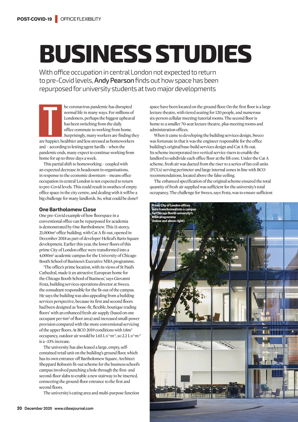 POST-COVID-19 | OFFICE FLEXIBILITY BUSINESS STUDIES With office occupation in central London not expected to return to pre-Covid levels, Andy Pearson finds out how space has been repurposed for university students at two major developments T he coronavirus pandemic has disrupted normal life in many ways. For millions of Londoners, perhaps the biggest upheaval has been switching from the daily office commute to working from home. Surprisingly, many workers are finding they are happier, healthier and less stressed as homeworkers and according to letting agent Savills when the pandemic ends, many expect to continue working from home for up to three days a week. This partial shift to homeworking coupled with an expected decrease in headcount in organisations, in response to the economic downturn means office occupation in central London is not expected to return to pre-Covid levels. This could result in swathes of empty office space in the city centre, and dealing with it will be a big challenge for many landlords. So, what could be done? One Bartholomew Close One pre-Covid example of how floorspace in a conventional office can be repurposed for academia is demonstrated by One Bartholomew. This 11-storey, 21,000m2 office building, with Cat A fit-out, opened in December 2018 as part of developer Helicals Barts Square development. Earlier this year, the lower floors of this prime City of London office were transformed into a 4,000m2 academic campus for the University of Chicago Booth School of Businesss Executive MBA programme. The offices prime location, with its views of St Pauls Cathedral, made it an attractive European home for the Chicago Booth School of Business, says Giovanni Festa, building services operations director at Sweco, the consultant responsible for the fit-out of the campus. He says the building was also appealing from a building services perspective, because its first and second floors had been designed as loose-fit, flexible, boutique trading floors with an enhanced fresh-air supply (based on one occupant per 6m2 of floor area) and increased small-power provision compared with the more conventional servicing of the upper floors. At BCO 2019 conditions with 1:8m2 occupancy, outdoor air would be 1.65 Ls-1m-2, so 2.2 Ls-1m-2 is a ~33% increase. The university has also leased a large, empty, selfcontained retail unit on the buildings ground floor, which has its own entrance off Bartholomew Square. Architect Sheppard Robsons fit-out scheme for the business schools campus involved punching a hole through the first- and second-floor slabs to enable a new stairway to be inserted, connecting the ground-floor entrance to the first and second floors. The universitys eating area and multi-purpose function space have been located on the ground floor. On the first floor is a large lecture theatre, with tiered seating for 120 people, and numerous six-person cellular meeting/tutorial rooms. The second floor is home to a smaller 70-seat lecture theatre, plus meeting rooms and administration offices. When it came to developing the building services design, Sweco was fortunate in that it was the engineer responsible for the office buildings original base-build services design and Cat A fit-out. Its scheme incorporated two vertical service risers to enable the landlord to subdivide each office floor at the lift core. Under the Cat A scheme, fresh air was ducted from the riser to a series of fan coil units (FCUs) serving perimeter and large internal zones in line with BCO recommendations, located above the false ceiling. The enhanced specification of the original scheme ensured the total quantity of fresh air supplied was sufficient for the universitys total occupancy. The challenge for Sweco, says Festa, was to ensure sufficient Prime City of London ofces were transformed into a campus for Chicago Booth universitys MBA programme (below and above right) 20 December 2020 www.cibsejournal.com CIBSE Dec20 pp20-22 Covid office flexibility .indd 20 20/11/2020 14:57