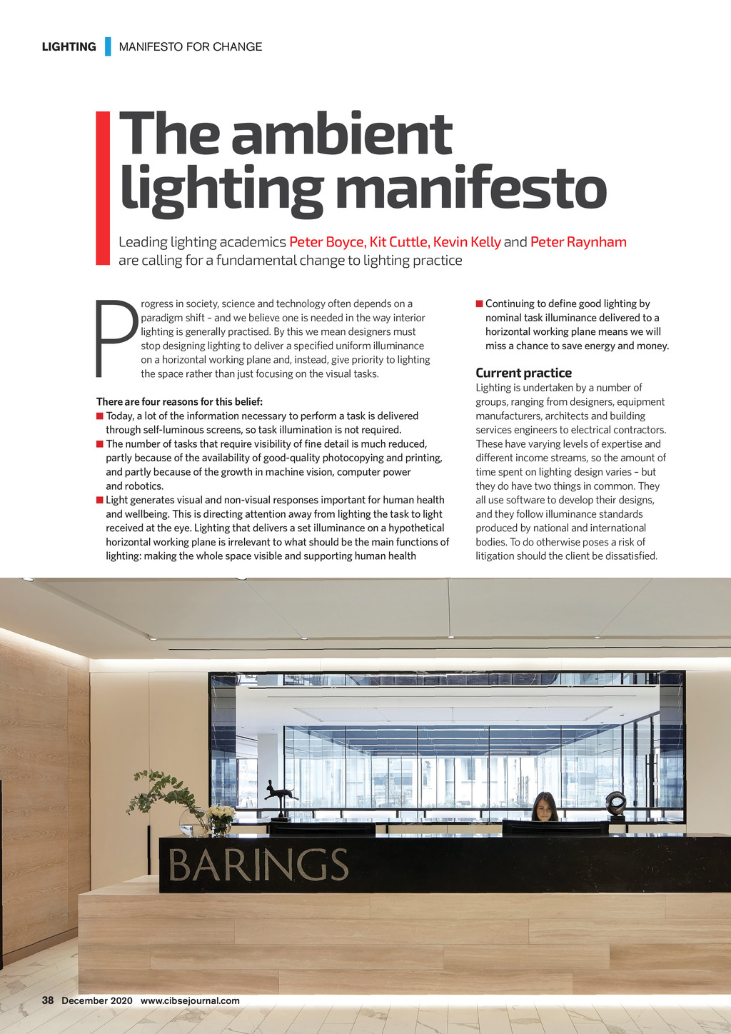 LIGHTING | MANIFESTO FOR CHANGE The ambient lighting manifesto Leading lighting academics Peter Boyce, Kit Cuttle, Kevin Kelly and Peter Raynham are calling for a fundamental change to lighting practice P rogress in society, science and technology often depends on a paradigm shift and we believe one is needed in the way interior lighting is generally practised. By this we mean designers must stop designing lighting to deliver a specified uniform illuminance on a horizontal working plane and, instead, give priority to lighting the space rather than just focusing on the visual tasks. There are four reasons for this belief: Today, a lot of the information necessary to perform a task is delivered through self-luminous screens, so task illumination is not required. The number of tasks that require visibility of fine detail is much reduced, partly because of the availability of good-quality photocopying and printing, and partly because of the growth in machine vision, computer power and robotics. Light generates visual and non-visual responses important for human health and wellbeing. This is directing attention away from lighting the task to light received at the eye. Lighting that delivers a set illuminance on a hypothetical horizontal working plane is irrelevant to what should be the main functions of lighting: making the whole space visible and supporting human health Continuing to define good lighting by nominal task illuminance delivered to a horizontal working plane means we will miss a chance to save energy and money. Current practice Lighting is undertaken by a number of groups, ranging from designers, equipment manufacturers, architects and building services engineers to electrical contractors. These have varying levels of expertise and different income streams, so the amount of time spent on lighting design varies but they do have two things in common. They all use software to develop their designs, and they follow illuminance standards produced by national and international bodies. To do otherwise poses a risk of litigation should the client be dissatisfied. 38 December 2020 www.cibsejournal.com CIBSE Dec20 pp38-39 Supp Ambient lighting.indd 38 20/11/2020 16:03