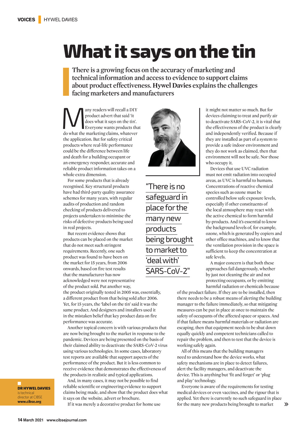 VOICES | HYWEL DAVIES What it says on the tin There is a growing focus on the accuracy of marketing and technical information and access to evidence to support claims about product effectiveness. Hywel Davies explains the challenges facing marketers and manufacturers M any readers will recall a DIY product advert that said it does what it says on the tin. Everyone wants products that do what the marketing claims, whatever the application. But for safety critical products where real-life performance could be the difference between life and death for a building occupant or an emergency responder, accurate and reliable product information takes on a whole extra dimension. For some products that is already recognised. Key structural products have had third-party quality assurance schemes for many years, with regular audits of production and random checking of products delivered to projects undertaken to minimise the risks of defective products being used in real projects. But recent evidence shows that products can be placed on the market that do not meet such stringent requirements. Recently, one such product was found to have been on the market for 15 years, from 2006 onwards, based on fire test results that the manufacturer has now acknowledged were not representative of the product sold. Put another way, the product originally tested in 2005 was, essentially, a different product from that being sold after 2006. Yet, for 15 years, the label on the tin said it was the same product. And designers and installers used it in the mistaken belief that key product data on fire performance was accurate. Another topical concern is with various products that are now being brought to the market in response to the pandemic. Devices are being presented on the basis of their claimed ability to deactivate the SARS-CoV-2 virus using various technologies. In some cases, laboratory test reports are available that support aspects of the performance of the product. But it is less common to receive evidence that demonstrates the effectiveness of the products in realistic and typical applications. And, in many cases, it may not be possible to find reliable scientific or engineering evidence to support claims being made, and show that the product does what it says on the website, advert or brochure. If it was merely a decorative product for home use it might not matter so much. But for devices claiming to treat and purify air to deactivate SARS-CoV-2, it is vital that the effectiveness of the product is clearly and independently verified. Because if they are installed as part of a system to provide a safe indoor environment and they do not work as claimed, then that environment will not be safe. Nor those who occupy it. Devices that use UVC radiation must not emit radiation into occupied areas, as UVC is harmful to humans. Concentrations of reactive chemical species such as ozone must be controlled below safe exposure levels, especially if other constituents of the local atmosphere may react with the active chemical to form harmful by-products. And its essential to know the background levels of, for example, ozone, which is generated by copiers and other office machines, and to know that the ventilation provision in the space is sufficient to keep the concentration at safe levels. A major concern is that both these approaches fail dangerously, whether by just not cleaning the air and not protecting occupants, or by emitting harmful radiation or chemicals because of the product failure. If they are to be installed, then there needs to be a robust means of alerting the building manager to the failure immediately, so that mitigating measures can be put in place at once to maintain the safety of occupants of the affected space or spaces. And if that failure means harmful materials or radiation are escaping, then that equipment needs to be shut down equally quickly and competent technicians called to repair the problem, and then to test that the device is working safely again. All of this means that the building managers need to understand how the device works, what safety mechanisms are in place to detect failures, alert the facility managers, and deactivate the device. This is anything but fit and forget or plug and play technology. Everyone is aware of the requirements for testing medical devices or even vaccines, and the rigour that is applied. Yet there is currently no such safeguard in place for the many new products being brought to market There is no safeguard in place for the many new products being brought to market to deal with SARS-CoV-2 DR HYWEL DAVIES is technical director at CIBSE www.cibse.org 14 March 2021 www.cibsejournal.com CIBSE March 21 pp14,16 Hywel v2.indd 14 19/02/2021 13:12
