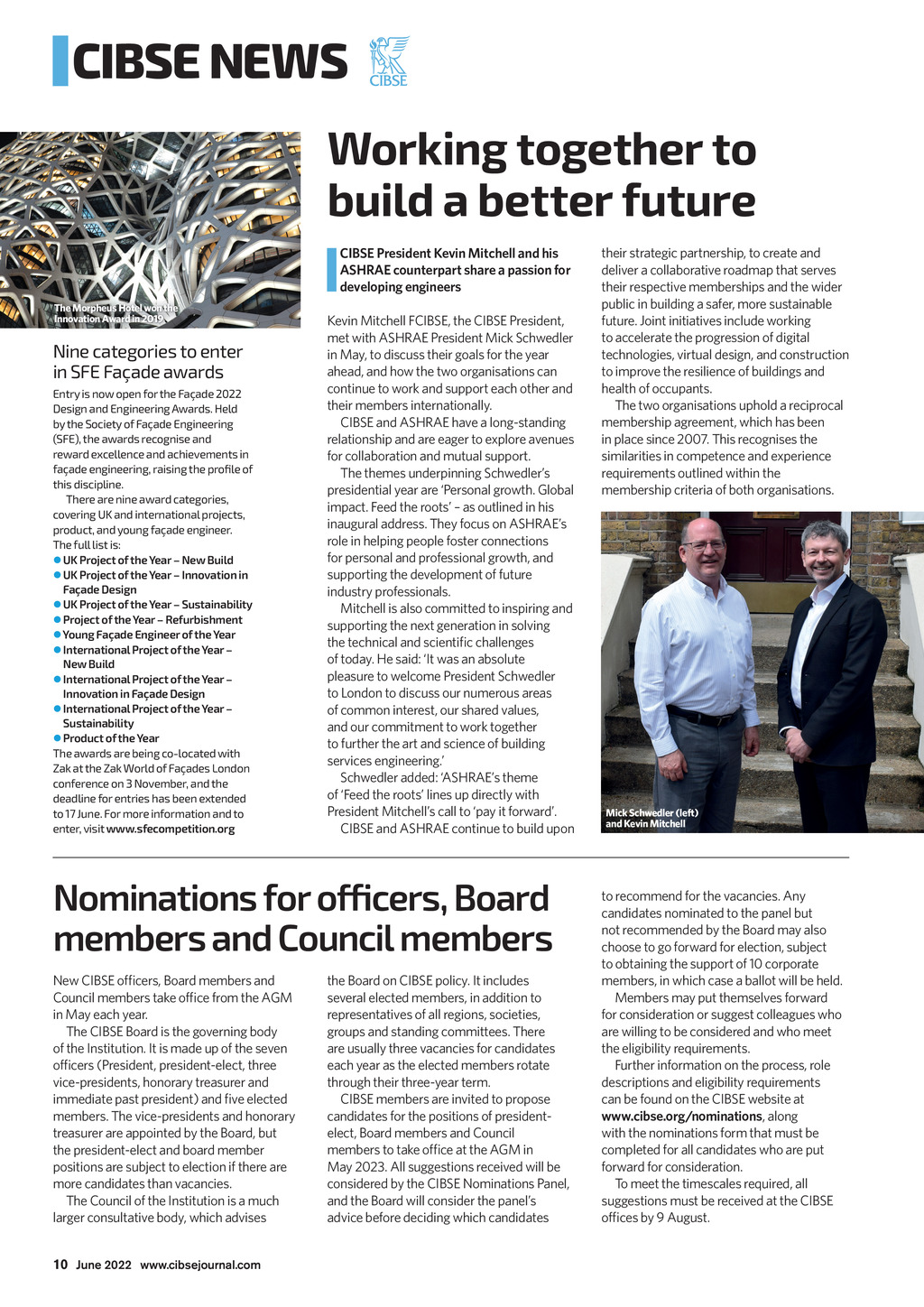 CIBSE NEWS Working together to build a better future CIBSE President Kevin Mitchell and his ASHRAE counterpart share a passion for developing engineers The Morpheus Hotel won the Innovation Award in 2019 Nine categories to enter in SFE Faade awards Entry is now open for the Faade 2022 Design and Engineering Awards. Held by the Society of Faade Engineering (SFE), the awards recognise and reward excellence and achievements in faade engineering, raising the profile of this discipline. There are nine award categories, covering UK and international projects, product, and young faade engineer. The full list is: UK Project of the Year New Build UK Project of the Year Innovation in Faade Design UK Project of the Year Sustainability Project of the Year Refurbishment Young Faade Engineer of the Year International Project of the Year New Build International Project of the Year Innovation in Faade Design International Project of the Year Sustainability Product of the Year The awards are being co-located with Zak at the Zak World of Faades London conference on 3 November, and the deadline for entries has been extended to 17 June. For more information and to enter, visit www.sfecompetition.org Kevin Mitchell FCIBSE, the CIBSE President, met with ASHRAE President Mick Schwedler in May, to discuss their goals for the year ahead, and how the two organisations can continue to work and support each other and their members internationally. CIBSE and ASHRAE have a long-standing relationship and are eager to explore avenues for collaboration and mutual support. The themes underpinning Schwedlers presidential year are Personal growth. Global impact. Feed the roots as outlined in his inaugural address. They focus on ASHRAEs role in helping people foster connections for personal and professional growth, and supporting the development of future industry professionals. Mitchell is also committed to inspiring and supporting the next generation in solving the technical and scientic challenges of today. He said: It was an absolute pleasure to welcome President Schwedler to London to discuss our numerous areas of common interest, our shared values, and our commitment to work together to further the art and science of building services engineering. Schwedler added: ASHRAEs theme of Feed the roots lines up directly with President Mitchells call to pay it forward. CIBSE and ASHRAE continue to build upon Nominations for officers, Board members and Council members New CIBSE ofcers, Board members and Council members take ofce from the AGM in May each year. The CIBSE Board is the governing body of the Institution. It is made up of the seven ofcers (President, president-elect, three vice-presidents, honorary treasurer and immediate past president) and ve elected members. The vice-presidents and honorary treasurer are appointed by the Board, but the president-elect and board member positions are subject to election if there are more candidates than vacancies. The Council of the Institution is a much larger consultative body, which advises the Board on CIBSE policy. It includes several elected members, in addition to representatives of all regions, societies, groups and standing committees. There are usually three vacancies for candidates each year as the elected members rotate through their three-year term. CIBSE members are invited to propose candidates for the positions of presidentelect, Board members and Council members to take ofce at the AGM in May 2023. All suggestions received will be considered by the CIBSE Nominations Panel, and the Board will consider the panels advice before deciding which candidates their strategic partnership, to create and deliver a collaborative roadmap that serves their respective memberships and the wider public in building a safer, more sustainable future. Joint initiatives include working to accelerate the progression of digital technologies, virtual design, and construction to improve the resilience of buildings and health of occupants. The two organisations uphold a reciprocal membership agreement, which has been in place since 2007. This recognises the similarities in competence and experience requirements outlined within the membership criteria of both organisations. Mick Schwedler (left) and Kevin Mitchell to recommend for the vacancies. Any candidates nominated to the panel but not recommended by the Board may also choose to go forward for election, subject to obtaining the support of 10 corporate members, in which case a ballot will be held. Members may put themselves forward for consideration or suggest colleagues who are willing to be considered and who meet the eligibility requirements. Further information on the process, role descriptions and eligibility requirements can be found on the CIBSE website at www.cibse.org/nominations, along with the nominations form that must be completed for all candidates who are put forward for consideration. To meet the timescales required, all suggestions must be received at the CIBSE ofces by 9 August. 10 June 2022 www.cibsejournal.com CIBSE June 22 pp10-12 CIBSE News.indd 10 27/05/2022 18:06