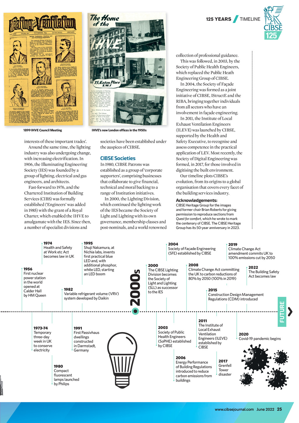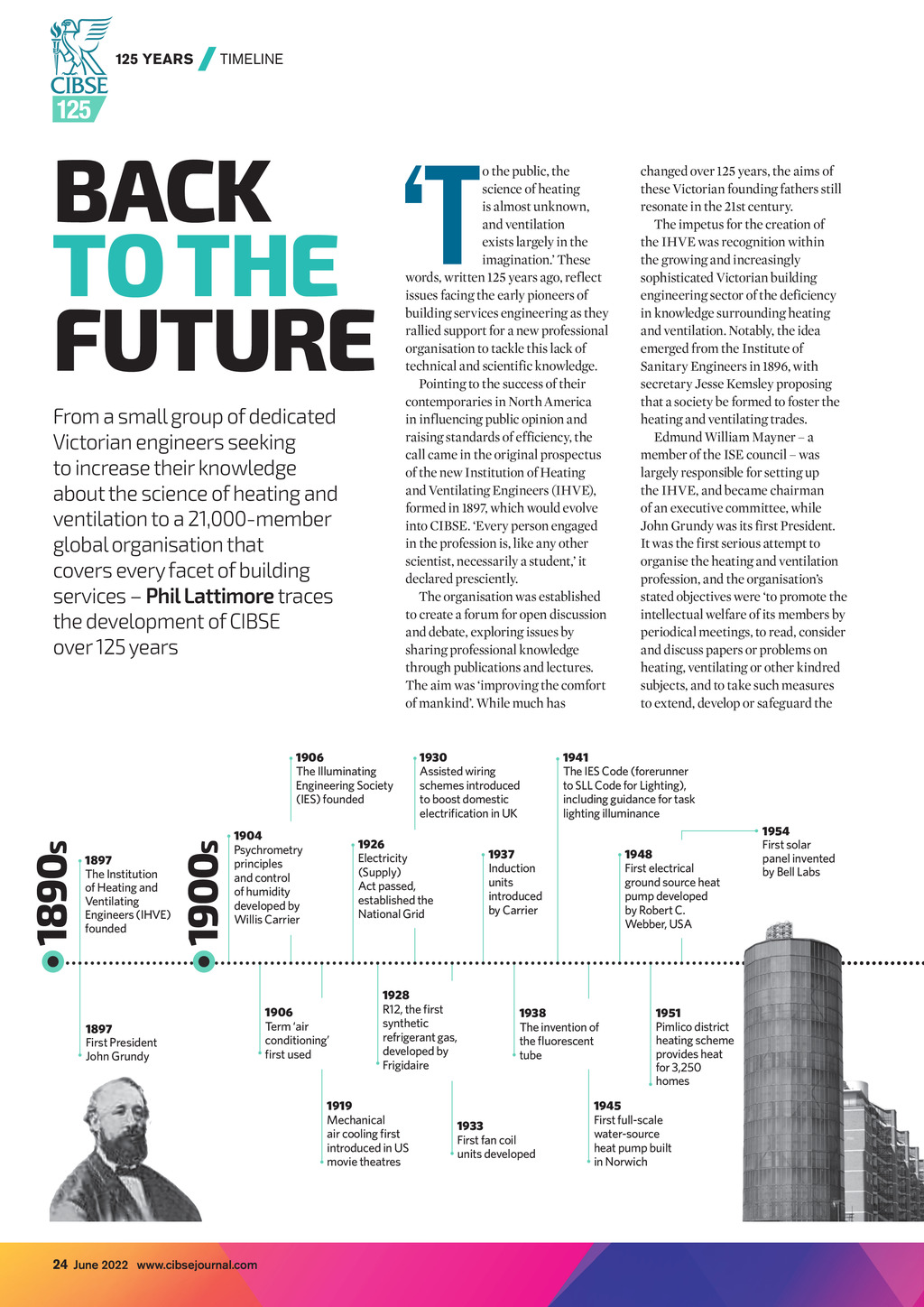 125 YEARS | TIMELINE BACK T TO THE FUTURE o the public, the science of heating is almost unknown, and ventilation exists largely in the imagination. These words, written 125 years ago, reflect issues facing the early pioneers of building services engineering as they rallied support for a new professional organisation to tackle this lack of technical and scientific knowledge. Pointing to the success of their contemporaries in North America in influencing public opinion and raising standards of efficiency, the call came in the original prospectus of the new Institution of Heating and Ventilating Engineers (IHVE), formed in 1897, which would evolve into CIBSE. Every person engaged in the profession is, like any other scientist, necessarily a student, it declared presciently. The organisation was established to create a forum for open discussion and debate, exploring issues by sharing professional knowledge through publications and lectures. The aim was improving the comfort of mankind. While much has From a small group of dedicated Victorian engineers seeking to increase their knowledge about the science of heating and ventilation to a 21,000-member global organisation that covers every facet of building services Phil Lattimore traces the development of CIBSE over 125 years 1897 The Institution of Heating and Ventilating Engineers (IHVE) founded 1900S 1890S 1906 The Illuminating Engineering Society (IES) founded 1904 Psychrometry principles and control of humidity developed by Willis Carrier 1897 First President John Grundy 1930 Assisted wiring schemes introduced to boost domestic electrication in UK 1926 Electricity (Supply) Act passed, established the National Grid 1906 Term air conditioning rst used 1919 Mechanical air cooling rst introduced in US movie theatres 1941 The IES Code (forerunner to SLL Code for Lighting), including guidance for task lighting illuminance 1937 Induction units introduced by Carrier 1928 R12, the rst synthetic refrigerant gas, developed by Frigidaire 1948 First electrical ground source heat pump developed by Robert C. Webber, USA 1938 The invention of the uorescent tube 1933 First fan coil units developed changed over 125 years, the aims of these Victorian founding fathers still resonate in the 21st century. The impetus for the creation of the IHVE was recognition within the growing and increasingly sophisticated Victorian building engineering sector of the deficiency in knowledge surrounding heating and ventilation. Notably, the idea emerged from the Institute of Sanitary Engineers in 1896, with secretary Jesse Kemsley proposing that a society be formed to foster the heating and ventilating trades. Edmund William Mayner a member of the ISE council was largely responsible for setting up the IHVE, and became chairman of an executive committee, while John Grundy was its first President. It was the first serious attempt to organise the heating and ventilation profession, and the organisations stated objectives were to promote the intellectual welfare of its members by periodical meetings, to read, consider and discuss papers or problems on heating, ventilating or other kindred subjects, and to take such measures to extend, develop or safeguard the 1954 First solar panel invented by Bell Labs 1951 Pimlico district heating scheme provides heat for 3,250 homes 1945 First full-scale water-source heat pump built in Norwich 24 June 2022 www.cibsejournal.com CIBSE June 22 pp24-26 CIBSE Timeline.indd 24 27/05/2022 14:56