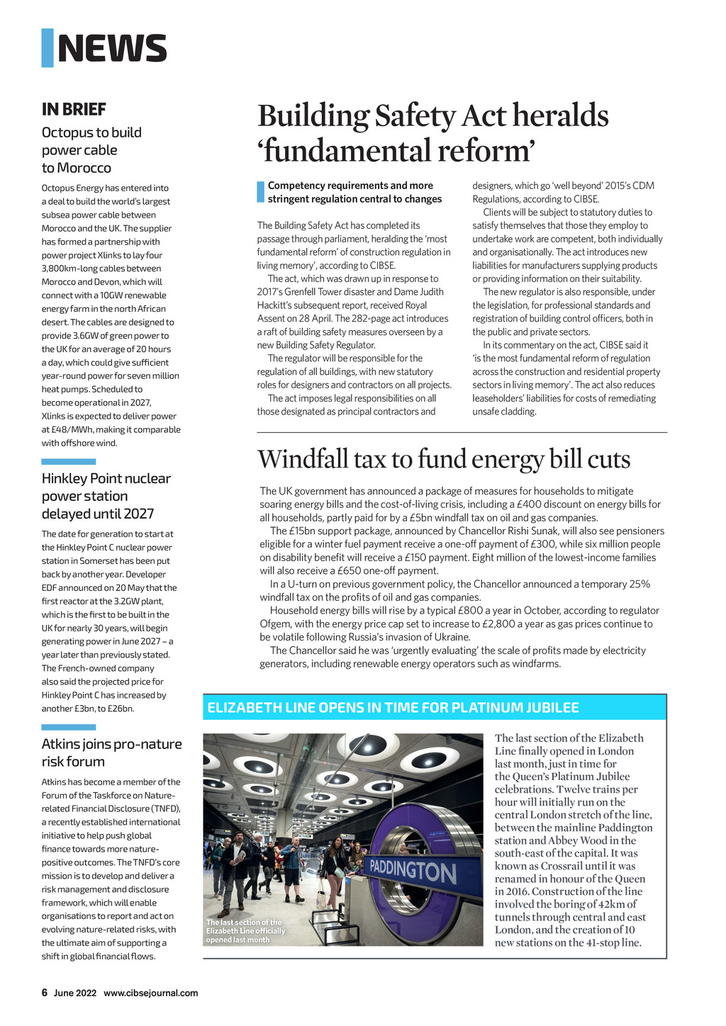 EWS IN BRIEF Octopus to build power cable to Morocco Octopus Energy has entered into a deal to build the worlds largest subsea power cable between Morocco and the UK. The supplier has formed a partnership with power project Xlinks to lay four 3,800km-long cables between Morocco and Devon, which will connect with a 10GW renewable energy farm in the north African desert. The cables are designed to provide 3.6GW of green power to the UK for an average of 20 hours a day, which could give sufficient year-round power for seven million heat pumps. Scheduled to become operational in 2027, Xlinks is expected to deliver power at 48/MWh, making it comparable with offshore wind. Hinkley Point nuclear power station delayed until 2027 The date for generation to start at the Hinkley Point C nuclear power station in Somerset has been put back by another year. Developer EDF announced on 20 May that the first reactor at the 3.2GW plant, which is the first to be built in the UK for nearly 30 years, will begin generating power in June 2027 a year later than previously stated. The French-owned company also said the projected price for Hinkley Point C has increased by another 3bn, to 26bn. Building Safety Act heralds fundamental reform Competency requirements and more stringent regulation central to changes The Building Safety Act has completed its passage through parliament, heralding the most fundamental reform of construction regulation in living memory, according to CIBSE. The act, which was drawn up in response to 2017s Grenfell Tower disaster and Dame Judith Hackitts subsequent report, received Royal Assent on 28 April. The 282-page act introduces a raft of building safety measures overseen by a new Building Safety Regulator. The regulator will be responsible for the regulation of all buildings, with new statutory roles for designers and contractors on all projects. The act imposes legal responsibilities on all those designated as principal contractors and Windfall tax to fund energy bill cuts The UK government has announced a package of measures for households to mitigate soaring energy bills and the cost-of-living crisis, including a 400 discount on energy bills for all households, partly paid for by a 5bn windfall tax on oil and gas companies. The 15bn support package, announced by Chancellor Rishi Sunak, will also see pensioners eligible for a winter fuel payment receive a one-off payment of 300, while six million people on disability benefit will receive a 150 payment. Eight million of the lowest-income families will also receive a 650 one-off payment. In a U-turn on previous government policy, the Chancellor announced a temporary 25% windfall tax on the profits of oil and gas companies. Household energy bills will rise by a typical 800 a year in October, according to regulator Ofgem, with the energy price cap set to increase to 2,800 a year as gas prices continue to be volatile following Russias invasion of Ukraine. The Chancellor said he was urgently evaluating the scale of profits made by electricity generators, including renewable energy operators such as windfarms. ELIZABETH LINE OPENS IN TIME FOR PLATINUM JUBILEE Atkins joins pro-nature risk forum Atkins has become a member of the Forum of the Taskforce on Naturerelated Financial Disclosure (TNFD), a recently established international initiative to help push global finance towards more naturepositive outcomes. The TNFDs core mission is to develop and deliver a risk management and disclosure framework, which will enable organisations to report and act on evolving nature-related risks, with the ultimate aim of supporting a shift in global financial flows. designers, which go well beyond 2015s CDM Regulations, according to CIBSE. Clients will be subject to statutory duties to satisfy themselves that those they employ to undertake work are competent, both individually and organisationally. The act introduces new liabilities for manufacturers supplying products or providing information on their suitability. The new regulator is also responsible, under the legislation, for professional standards and registration of building control ofcers, both in the public and private sectors. In its commentary on the act, CIBSE said it is the most fundamental reform of regulation across the construction and residential property sectors in living memory. The act also reduces leaseholders liabilities for costs of remediating unsafe cladding. The last section of the Elizabeth Line ofcially opened last month The last section of the Elizabeth Line nally opened in London last month, just in time for the Queens Platinum Jubilee celebrations. Twelve trains per hour will initially run on the central London stretch of the line, between the mainline Paddington station and Abbey Wood in the south-east of the capital. It was known as Crossrail until it was renamed in honour of the Queen in 2016. Construction of the line involved the boring of 42km of tunnels through central and east London, and the creation of 10 new stations on the 41-stop line. 6 June 2022 www.cibsejournal.com CIBSE June 22 pp06 News.indd 6 27/05/2022 13:15