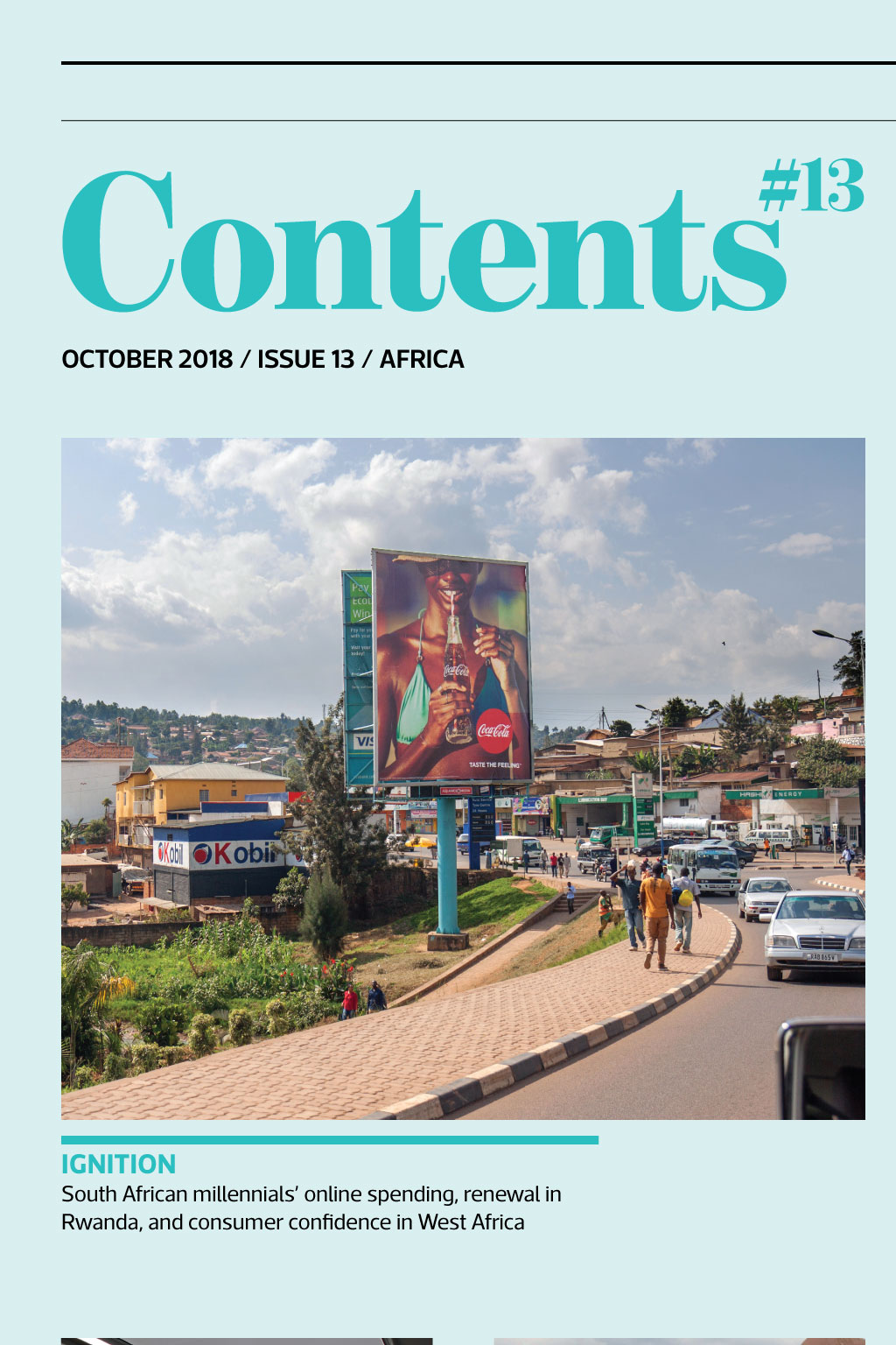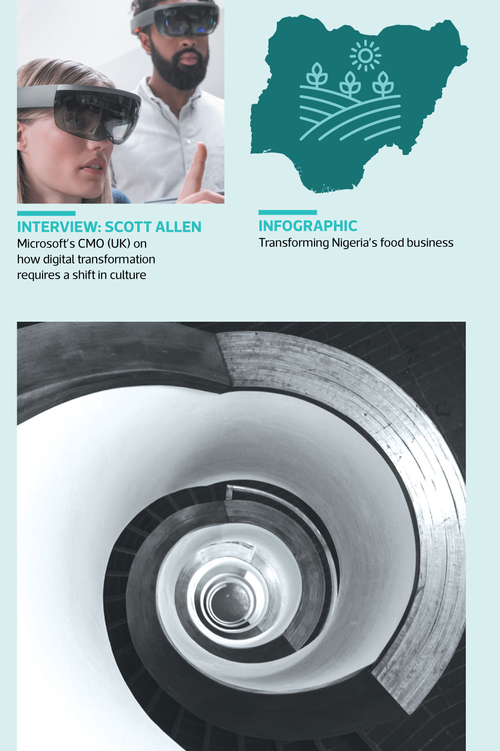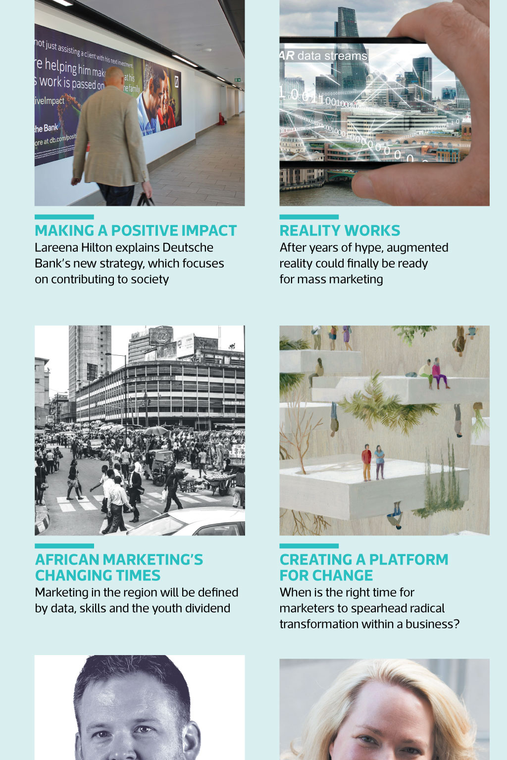 Contents Contents #13 october 2018 / issue 13 / AFRICA IGNITION balance of power South African millennials online spending, renewal in Rwanda, and consumer confidence in West Africa Where does marketings influence lie today, in terms of the Five Ps? Making a positive impact Reality works interview: Scott Allen Lareena Hilton explains Deutsche Banks new strategy, which focuses on contributing to society After years of hype, augmented reality could finally be ready for mass marketing AfricAn marketings changing times creating a Platform for Change Marketing in the region will be defined by data, skills and the youth dividend When is the right time for marketers to spearhead radical transformation within a business? catalyst asks... 5 in Five The new DNA of B2B How marketers are adapting to GDPR, according to Volpas Tricia Fox Stephen Yeo, marketing director of Panasonic B2B, on how the profession can drive major internal change Unlocking the power of marketing The Lyst FFW Three marketers on how to promote business transformation Page Groups Huw Jones and Mark Lawson-Jones on what skills marketers need to succeed Do marketers need to radically shake up their skills? Five experts respond Employee Experience Treat your workforce as you would treat the customer Discussions on how to release marketings full potential at CIMs Digital Summit Microsofts CMO (UK) on how digital transformation requires a shift in culture cim.co.uk/exchange infographic Transforming Nigerias food business