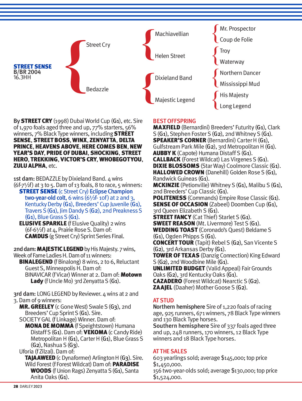 { Street Cry STREET SENSE B/BR 2004 16.3HH Bedazzle { { By STREET CRY (1998) Dubai World Cup (G1), etc. Sire of 1,970 foals aged three and up, 77% starters, 56% winners, 7% Black Type winners, including STREET SENSE, STREET BOSS, WINX, ZENYATTA, DELTA PRINCE, HEAVENS ABOVE, HERE COMES BEN, NEW YEARS DAY, PRIDE OF DUBAI, SHOCKING, STREET HERO, TREKKING, VICTORS CRY, WHOBEGOTYOU, ZULU ALPHA, etc. 1st dam: BEDAZZLE by Dixieland Band. 4 wins (6f-712f) at 3 to 5. Dam of 13 foals, 8 to race, 5 winners: STREET SENSE (c Street Cry) Eclipse Champion two-year-old colt, 6 wins (6f- 10f) at 2 and 3, Kentucky Derby (G1), Breeders Cup Juvenile (G1), Travers S (G1), Jim Dandy S (G2), 2nd Preakness S (G1), Blue Grass S (G1). ELUSIVE SPARKLE (f Elusive Quality) 2 wins (6f-612f) at 4, Prairie Rose S. Dam of: CAMDUS (g Street Cry) Sprint Series Final. 2nd dam: MAJESTIC LEGEND by His Majesty. 7 wins, Week of Fame Ladies H. Dam of 11 winners: BINALEGEND (f Binalong) 8 wins, 2 to 6, Reluctant Guest S, Minneapolis H. Dam of: BINAVICAR (f Vicar) Winner at 2. Dam of: Motown Lady (f Uncle Mo) 3rd Zenyatta S (G1). 3rd dam: LONG LEGEND by Reviewer. 4 wins at 2 and 3. Dam of 9 winners: MR. GREELEY (c Gone West) Swale S (G3), 2nd Breeders Cup Sprint S (G1). Sire. SOCIETY GAL (f Linkage) Winner. Dam of: MONA DE MOMMA (f Speightstown) Humana Distaff S (G1). Dam of: VEKOMA (c Candy Ride) Metropolitan H (G1), Carter H (G1), Blue Grass S (G2), Nashua S (G3). Uforia (f Zilzal). Dam of: TAJAAWEED (c Dynaformer) Arlington H (G3). Sire. Wild Forest (f Forest Wildcat) Dam of: PARADISE WOODS (f Union Rags) Zenyatta S (G1), Santa Anita Oaks (G1). 28 DARLEY 2023 Machiavellian Helen Street Dixieland Band Majestic Legend { { { { Mr. Prospector Coup de Folie Troy Waterway Northern Dancer Mississippi Mud His Majesty Long Legend BEST OFFSPRING MAXFIELD (Bernardini) Breeders Futurity (G1), Clark S (G1), Stephen Foster S (G2), 2nd Whitney S (G1). SPEAKERS CORNER (Bernardini) Carter H (G1), Gulfstream Park Mile (G2), 3rd Metropolitan H (G1). AUBBY K (Capote) Humana Distaff S (G1). CALLBACK (Forest Wildcat) Las Virgenes S (G1). DIXIE BLOSSOMS (Star Way) Coolmore Classic (G1). HALLOWED CROWN (Danehill) Golden Rose S (G1), Randwick Guineas (G1). MCKINZIE (Petionville) Whitney S (G1), Malibu S (G1), 2nd Breeders Cup Classic (G1). POLITENESS (Commands) Empire Rose Classic (G1). SENSE OF OCCASION (Zabeel) Doomben Cup (G1), 3rd Queen Elizabeth S (G1). STREET FANCY (Cat Thief) Starlet S (G1). SWEET REASON (Mt. Livermore) Test S (G1). WEDDING TOAST (Coronados Quest) Beldame S (G1), Ogden Phipps S (G1). CONCERT TOUR (Tapit) Rebel S (G2), San Vicente S (G2), 3rd Arkansas Derby (G1). TOWER OF TEXAS (Danzig Connection) King Edward S (G2), 2nd Woodbine Mile (G1). UNLIMITED BUDGET (Valid Appeal) Fair Grounds Oaks (G2), 3rd Kentucky Oaks (G1). CAZADERO (Forest Wildcat) Nearctic S (G2). ZAAJEL (Daaher) Mother Goose S (G2). AT STUD Northern hemisphere Sire of 1,220 foals of racing age, 925 runners, 671 winners, 78 Black Type winners and 130 Black Type horses. Southern hemisphere Sire of 337 foals aged three and up, 248 runners, 170 winners, 12 Black Type winners and 18 Black Type horses. AT THE SALES 603 yearlings sold; average $145,000; top price $1,450,000. 156 two-year-olds sold; average $130,000; top price $1,524,000.