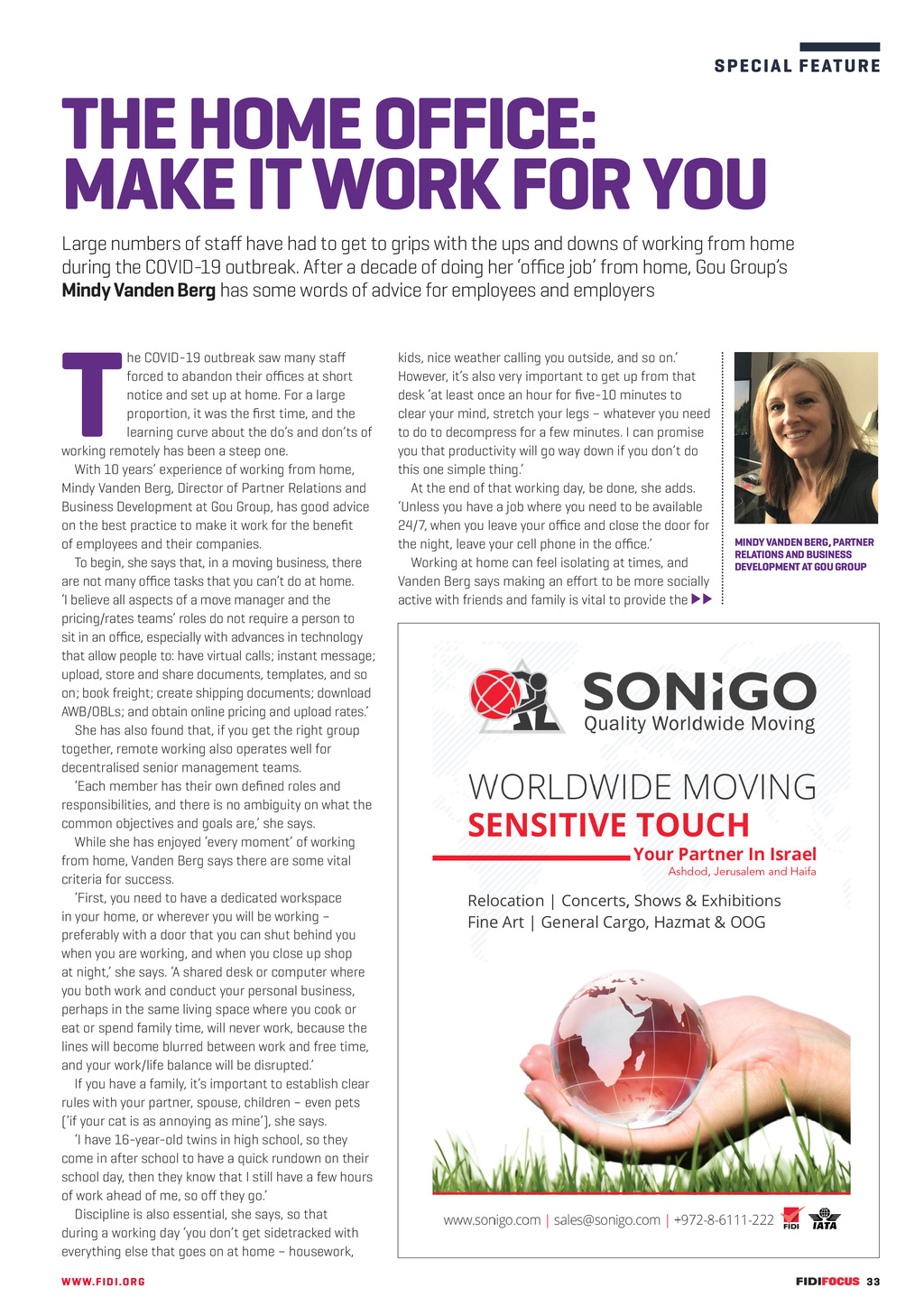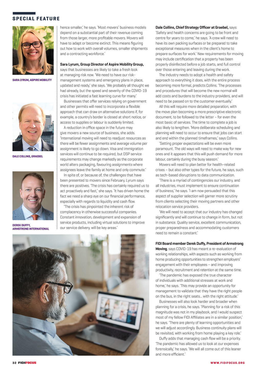 S P E C I A L FE ATUR E hence smaller, he says. Most movers business models depend on a substantial part of their revenue coming from those larger, more profitable movers. Movers will have to adapt or become extinct. This means figuring out how to work with overall volumes, smaller shipments and a contracting workforce. SARA LYRUM, ASPIRE MOBILITY DALE COLLINS, GRAEBEL DEREK DUFFY, ARMSTRONG INTERNATIONAL Sara Lyrum, Group Director of Aspire Mobility Group, says that businesses are likely to take a fresh look at managing risk now. We need to have our riskmanagement systems and emergency plans in place, updated and ready, she says. We probably all thought we had already, but the speed and severity of the COVID-19 crisis has initiated a fast learning curve for many. Businesses that offer services relying on government and other permits will need to incorporate a flexible approach that can draw on alternative solutions if, for example, a countrys border is closed at short notice, or access to supplies or labour is suddenly limited. A reduction in office space in the future may give movers a new source of business, she adds. International moving will need to readjust resources as there will be fewer assignments and average volume per assignment is likely to go down. Visa and immigration services will continue to be required, but DSP service requirements may change markedly as the corporate world alters packaging, favouring assignments where assignees leave the family at home and only commute. In spite of, or because of, the challenges that have been presented to movers since February, Lyrum says there are positives. The crisis has certainly required us to act proactively and fast, she says. It has driven home the fact we need a sharp eye on our financial performance, especially with regards to liquidity and cash flow. The crisis has pinpointed the inherent risk of complacency in otherwise successful companies. Constant innovation, development and expansion of service products, including virtual solutions to improve our service delivery, will be key areas. Dale Collins, Chief Strategy Officer at Graebel, says: Safety and health concerns are going to be front and centre for years to come, he says. A crew will need to have its own packing surfaces or be prepared to take exceptional measures when in the clients home to prepare surfaces for work. New requirements for moving may include certification that a property has been properly disinfected before a job starts, and full control over those entering and leaving during the work. The industry needs to adopt a health and safety approach to everything it does, with the entire process becoming more formal, predicts Collins. The processes and procedures that will become the new normal will add costs and burdens to the industry providers, and will need to be passed on to the customer eventually. All this will require more detailed preparation, with the move plan becoming a more prescriptive electronic document, to be followed to the letter for even the most basic of services. The time to complete a job is also likely to lengthen. More deliberate scheduling and planning will need to occur to ensure that jobs can start and end within the planned timeframes, says Collins. Setting proper expectations will be even more paramount. The old ways will need to make way for new ones and it appears that this will push demand for more labour, certainly during the busy season. Movers will need to plan better for health-related crises but also other types for the future, he says, such as tech-based disruptions to data communication. There is a myriad of contingencies our industry, and all industries, must implement to ensure continuation of business, he says. I am now persuaded that this aspect of supplier selection will garner more scrutiny from clients selecting their moving partners and other relocation service providers. We will need to accept that our industry has changed significantly and will continue to change in form, but not in substance. Quality service, excellent communication, proper preparedness and accommodating customers need to remain a constant. FIDI Board member Derek Duffy, President of Armstrong Moving, says COVID-19 has meant a re-evaluation of working relationships, with aspects such as working from home producing opportunities to strengthen employers engagement with their employees and improving productivity, recruitment and retention at the same time. The pandemic has exposed the true character of individuals with additional stresses at work and home, he says. This may provide an opportunity for management to validate that they have the right people on the bus, in the right seats... with the right attitude. Businesses will also look harder and broader when planning for a crisis, he says. Planning for a risk of this magnitude was not in my playbook, and I would suspect most of my fellow FIDI Affiliates are in a similar position, he says. There are plenty of learning opportunities and we will adjust accordingly. Business continuity plans will be revisited, with working from home playing a key role. Duffy adds that managing cash flow will be a priority. The pandemic has allowed us to look at our expenses forensically, he says. We will all come out of this leaner and more efficient. 32 FF297 JunJul20 pp31-35 Best practice.indd 32 WW W. F I D I FOC U S . OR G 01/06/2020 14:58