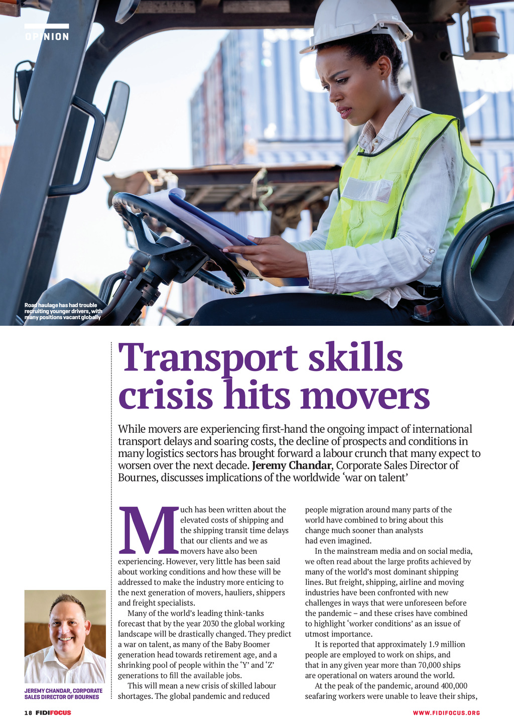 OPINION Road haulage has had trouble recruiting younger drivers, with many positions vacant globally Transport skills crisis hits movers While movers are experiencing first-hand the ongoing impact of international transport delays and soaring costs, the decline of prospects and conditions in many logistics sectors has brought forward a labour crunch that many expect to worsen over the next decade. Jeremy Chandar, Corporate Sales Director of Bournes, discusses implications of the worldwide war on talent M JEREMY CHANDAR, CORPORATE SALES DIRECTOR OF BOURNES 18 FF304 Dec_Jan 22 pp18-19 Opinion.indd 18 uch has been written about the elevated costs of shipping and the shipping transit time delays that our clients and we as movers have also been experiencing. However, very little has been said about working conditions and how these will be addressed to make the industry more enticing to the next generation of movers, hauliers, shippers and freight specialists. Many of the worlds leading think-tanks forecast that by the year 2030 the global working landscape will be drastically changed. They predict a war on talent, as many of the Baby Boomer generation head towards retirement age, and a shrinking pool of people within the Y and Z generations to fill the available jobs. This will mean a new crisis of skilled labour shortages. The global pandemic and reduced people migration around many parts of the world have combined to bring about this change much sooner than analysts had even imagined. In the mainstream media and on social media, we often read about the large profits achieved by many of the worlds most dominant shipping lines. But freight, shipping, airline and moving industries have been confronted with new challenges in ways that were unforeseen before the pandemic and these crises have combined to highlight worker conditions as an issue of utmost importance. It is reported that approximately 1.9 million people are employed to work on ships, and that in any given year more than 70,000 ships are operational on waters around the world. At the peak of the pandemic, around 400,000 seafaring workers were unable to leave their ships, WW W. F I D I FOC U S . OR G 07/12/2021 09:45