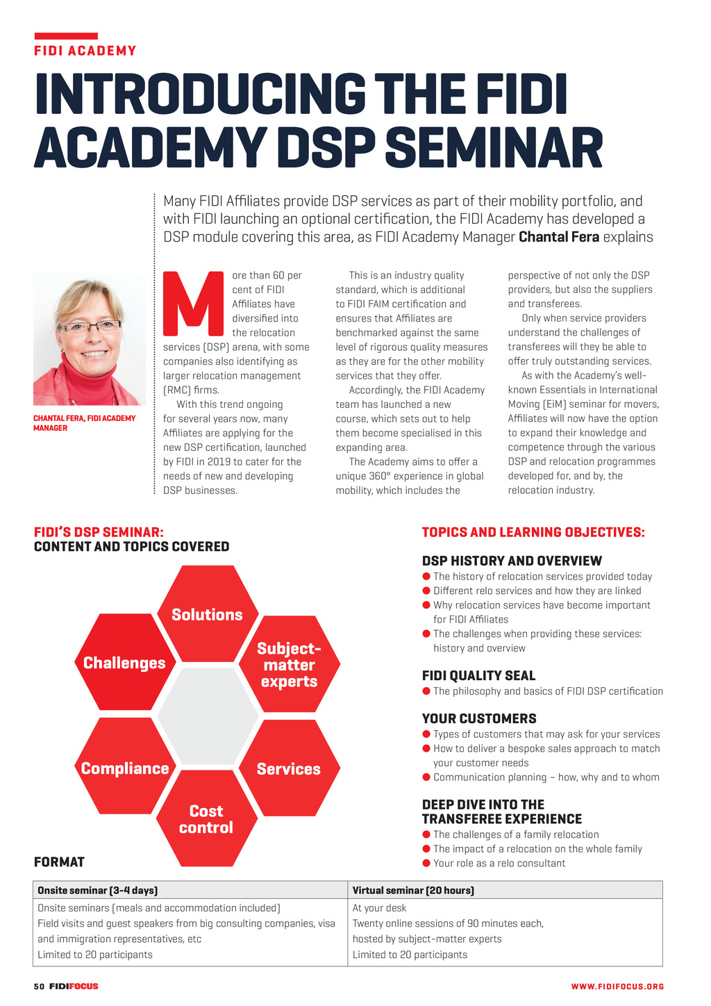 F ID I AC A D E M Y INTRODUCING THE FIDI ACADEMY DSP SEMINAR Many FIDI Affiliates provide DSP services as part of their mobility portfolio, and with FIDI launching an optional certification, the FIDI Academy has developed a DSP module covering this area, as FIDI Academy Manager Chantal Fera explains M CHANTAL FERA, FIDI ACADEMY MANAGER ore than 60 per cent of FIDI Affiliates have diversified into the relocation services (DSP) arena, with some companies also identifying as larger relocation management (RMC) firms. With this trend ongoing for several years now, many Affiliates are applying for the new DSP certification, launched by FIDI in 2019 to cater for the needs of new and developing DSP businesses. FIDIS DSP SEMINAR: CONTENT AND TOPICS COVERED perspective of not only the DSP providers, but also the suppliers and transferees. Only when service providers understand the challenges of transferees will they be able to offer truly outstanding services. As with the Academys wellknown Essentials in International Moving (EiM) seminar for movers, Affiliates will now have the option to expand their knowledge and competence through the various DSP and relocation programmes developed for, and by, the relocation industry. TOPICS AND LEARNING OBJECTIVES: DSP HISTORY AND OVERVIEW Solutions Subjectmatter experts Challenges This is an industry quality standard, which is additional to FIDI FAIM certification and ensures that Affiliates are benchmarked against the same level of rigorous quality measures as they are for the other mobility services that they offer. Accordingly, the FIDI Academy team has launched a new course, which sets out to help them become specialised in this expanding area. The Academy aims to offer a unique 360 experience in global mobility, which includes the l The history of relocation services provided today l Different relo services and how they are linked l Why relocation services have become important for FIDI Affiliates l The challenges when providing these services: history and overview FIDI QUALITY SEAL l The philosophy and basics of FIDI DSP certification YOUR CUSTOMERS Compliance Services Cost control FORMAT l Types of customers that may ask for your services l How to deliver a bespoke sales approach to match your customer needs l Communication planning how, why and to whom DEEP DIVE INTO THE TRANSFEREE EXPERIENCE l The challenges of a family relocation l The impact of a relocation on the whole family l Your role as a relo consultant Onsite seminar (3-4 days) Virtual seminar (20 hours) Onsite seminars (meals and accommodation included) Field visits and guest speakers from big consulting companies, visa and immigration representatives, etc Limited to 20 participants At your desk Twenty online sessions of 90 minutes each, hosted by subject-matter experts Limited to 20 participants 50 FF304 Dec_Jan 22 pp50-51 Academy.indd 50 WW W. F I D I FOC U S . OR G 07/12/2021 10:01