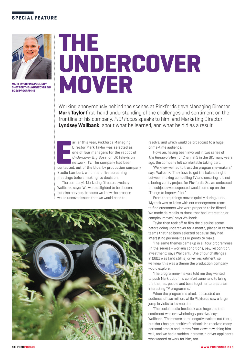 S P E C I A L FE ATUR E THE UNDERCOVER MOVER MARK TAYLOR IN A PUBLICITY SHOT FOR THE UNDERCOVER BIG BOSS PROGRAMME Working anonymously behind the scenes at Pickfords gave Managing Director Mark Taylor first-hand understanding of the challenges and sentiment on the frontline of his company. FIDI Focus speaks to him, and Marketing Director Lyndsey Wallbank, about what he learned, and what he did as a result E arlier this year, Pickfords Managing Director Mark Taylor was selected as one of four managers for the reboot of Undercover Big Boss, on UK television network ITV. The company had been contacted, out of the blue, by production company Studio Lambert, which held five screening meetings before making its decision. The companys Marketing Director, Lyndsey Wallbank, says: We were delighted to be chosen, but also nervous, because we knew the process would uncover issues that we would need to 64 FF304 Dec_Jan 22 pp64-65 Pickfords.indd 64 resolve, and which would be broadcast to a huge prime-time audience. However, having been involved in two series of The Removal Men, for Channel 5 in the UK, many years ago, the company felt comfortable taking part. We knew we had to trust the programme-makers, says Wallbank. They have to get the balance right between making compelling TV and ensuring it is not a boring vanity project for Pickfords. So, we embraced the subjects we suspected would come up on the Things to improve list. From there, things moved quickly during June. My task was to liaise with our management team to find customers who were prepared to be filmed. We made daily calls to those that had interesting or complex moves, says Wallbank. Taylor then took off to film the disguise scene, before going undercover for a month, placed in certain teams that had been selected because they had interesting personalities or points to make. The same themes came up in all four programmes [in the series] working conditions, pay, recognition, investment, says Wallbank. One of our challenges in 2021 was (and still is) driver recruitment, so we knew this was a theme the production company would explore. The programme-makers told me they wanted to push Mark out of his comfort zone, and to bring the themes, people and boss together to create an interesting TV programme. When the programme aired, it attracted an audience of two million, while Pickfords saw a large jump in visits to its website. The social media feedback was huge and the sentiment was overwhelmingly positive, says Wallbank. There were some negative voices out there, but Mark has got positive feedback. He received many personal emails and letters from viewers wishing him well, and we had a sudden increase in driver applicants who wanted to work for him, too. WW W. F I D I FOC U S . OR G 07/12/2021 16:08