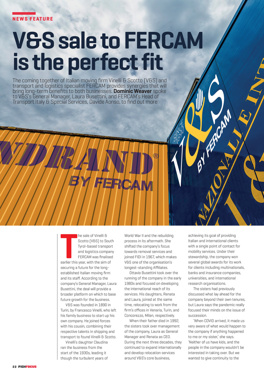 NE WS FE AT UR E V&S sale to FERCAM is the perfect fit The coming together of Italian moving firm Vinelli & Scotto (V&S) and transport and logistics specialist FERCAM provides synergies that will bring long-term benefits to both businesses. Dominic Weaver spoke to V&Ss General Manager, Laura Busettini, and FERCAMs Head of Transport Italy & Special Services, Davide Aonso, to find out more T he sale of Vinelli & Scotto (V&S) to South Tyrol-based transport and logistics company FERCAM was finalised earlier this year, with the aim of securing a future for the longestablished Italian moving firm and its staff. According to the companys General Manager, Laura Busettini, the deal will provide a broader platform on which to base future growth for the business. V&S was founded in 1890 in Turin, by Francesco Vinelli, who left his family business to start up his own company. He joined forces with his cousin, combining their respective talents in shipping and transport to found Vinelli & Scotto. Vinellis daughter Claudina ran the business from the start of the 1930s, leading it though the turbulent years of World War II and the rebuilding process in its aftermath. She shifted the companys focus towards removal services and joined FIDI in 1967, which makes V&S one of the organisations longest-standing Affiliates. Ottavio Busettini took over the running of the company in the early 1980s and focused on developing the international reach of its services. His daughters, Renata and Laura, joined at the same time, relocating to work from the firms offices in Venaria, Turin, and Concorezzo, Milan, respectively. When their father died in 1992, the sisters took over management of the company, Laura as General Manager and Renata as CEO. During the next three decades, they continued to expand internationally and develop relocation services around V&Ss core business, achieving its goal of providing Italian and international clients with a single point of contact for mobility services. Under their stewardship, the company won several global awards for its work for clients including multinationals, banks and insurance companies, universities, and international research organisations. The sisters had previously discussed what lay ahead for the company beyond their own tenures, but Laura says the pandemic really focused their minds on the issue of succession. When COVID arrived, it made us very aware of what would happen to the company if anything happened to me or my sister, she says. Neither of us have kids, and the people in the company wouldnt be interested in taking over. But we wanted to give continuity to the 22 FF308 Dec-Jan 23 pp22-23 V&S News feature.indd 22 05/12/2022 16:50