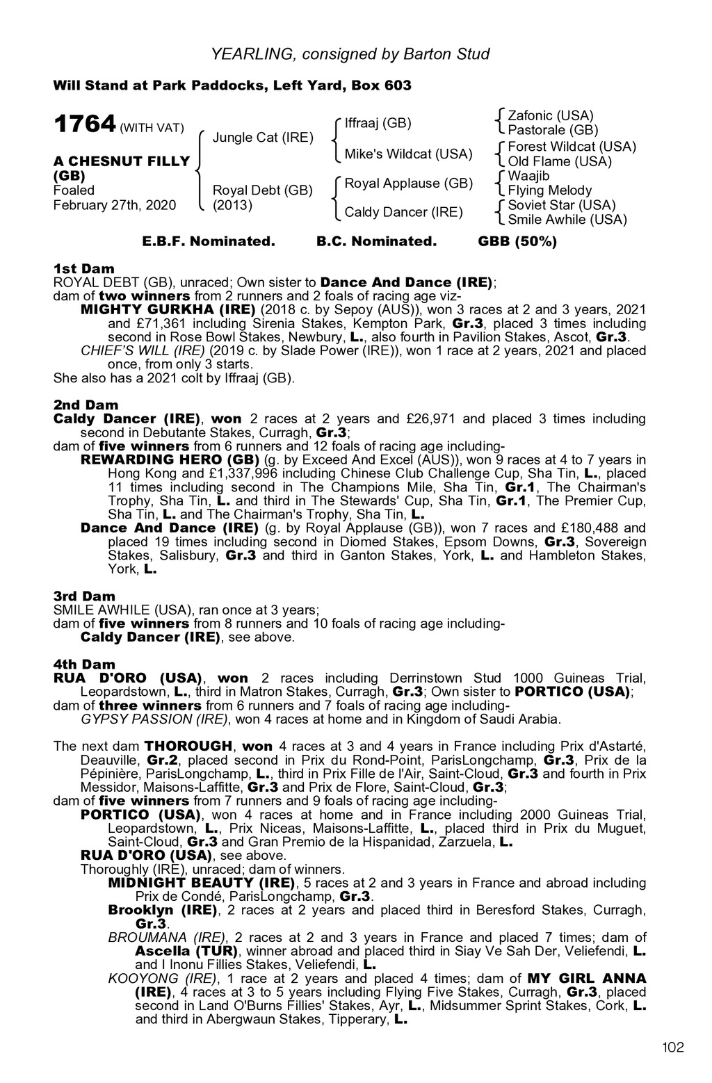 YEARLING, consigned by Barton Stud Will Stand at Park Paddocks, Left Yard, Box 603 1764 (WITH VAT) A CHESNUT FILLY (GB) Foaled February 27th, 2020 Jungle Cat (IRE) Royal Debt (GB) (2013) E.B.F. Nominated. Zafonic (USA) Pastorale (GB) Forest Wildcat (USA) Old Flame (USA) Waajib Flying Melody Soviet Star (USA) Smile Awhile (USA) Iffraaj (GB) Mike s Wildcat (USA) Royal Applause (GB) Caldy Dancer (IRE) B.C. Nominated. GBB (50%) 1st Dam ROYAL DEBT (GB), unraced; Own sister to Dance And Dance (IRE); dam of two winners from 2 runners and 2 foals of racing age vizMIGHTY GURKHA (IRE) (2018 c. by Sepoy (AUS)), won 3 races at 2 and 3 years, 2021 and 71,361 including Sirenia Stakes, Kempton Park, Gr.3, placed 3 times including second in Rose Bowl Stakes, Newbury, L., also fourth in Pavilion Stakes, Ascot, Gr.3. CHIEFS WILL (IRE) (2019 c. by Slade Power (IRE)), won 1 race at 2 years, 2021 and placed once, from only 3 starts. She also has a 2021 colt by Iffraaj (GB). 2nd Dam Caldy Dancer (IRE), won 2 races at 2 years and 26,971 and placed 3 times including second in Debutante Stakes, Curragh, Gr.3; dam of five winners from 6 runners and 12 foals of racing age includingREWARDING HERO (GB) (g. by Exceed And Excel (AUS)), won 9 races at 4 to 7 years in Hong Kong and 1,337,996 including Chinese Club Challenge Cup, Sha Tin, L., placed 11 times including second in The Champions Mile, Sha Tin, Gr.1, The Chairman s Trophy, Sha Tin, L. and third in The Stewards Cup, Sha Tin, Gr.1, The Premier Cup, Sha Tin, L. and The Chairman s Trophy, Sha Tin, L. Dance And Dance (IRE) (g. by Royal Applause (GB)), won 7 races and 180,488 and placed 19 times including second in Diomed Stakes, Epsom Downs, Gr.3, Sovereign Stakes, Salisbury, Gr.3 and third in Ganton Stakes, York, L. and Hambleton Stakes, York, L. 3rd Dam SMILE AWHILE (USA), ran once at 3 years; dam of five winners from 8 runners and 10 foals of racing age includingCaldy Dancer (IRE), see above. 4th Dam RUA D ORO (USA), won 2 races including Derrinstown Stud 1000 Guineas Trial, Leopardstown, L., third in Matron Stakes, Curragh, Gr.3; Own sister to PORTICO (USA); dam of three winners from 6 runners and 7 foals of racing age includingGYPSY PASSION (IRE), won 4 races at home and in Kingdom of Saudi Arabia. The next dam THOROUGH, won 4 races at 3 and 4 years in France including Prix d Astart, Deauville, Gr.2, placed second in Prix du Rond-Point, ParisLongchamp, Gr.3, Prix de la Ppinire, ParisLongchamp, L., third in Prix Fille de l Air, Saint-Cloud, Gr.3 and fourth in Prix Messidor, Maisons-Laffitte, Gr.3 and Prix de Flore, Saint-Cloud, Gr.3; dam of five winners from 7 runners and 9 foals of racing age includingPORTICO (USA), won 4 races at home and in France including 2000 Guineas Trial, Leopardstown, L., Prix Niceas, Maisons-Laffitte, L., placed third in Prix du Muguet, Saint-Cloud, Gr.3 and Gran Premio de la Hispanidad, Zarzuela, L. RUA D ORO (USA), see above. Thoroughly (IRE), unraced; dam of winners. MIDNIGHT BEAUTY (IRE), 5 races at 2 and 3 years in France and abroad including Prix de Cond, ParisLongchamp, Gr.3. Brooklyn (IRE), 2 races at 2 years and placed third in Beresford Stakes, Curragh, Gr.3. BROUMANA (IRE), 2 races at 2 and 3 years in France and placed 7 times; dam of Ascella (TUR), winner abroad and placed third in Siay Ve Sah Der, Veliefendi, L. and I Inonu Fillies Stakes, Veliefendi, L. KOOYONG (IRE), 1 race at 2 years and placed 4 times; dam of MY GIRL ANNA (IRE), 4 races at 3 to 5 years including Flying Five Stakes, Curragh, Gr.3, placed second in Land O Burns Fillies Stakes, Ayr, L., Midsummer Sprint Stakes, Cork, L. and third in Abergwaun Stakes, Tipperary, L. 102